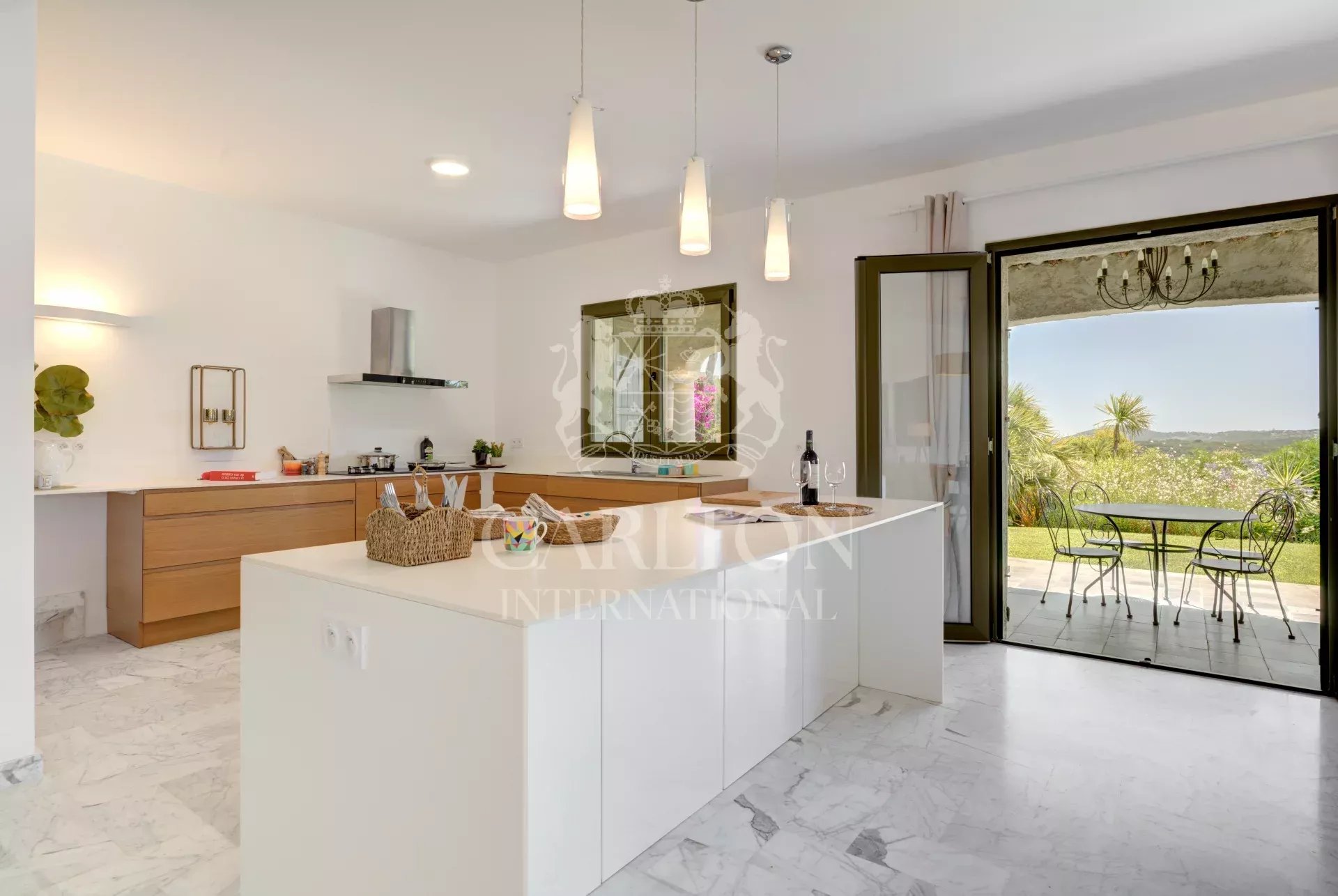 Dans quartier très résidentiel au calme en position dominante avec une belle vue dégagée collines et aperçu mer, spacieuse et lumineuse villa récemment rénovée bénéficiant de généreux volumes.