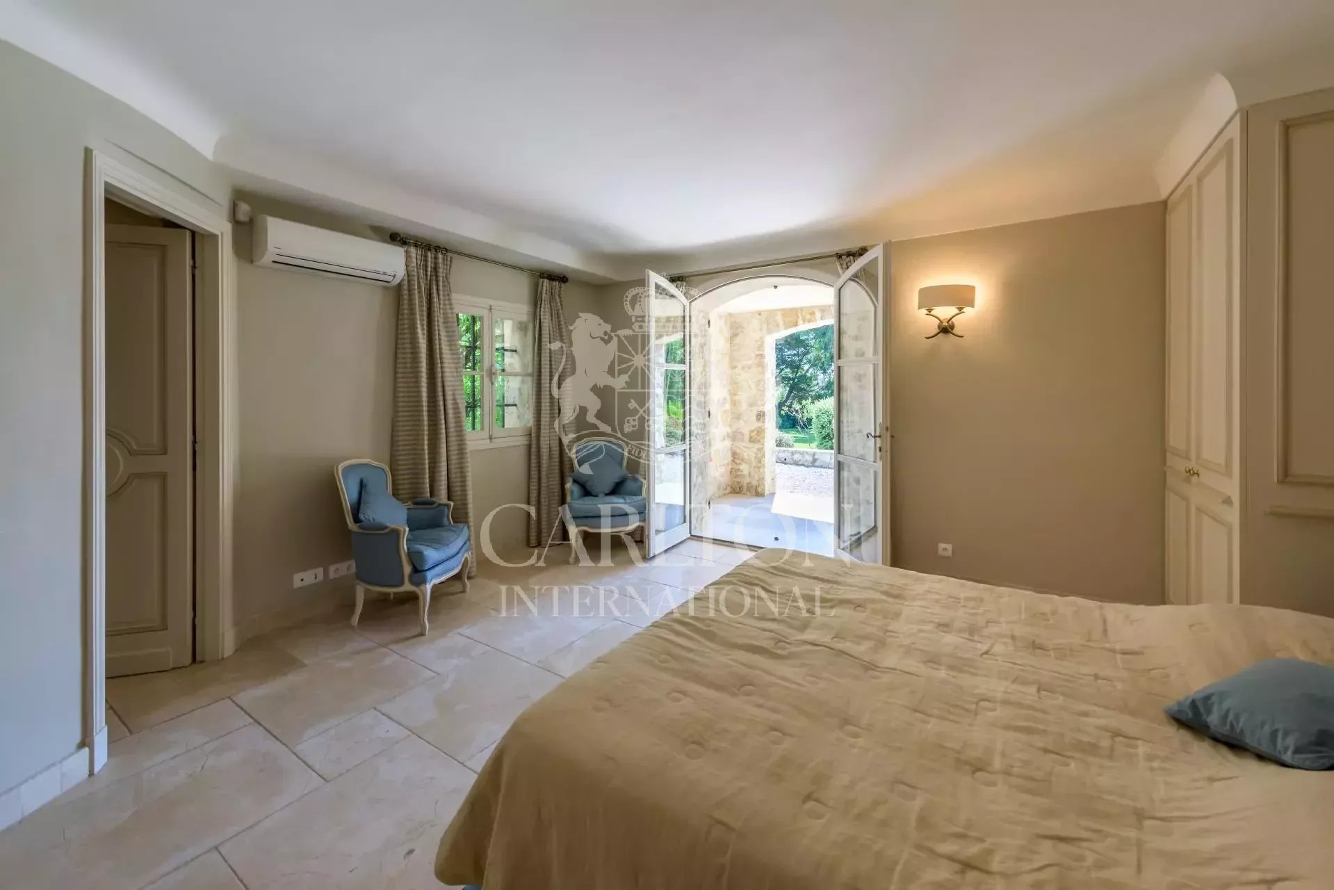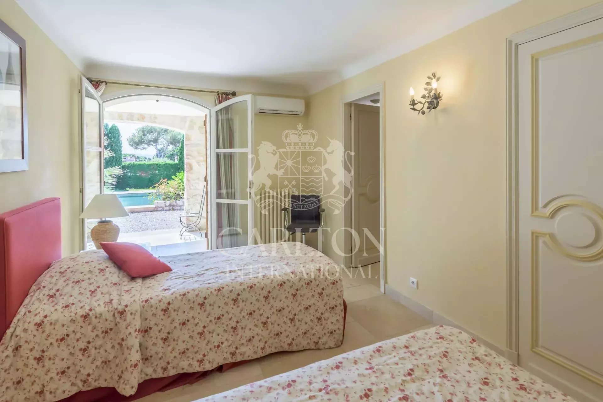 – Chambre double avec salle de bain ensuite. Cette chambre ouvre sur une terrasse qui mène à la piscine.