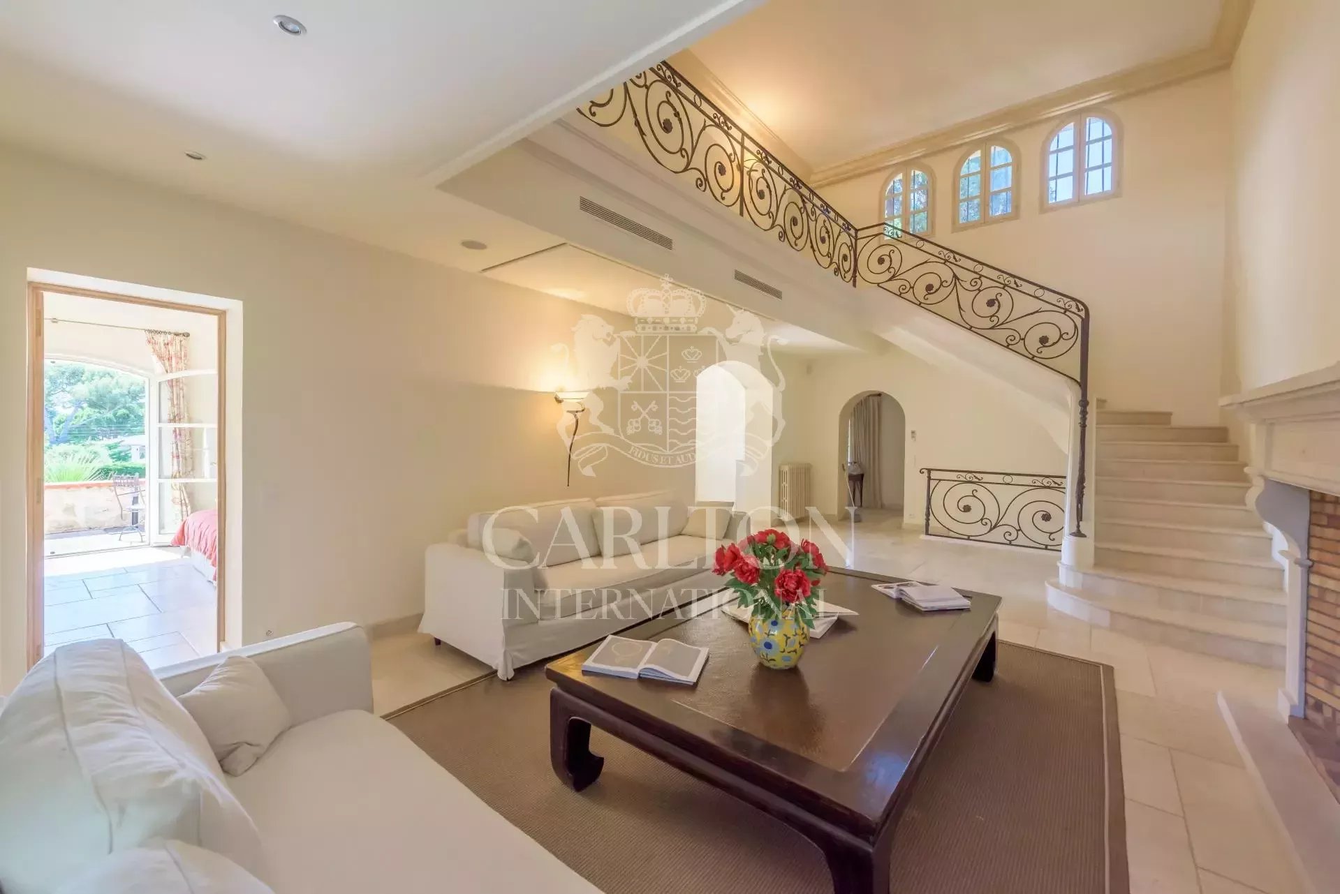 – Grand salon avec cheminée ouvrant sur une terrasse avec coin repas.