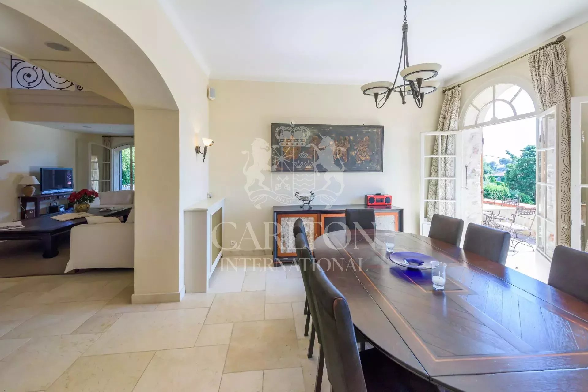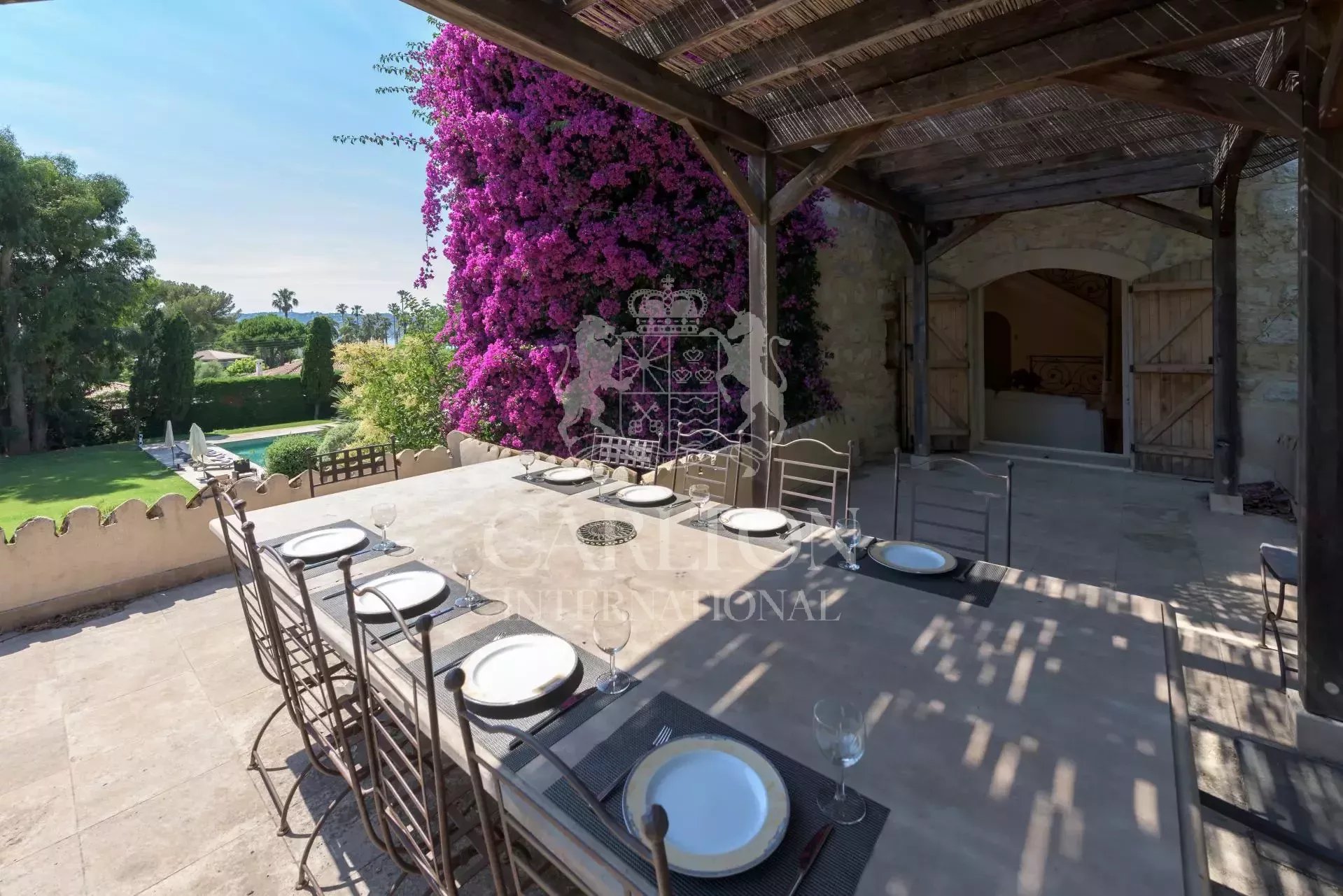 – Salle à manger ouvrant une terrasse faisant face à la piscine et au jardin.
