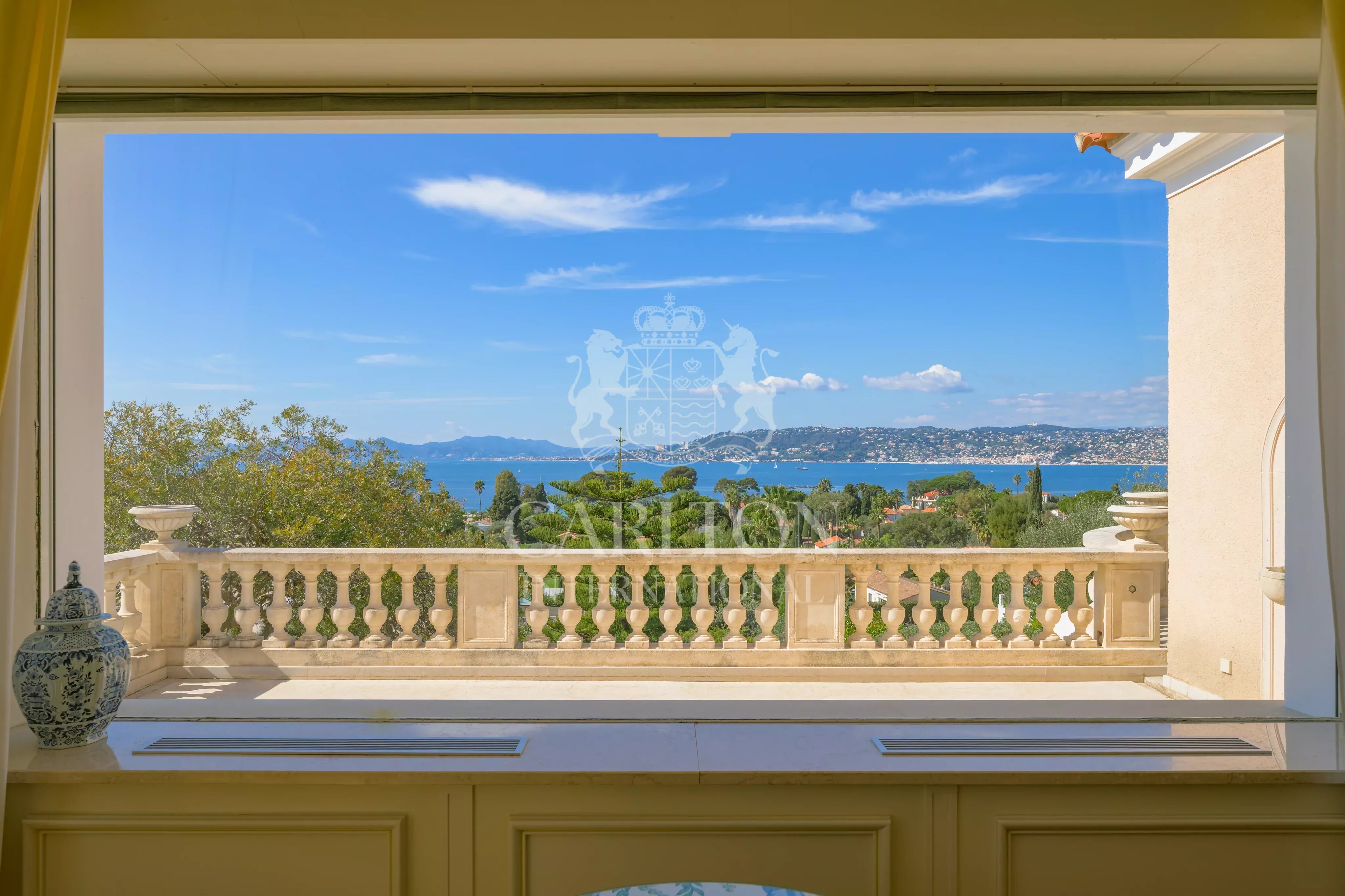 Idéalement située en position dominante au cœur du Cap d’Antibes, cette propriété d’exception dévoile une vue panoramique spectaculaire sur la Méditerranée, les Îles de Lérins et les reliefs de l’Estérel.