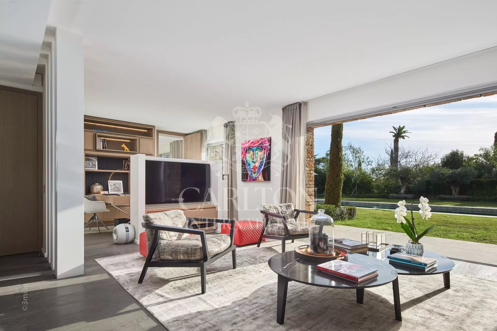 – Pièce de réception composée d’un salon avec télévision, salle à manger et cuisine ouverte avec îlot central entièrement équipée (four à vapeur, four traditionnel, réchauffe plat… GAGGENAU), le tout ouvrant sur une terrasse d’environ 70m² avec baies vitrées à galandage avec une salle à manger d’été et barbecue au gaz. La vue est dégagée sur les collines et le phare de la Garoupe, aperçu mer