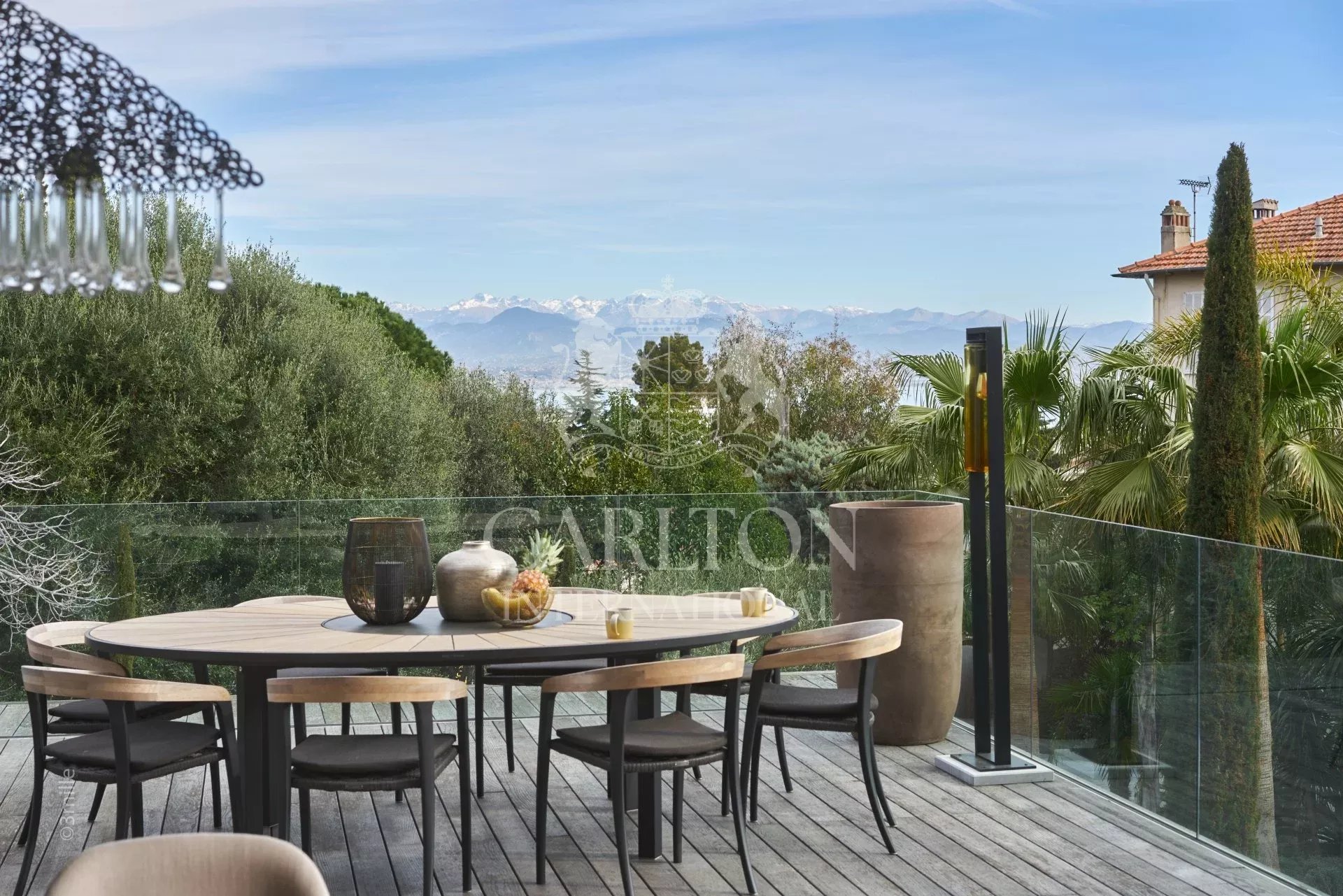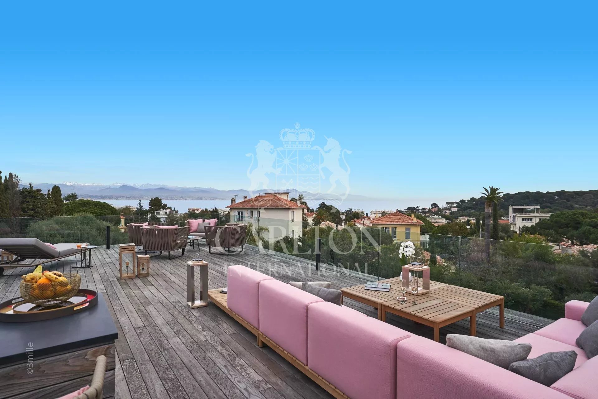 Toit terrasse aménagé bénéficiant d’une vue imprenable sur la mer et les montagnes, le fort Carré mais aussi sur le phare de la Garoupe.