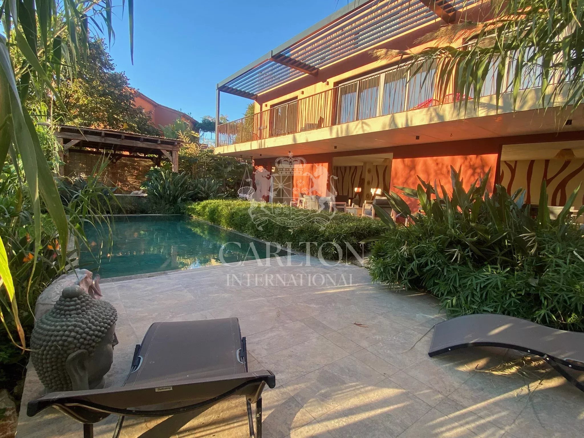 Le rez-de-jardin accueille un espace de vie extérieur couvert, comprenant un salon et une cuisine d’été, ouvrant directement sur une piscine chauffée et un jardin paysager. L’aménagement extérieur, pensé dans un esprit végétal et structuré, offre un cadre paisible et agréable, en parfaite harmonie avec la nature environnante.