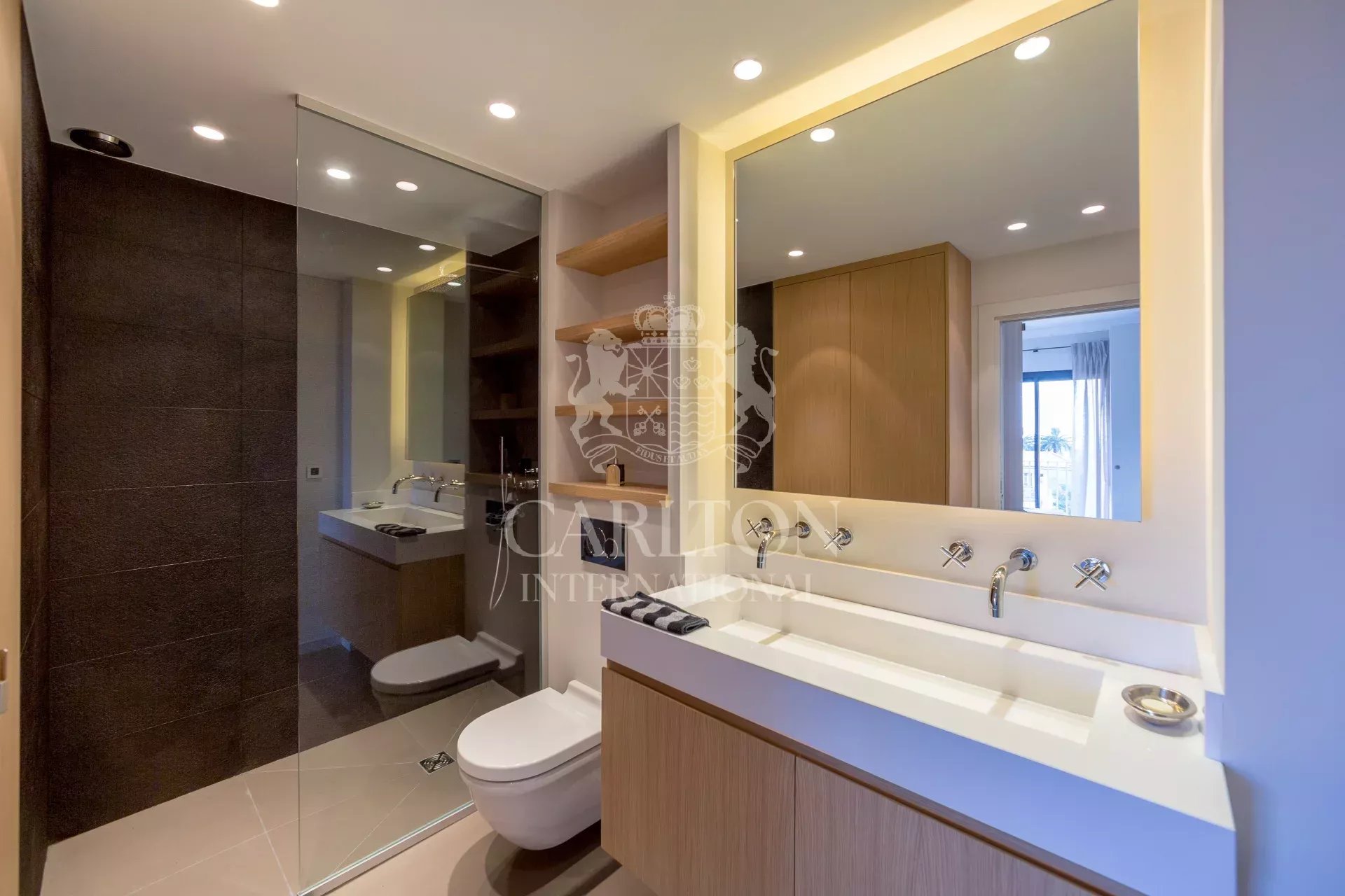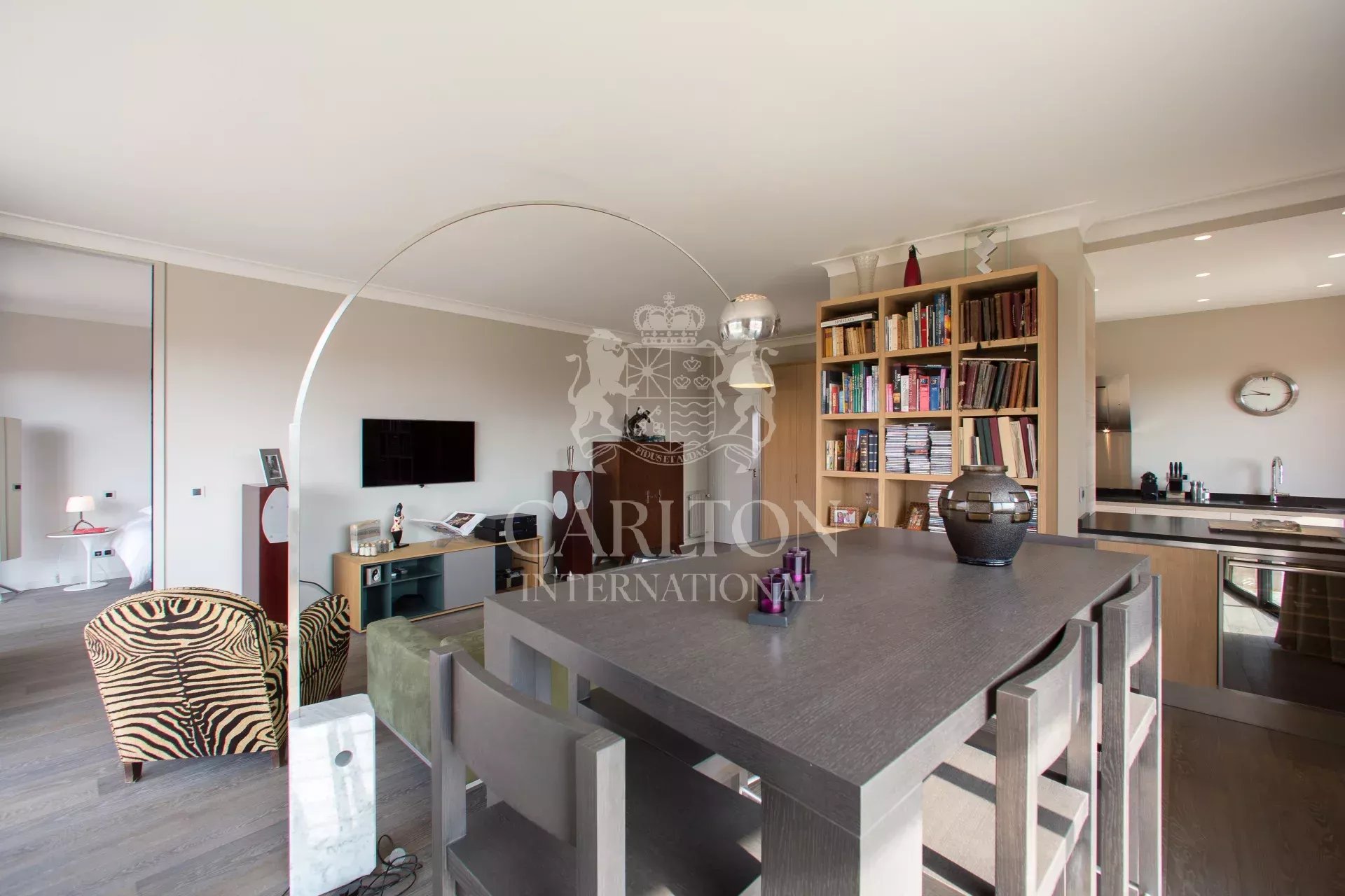 Il se compose d’un vaste séjour lumineux avec cuisine semi-ouverte entièrement équipée, le tout ouvrant sur une profonde terrasse d’angle exposée Sud et Est de 31m2 avec vue panoramique mer.