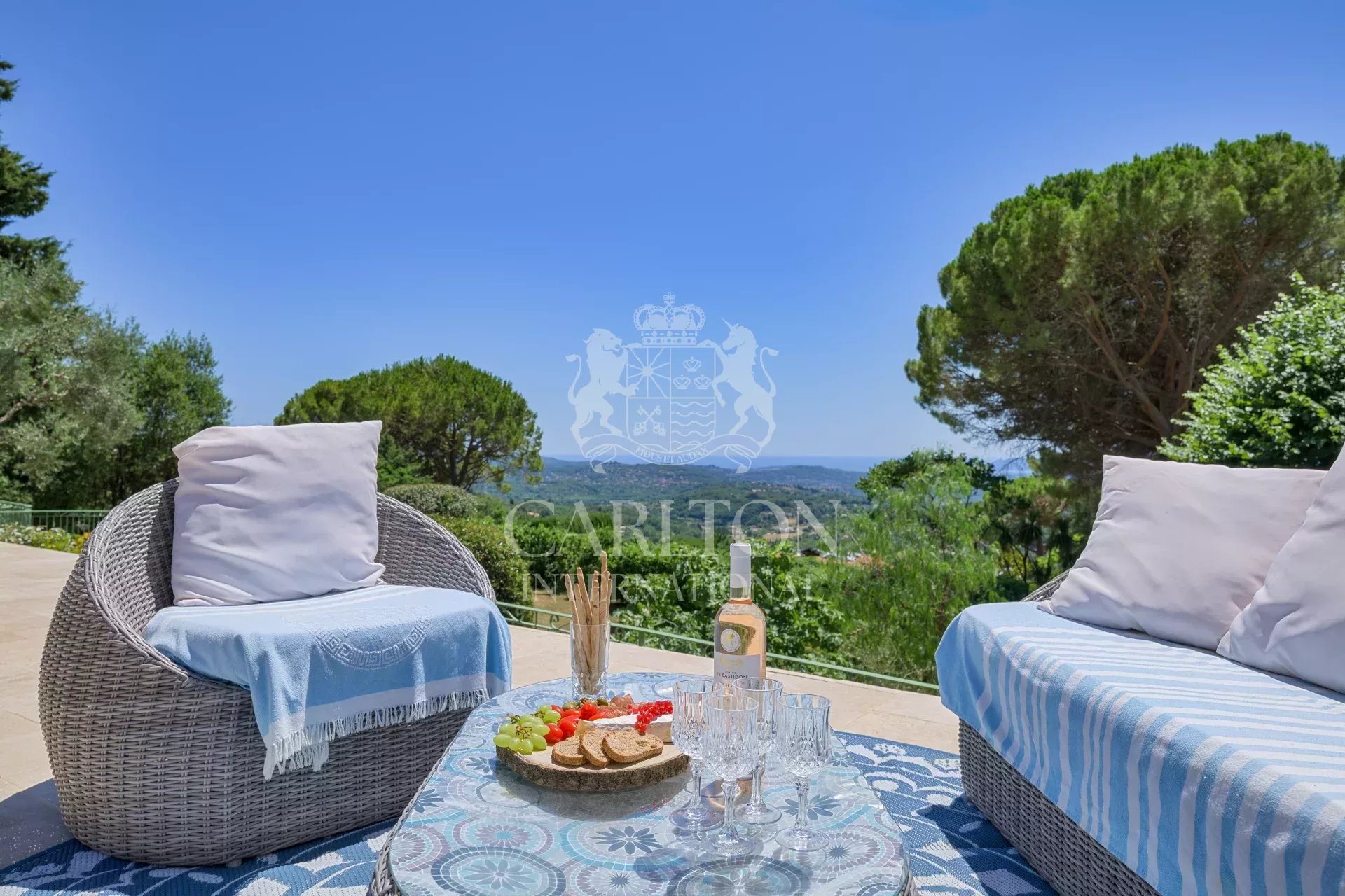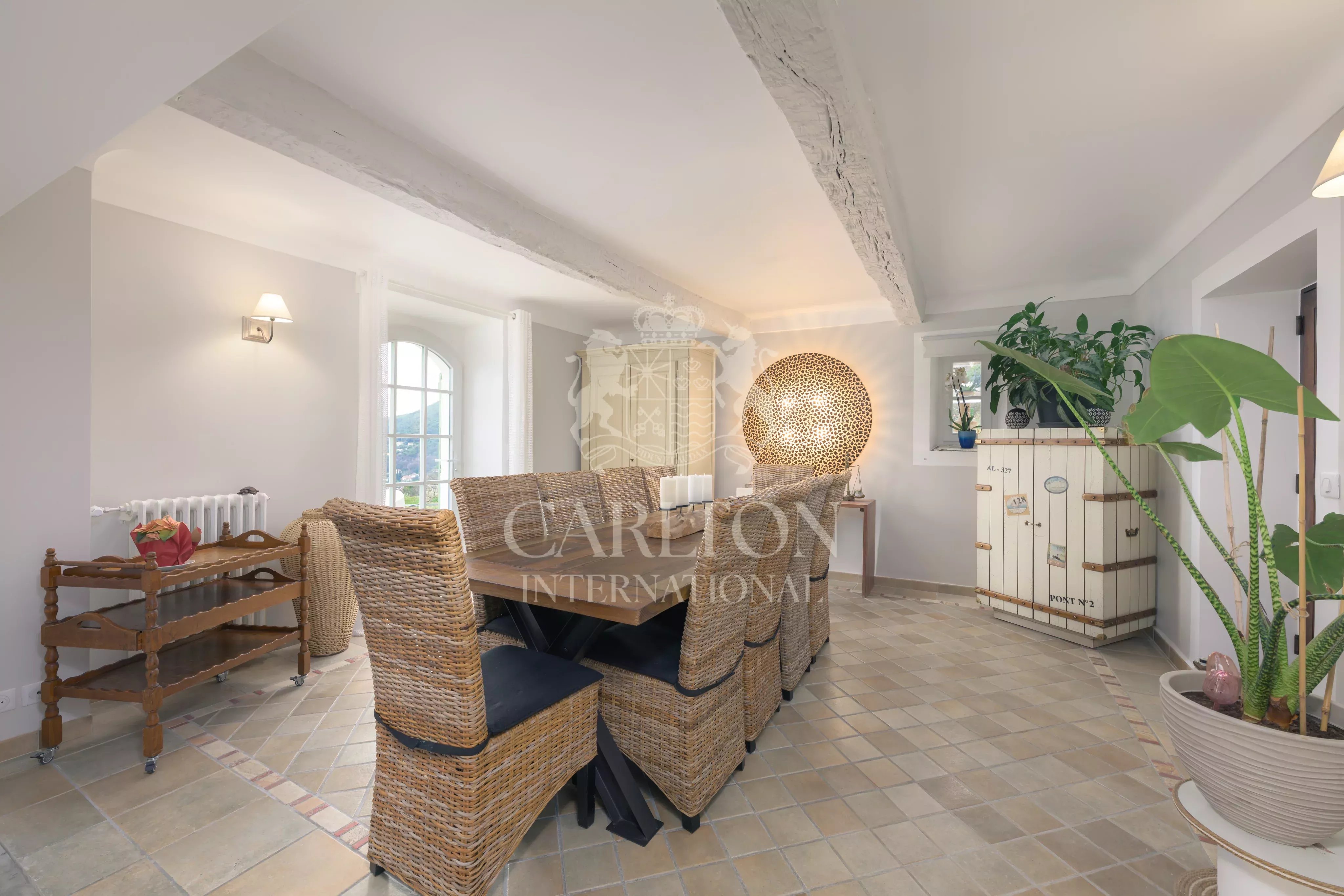 À l’extérieur, le charme provençal se révèle pleinement. Le jardin en restanques, méticuleusement entretenu, déploie une magnifique oliveraie. Un terrain de boules abrité par des tilleuls centenaires invite à prolonger les après-midis d’été. La piscine, véritable oasis de fraîcheur, s’intègre naturellement au paysage et s’ouvre sur une vue panoramique exceptionnelle, embrassant les collines environnantes et la mer Méditerranée en toile de fond.