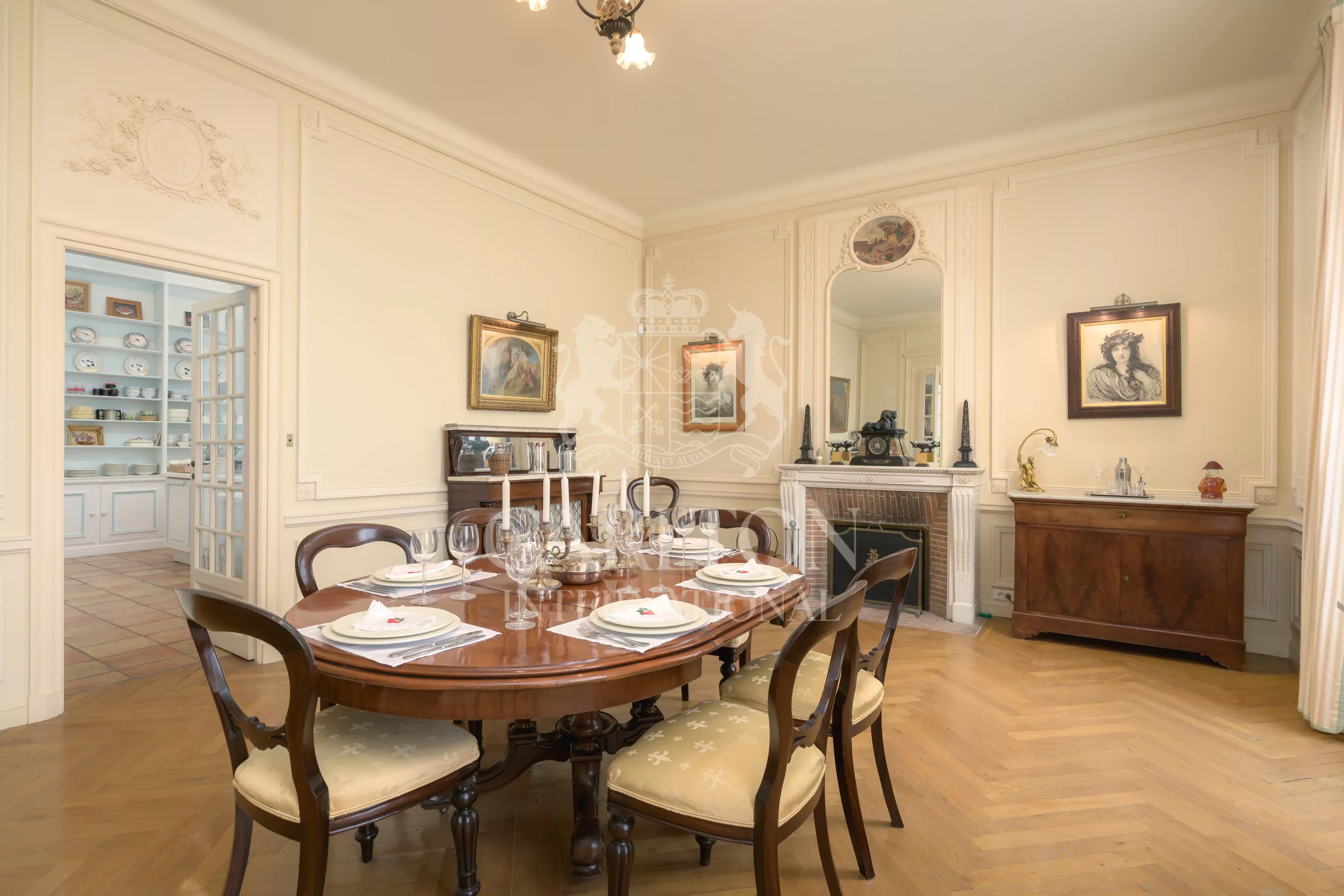Décorée et aménagée avec raffinement, la demeure dégage une ambiance des années 1900 avec des volumes et des hauteurs de plafonds exceptionnels ainsi que des superbes parquets, moulures et matériaux nobles d’époque.