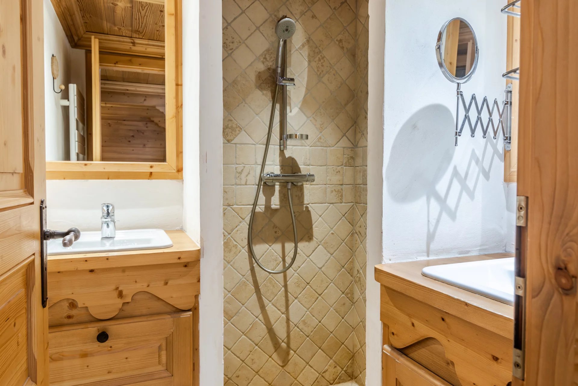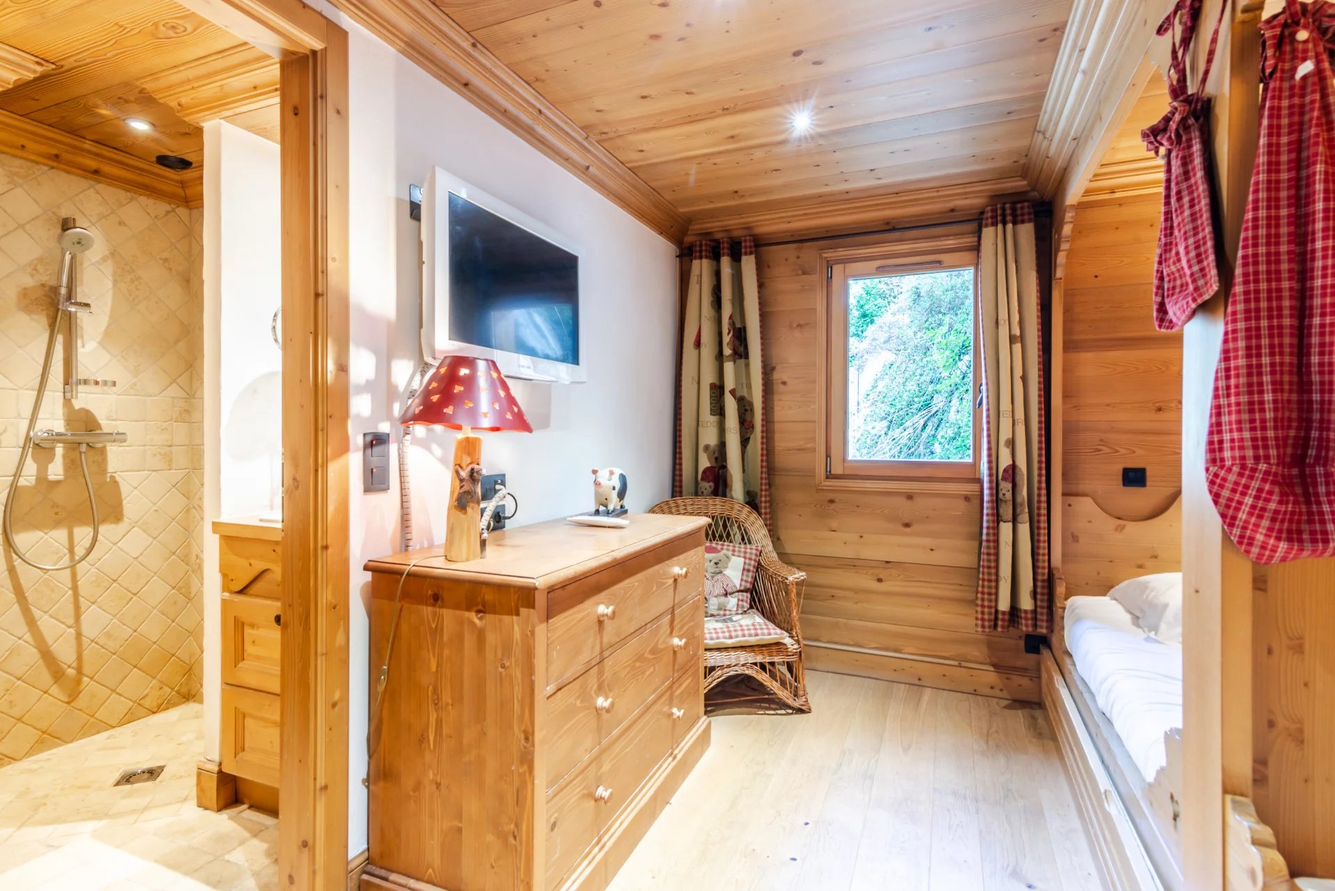 – Chambre enfant : 2 Lit gigogne (deux simples) (90×180), Salle de bains en-suite (Douche italienne, Simple vasque), TV