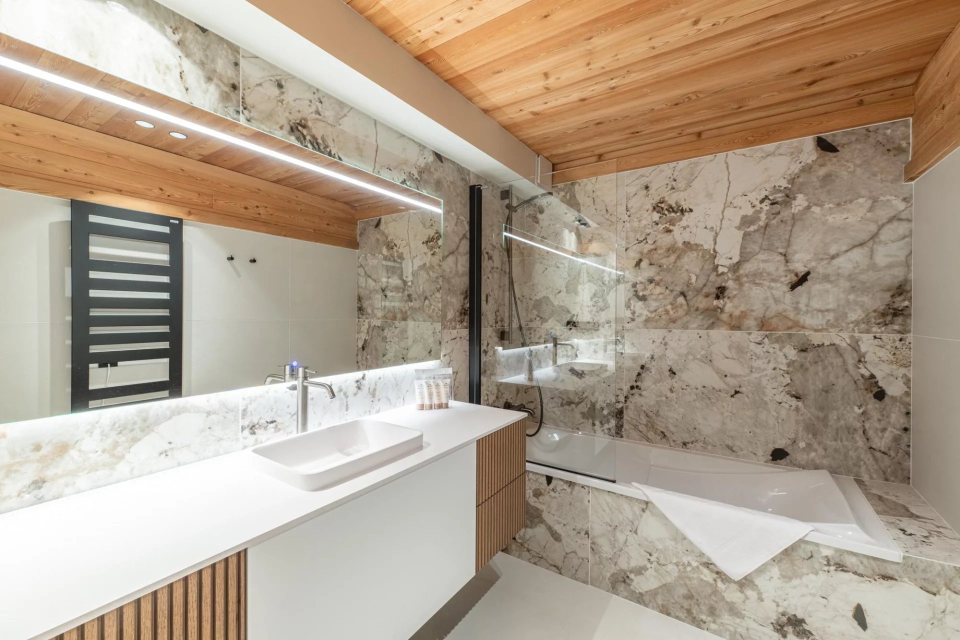– Chambre Twin : Salle de bains en-suite (Baignoire, Double vasques, Sèche-cheveux, Sèche-serviettes, Toilettes), Bureau, Penderie, Placard