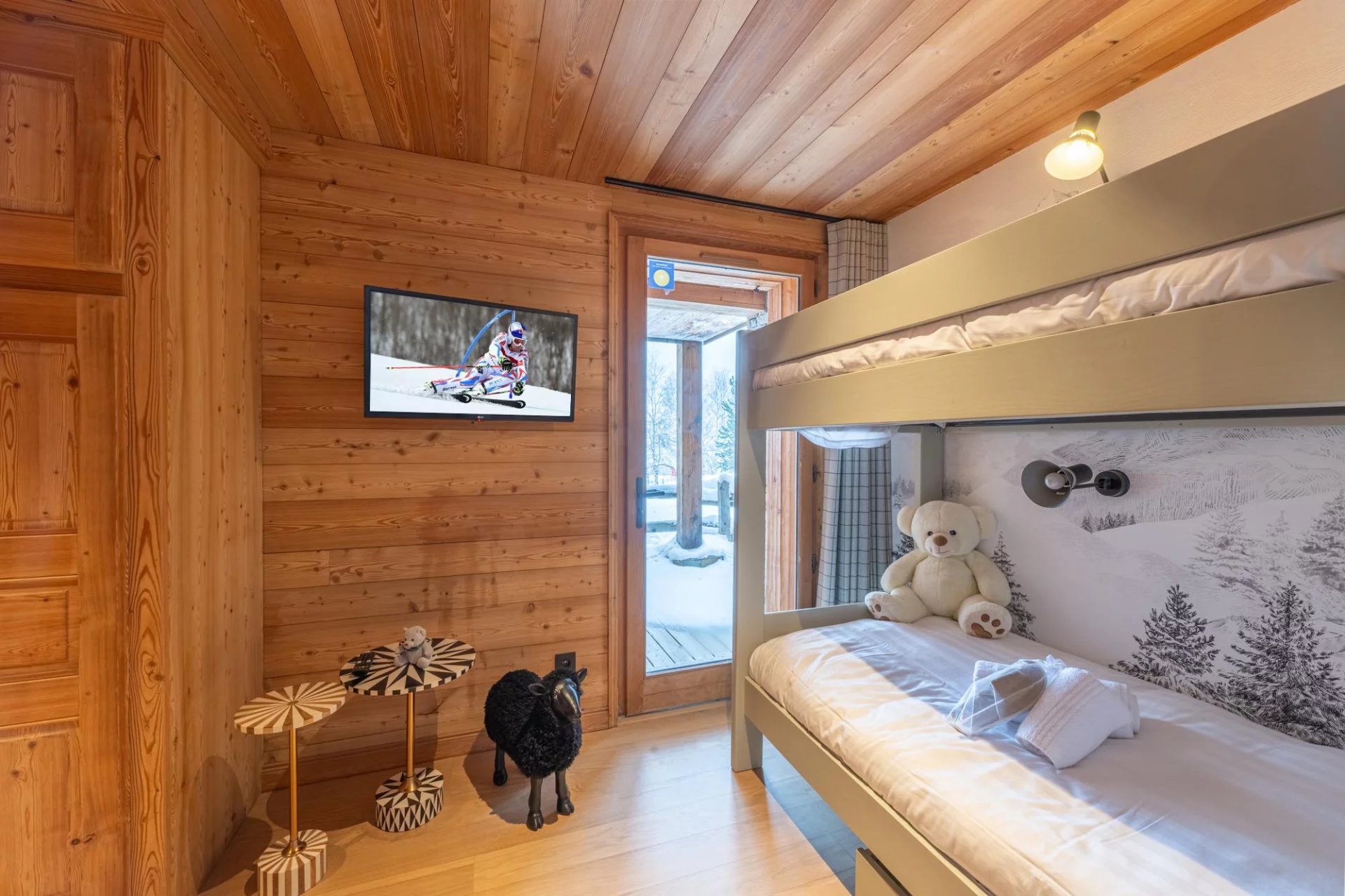 – Chambre enfant : 2 Lits superposés (deux couchages) (80×190), Salle de bains en-suite (Douche, Sèche-cheveux, Simple vasque, Toilettes), Balcon