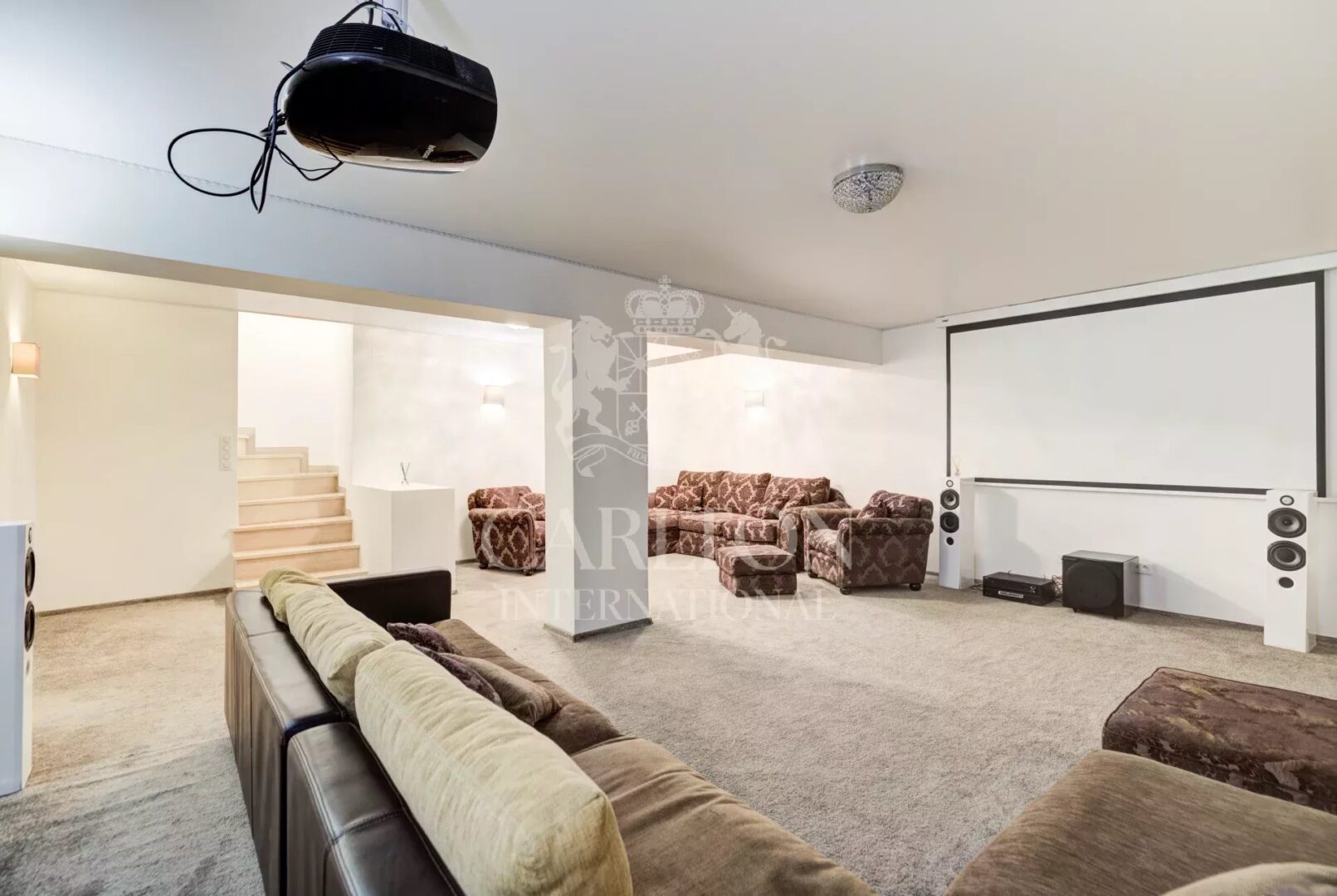 Grand sous-sol aménagé avec salle de cinéma, sauna, chambres et salle de douche.