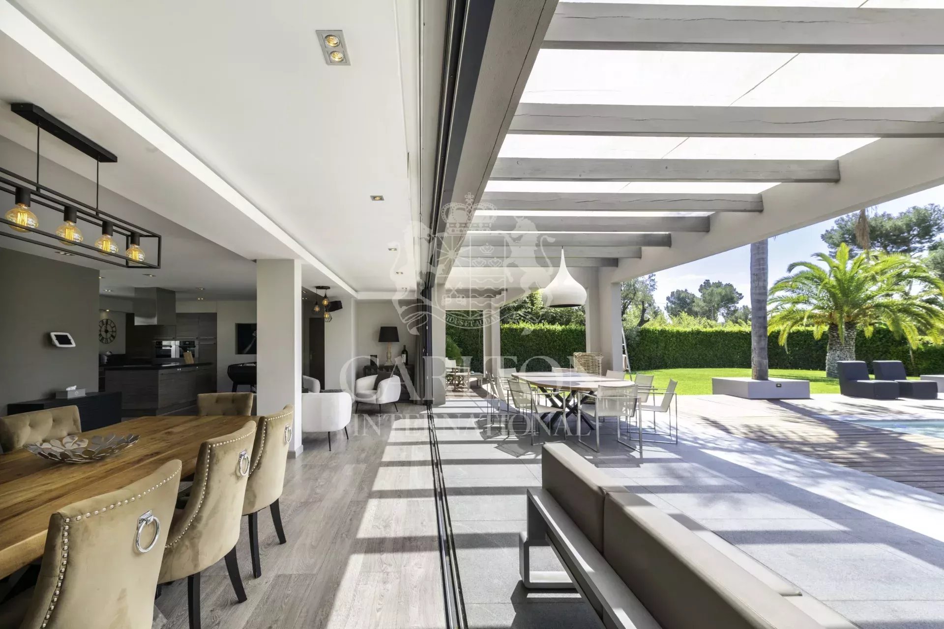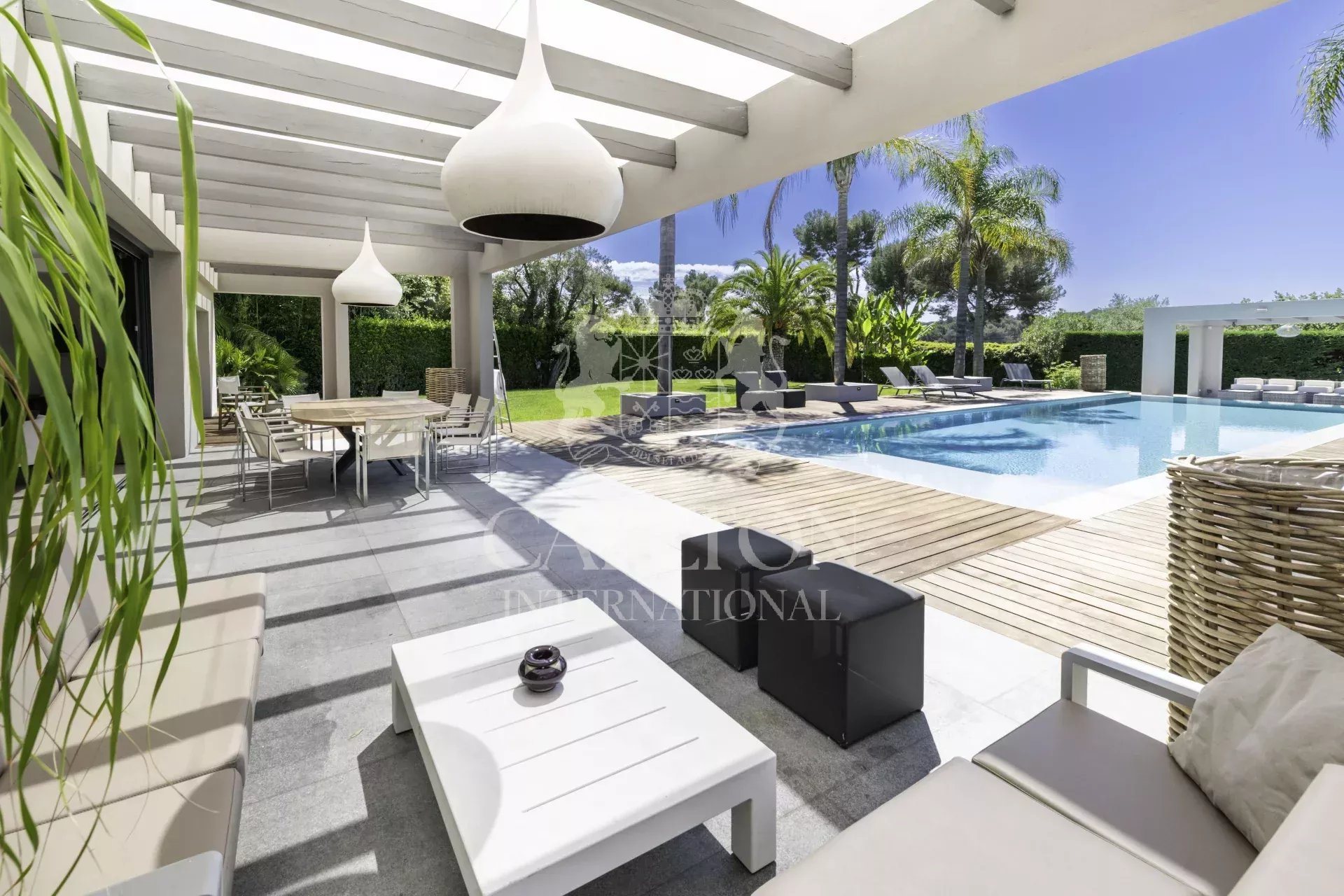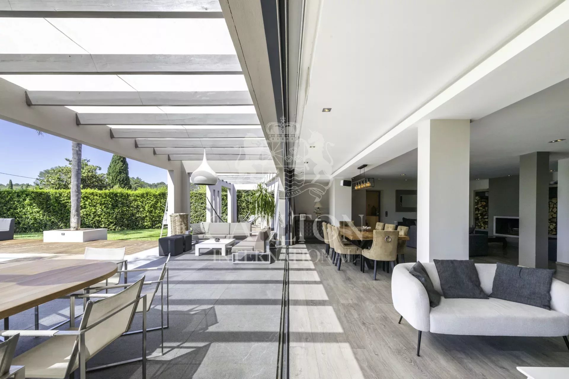 Superbe villa contemporaine de plain-pied d’environ 280 m² sise sur un terrain d’environ 3 076 m², idéalement située à Mougins dans un quartier résidentiel, proche de toutes commodités.