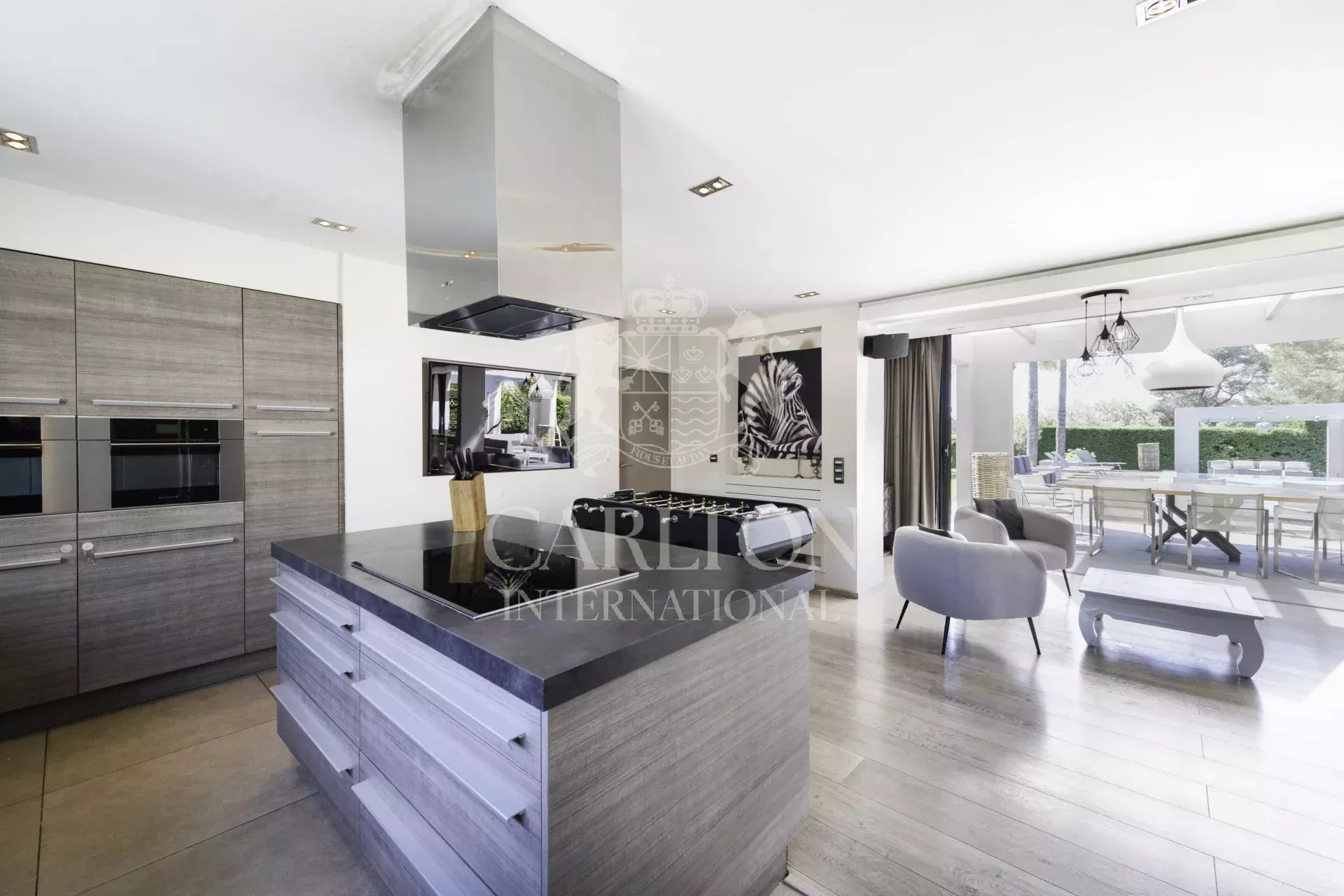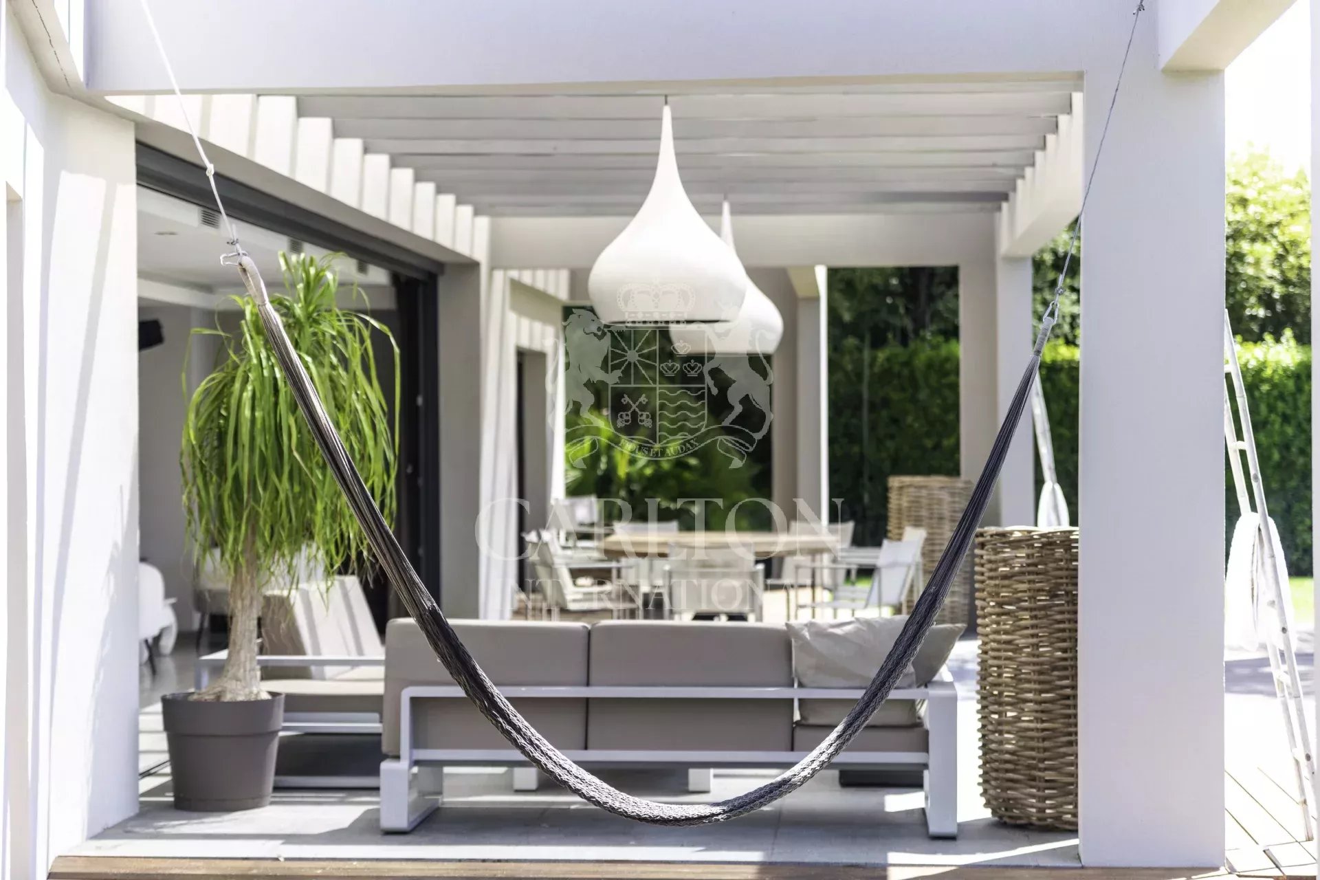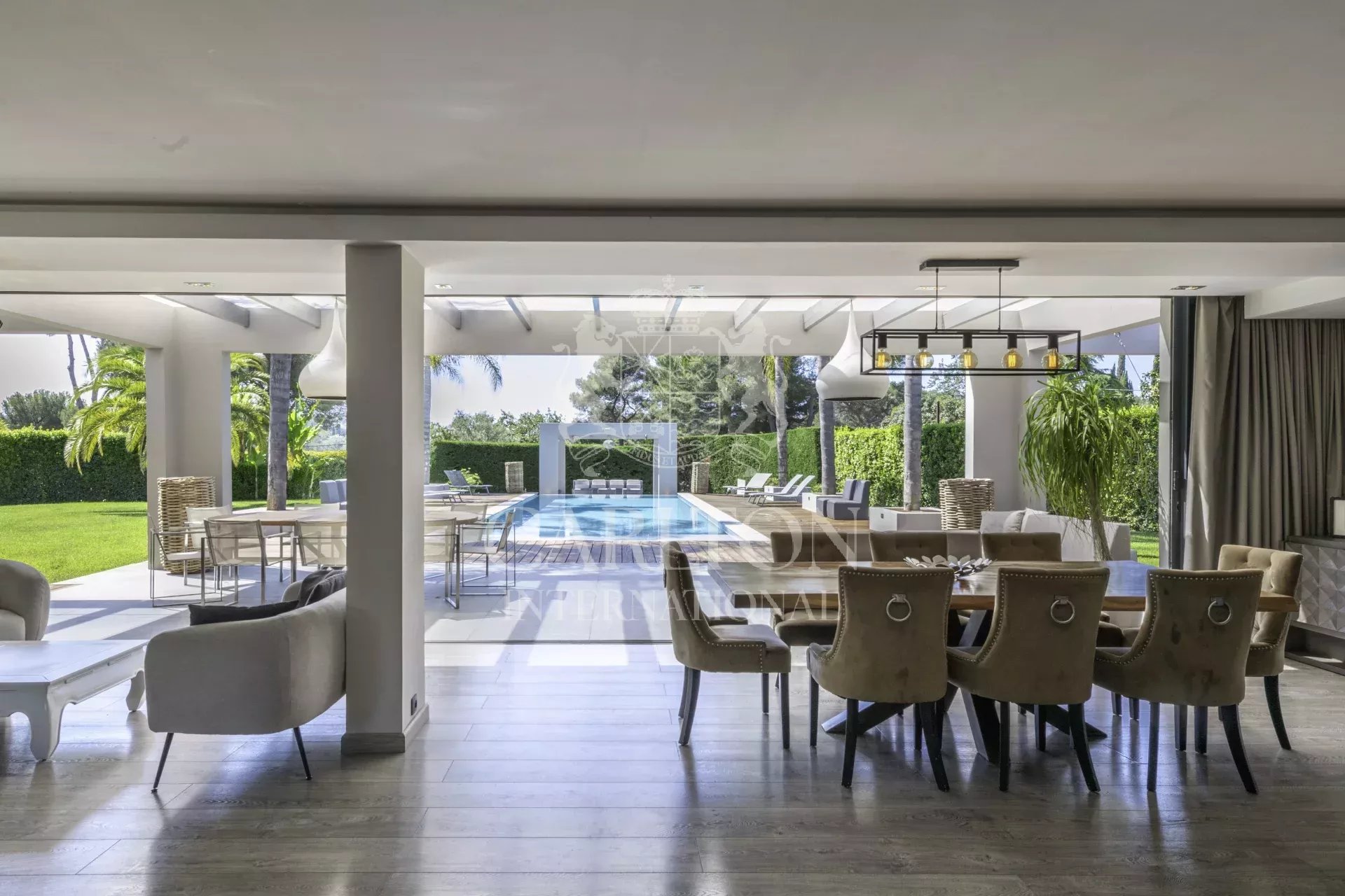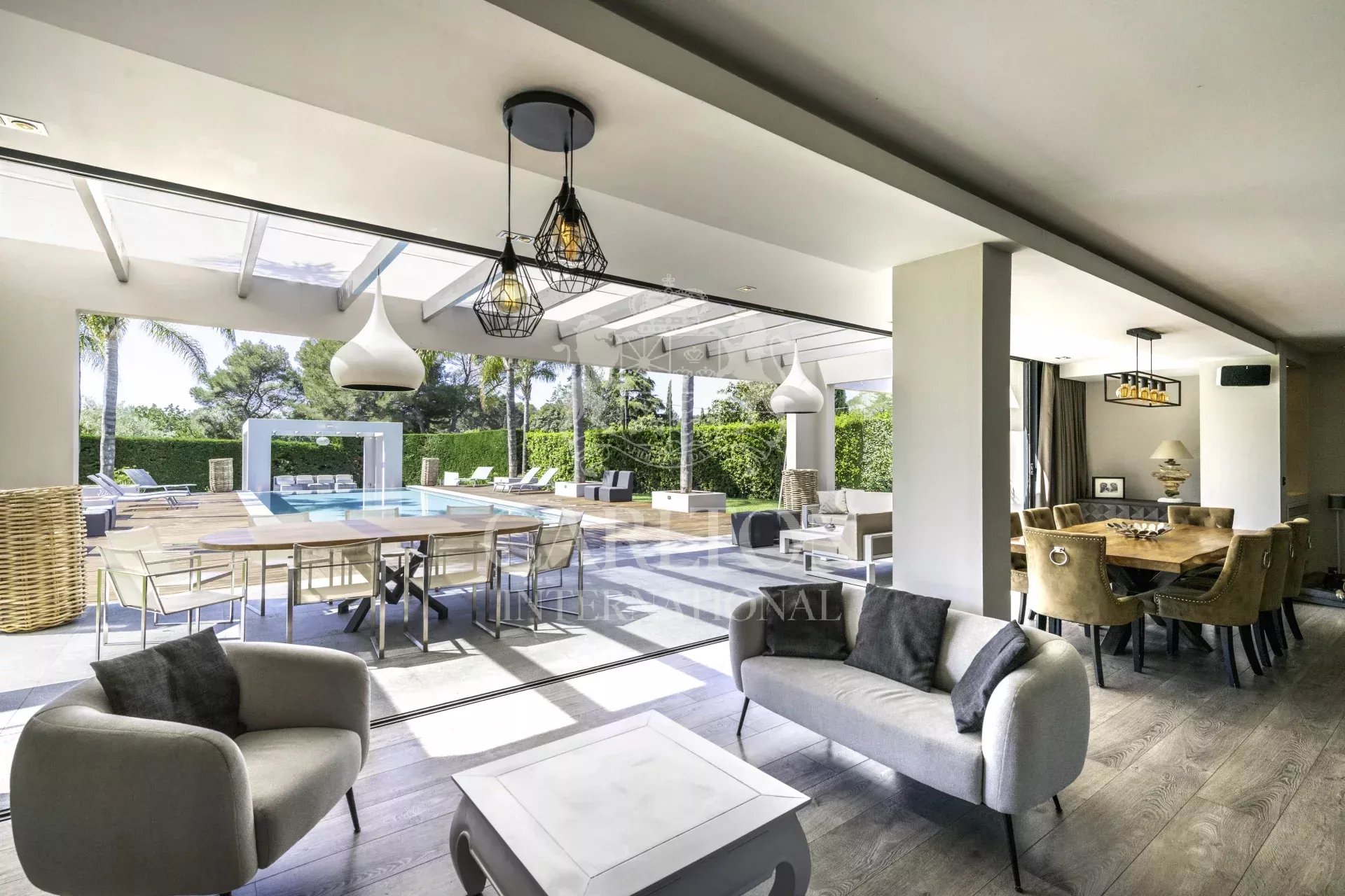 Superbe villa contemporaine de plain-pied d’environ 280 m² sise sur un terrain d’environ 3 076 m², idéalement située à Mougins dans un quartier résidentiel, proche de toutes commodités.