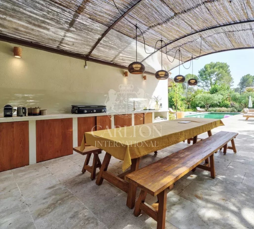 Dès l’entrée, on découvre des volumes généreux et baignés de lumière. Le vaste séjour ouvre sur plusieurs terrasses ensoleillées, idéales pour profiter des belles journées provençales. La cuisine semi-ouverte, entièrement équipée, s’intègre avec élégance aux différents espaces de vie. Trois chambres en rez-de-chaussée, chacune avec sa salle de bains privative, offrent un confort absolu. À l’étage, la suite parentale domine le jardin et comprend un espace bureau lumineux, parfait pour allier sérénité et fonctionnalité.