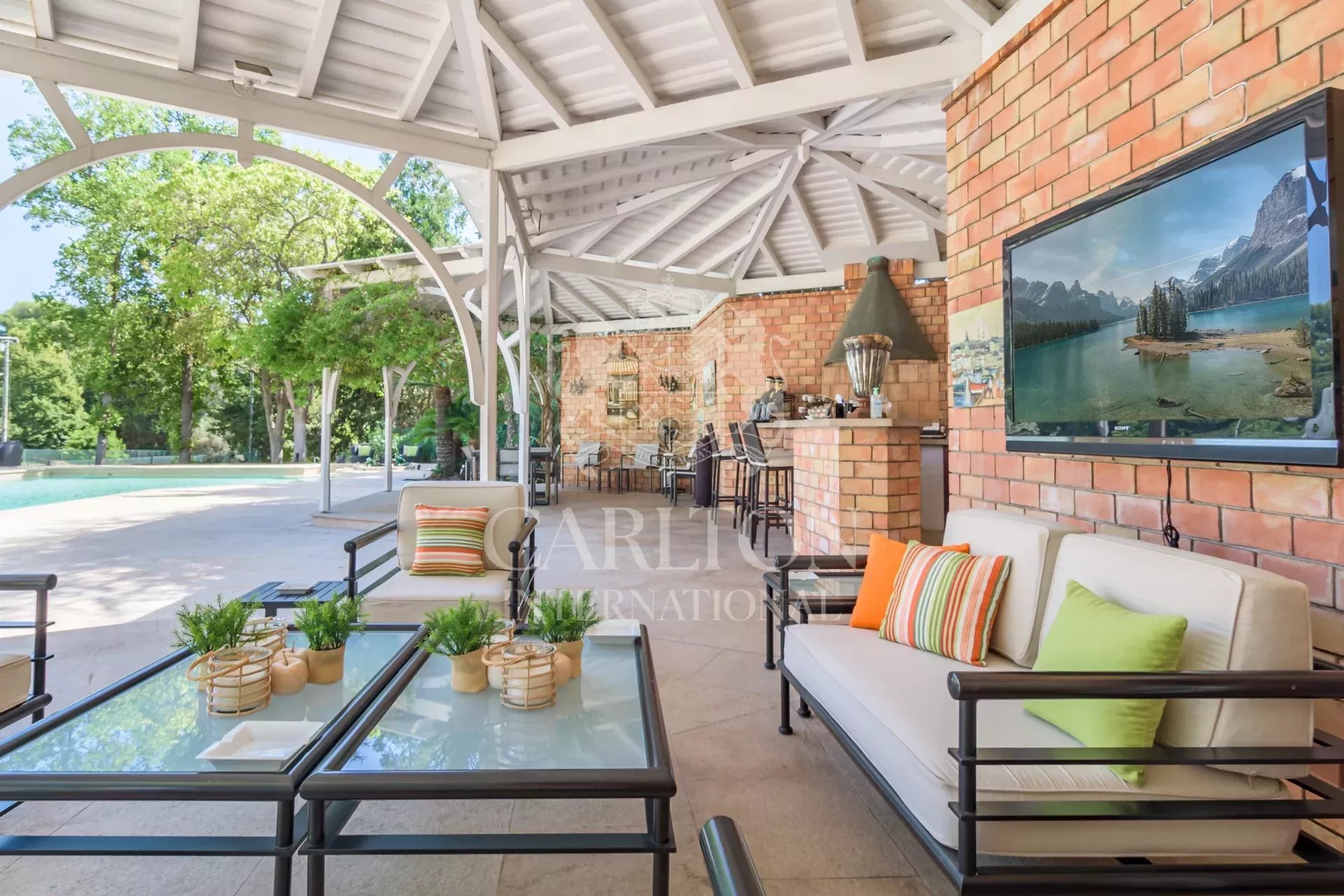 Le parc offre de vastes espaces extérieurs comprenant une piscine, un bar avec espace détente, un pool house avec douche et toilettes, ainsi qu’un terrain de tennis. Ref 12450