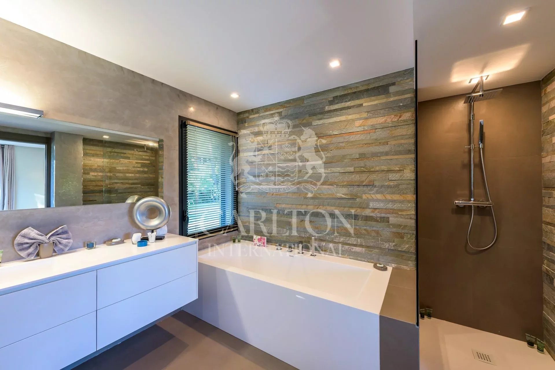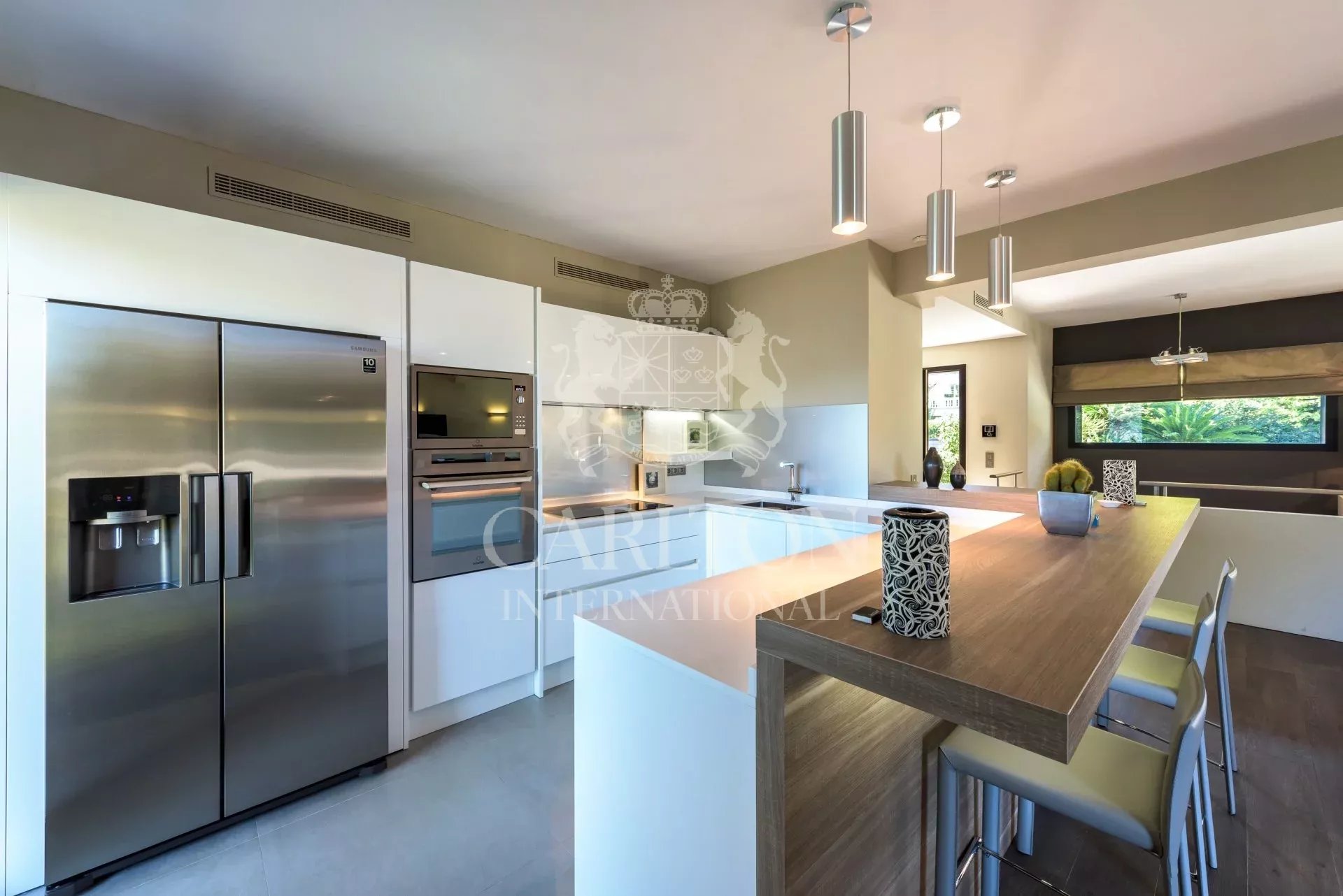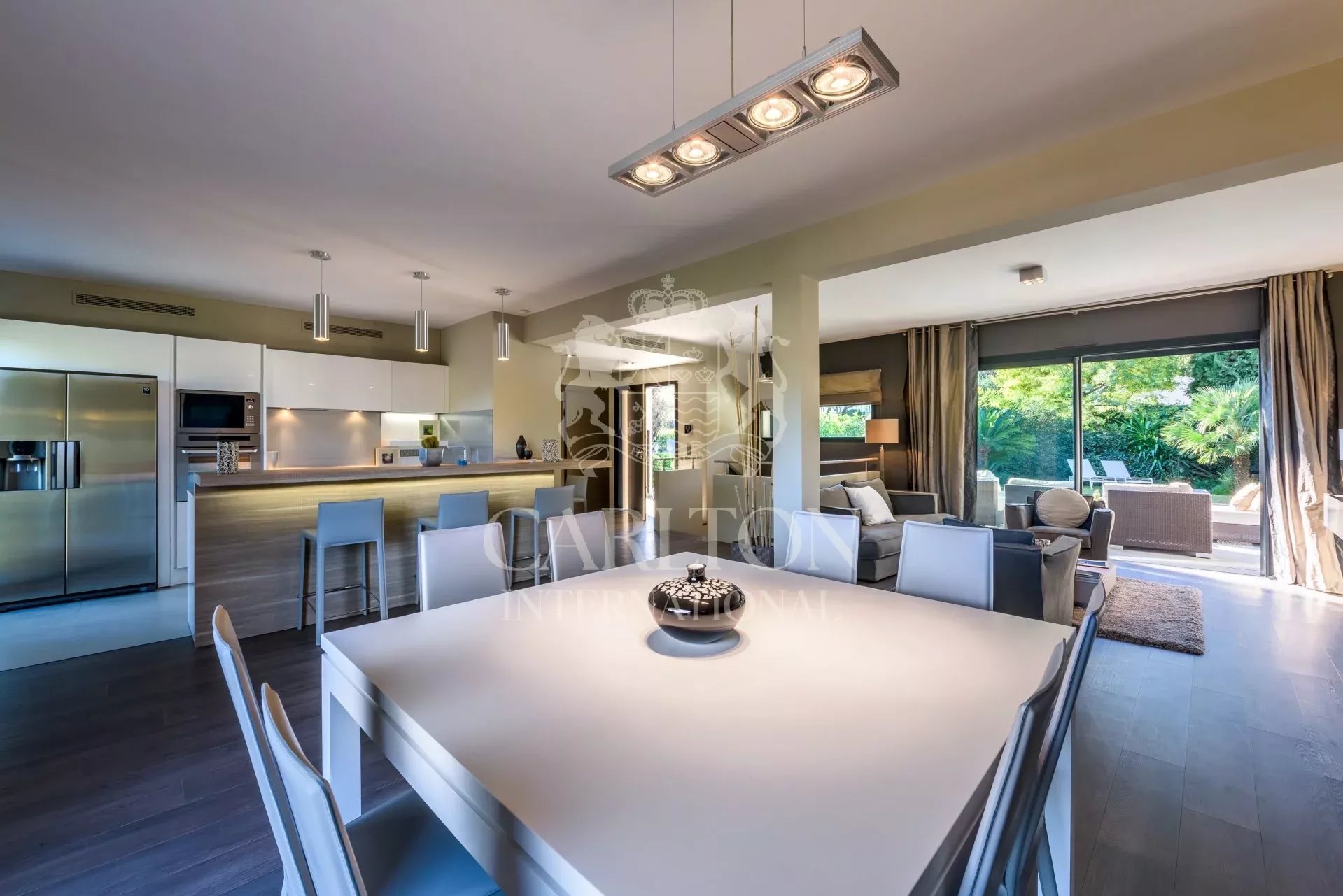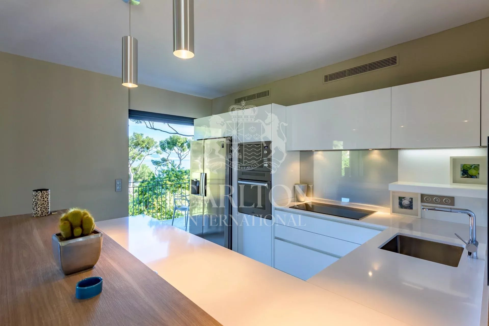 Belle villa d’environ 200m² située à Cap Martin dans un environnement calme et recherché, à proximité de Monaco. Bénéficiant d’une vue dégagée sur Menton, l’Italie et la mer, cette villa exposée Est-Ouest a été entièrement rénovée dans un style moderne et offre des prestations haut de gamme ainsi que des finitions d’une qualité supérieure. L’entrée ouvre sur une belle pièce de réception avec salon, salle à manger et cuisine américaine entièrement équipée le tout ouvrant d’un côté sur le jardin et la piscine et de l’autre sur une belle terrasse avec vue mer. Sur ce même niveau se trouve également une chambre double avec salle de bain et dressing ensuite. Le rez-de-jardin dispose de 3 chambres avec salle de douche et dressing ensuite, un bureau et une buanderie. Le jardin paysagé d’environ 1 115m² est agrémenté d’une piscine pouvant être chauffée et est entourée d’une belle terrasse avec salon d’été. Emplacement de parking pour 3 voitures, portail électrique, système d’alarme, vidéosurveillance. Ref 666LT
