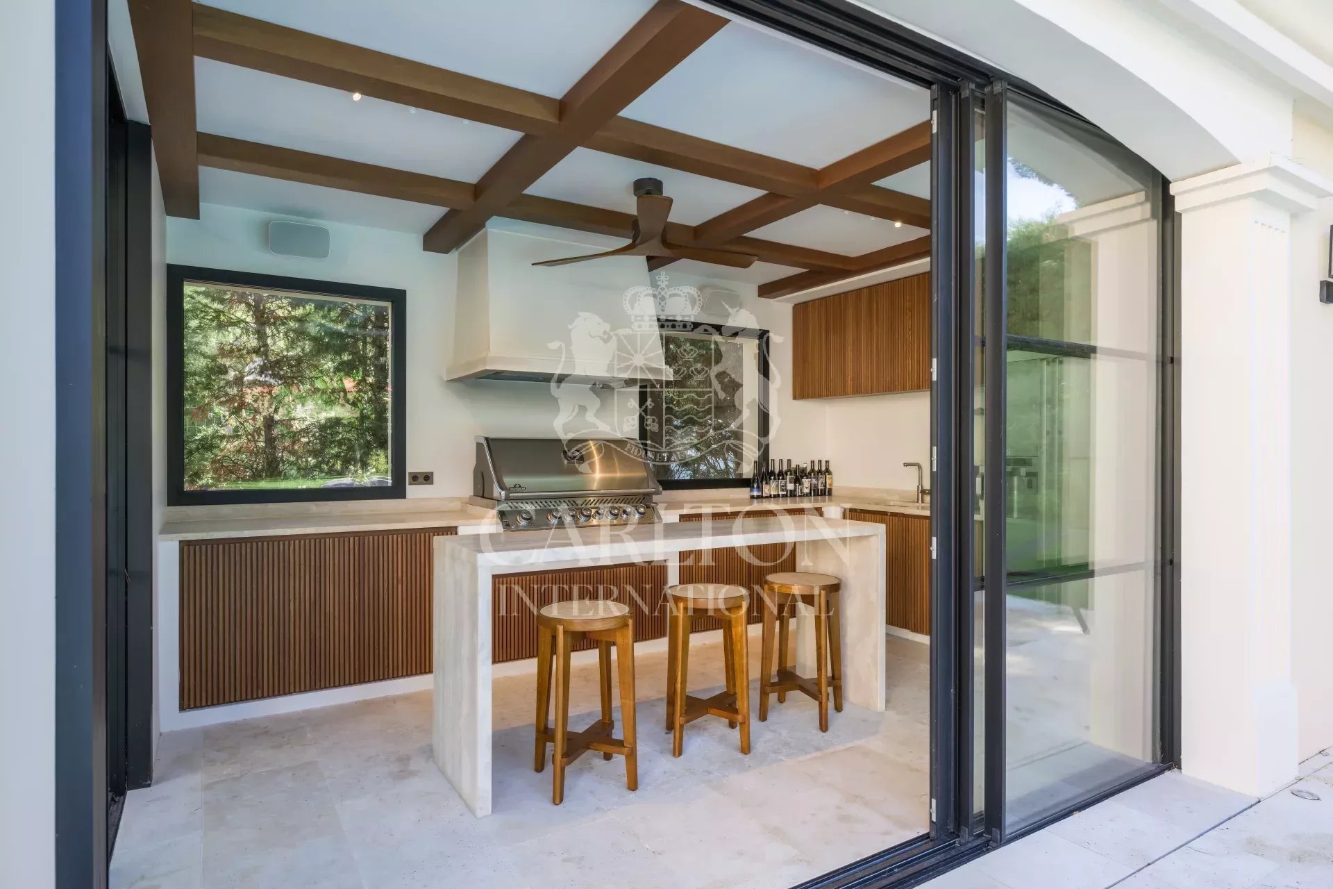 L’espace extérieur est tout aussi impressionnant : un pool house avec barbecue intégré pour des moments conviviaux et une terrasse sur le toit équipée d’une cuisine extérieure et de confortables espaces de détente. Ce cadre spectaculaire est parfait pour des repas en plein air ou pour se relaxer sous le ciel méditerranéen.