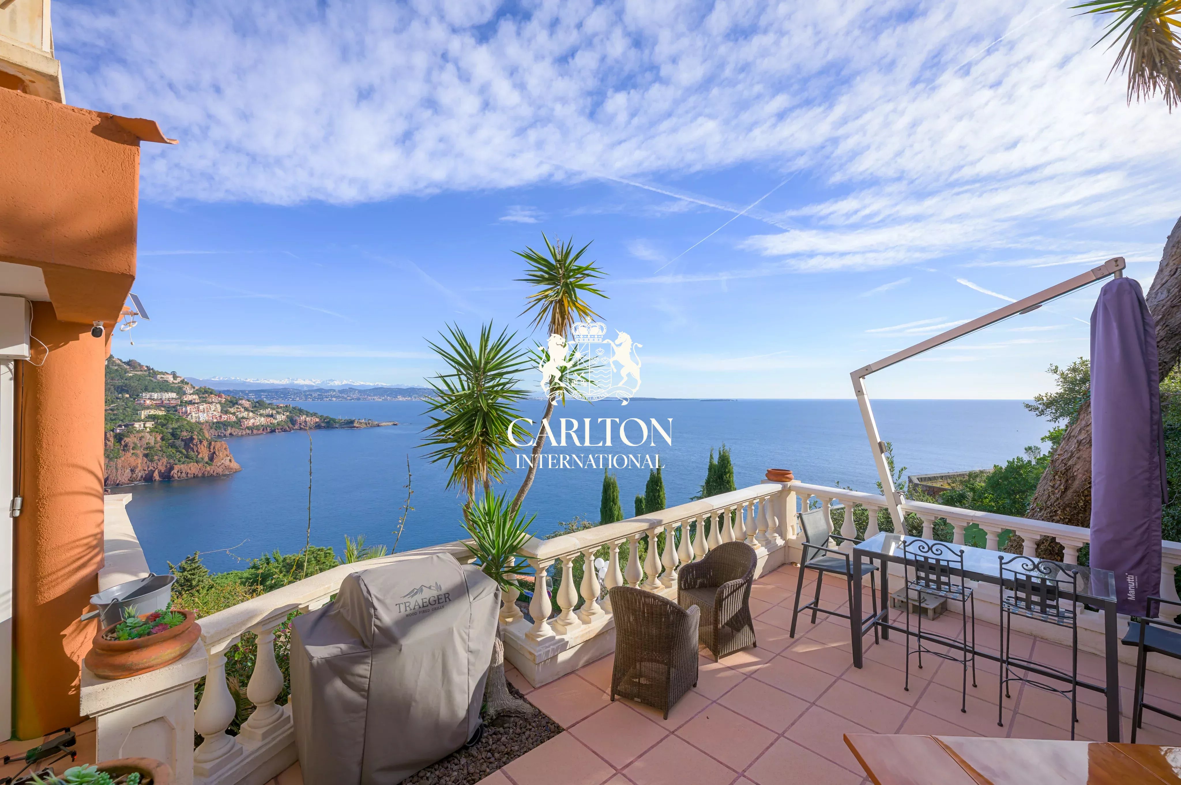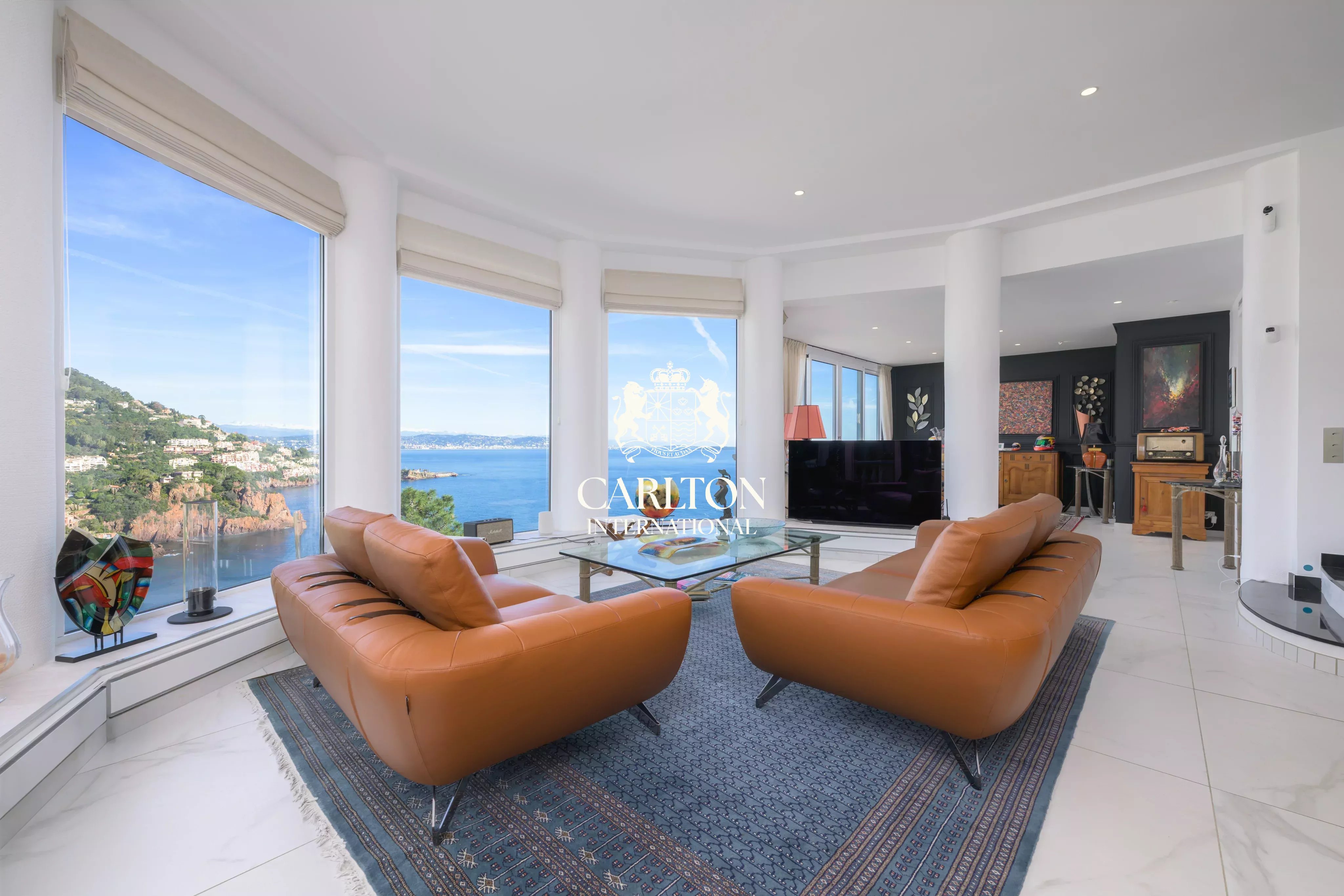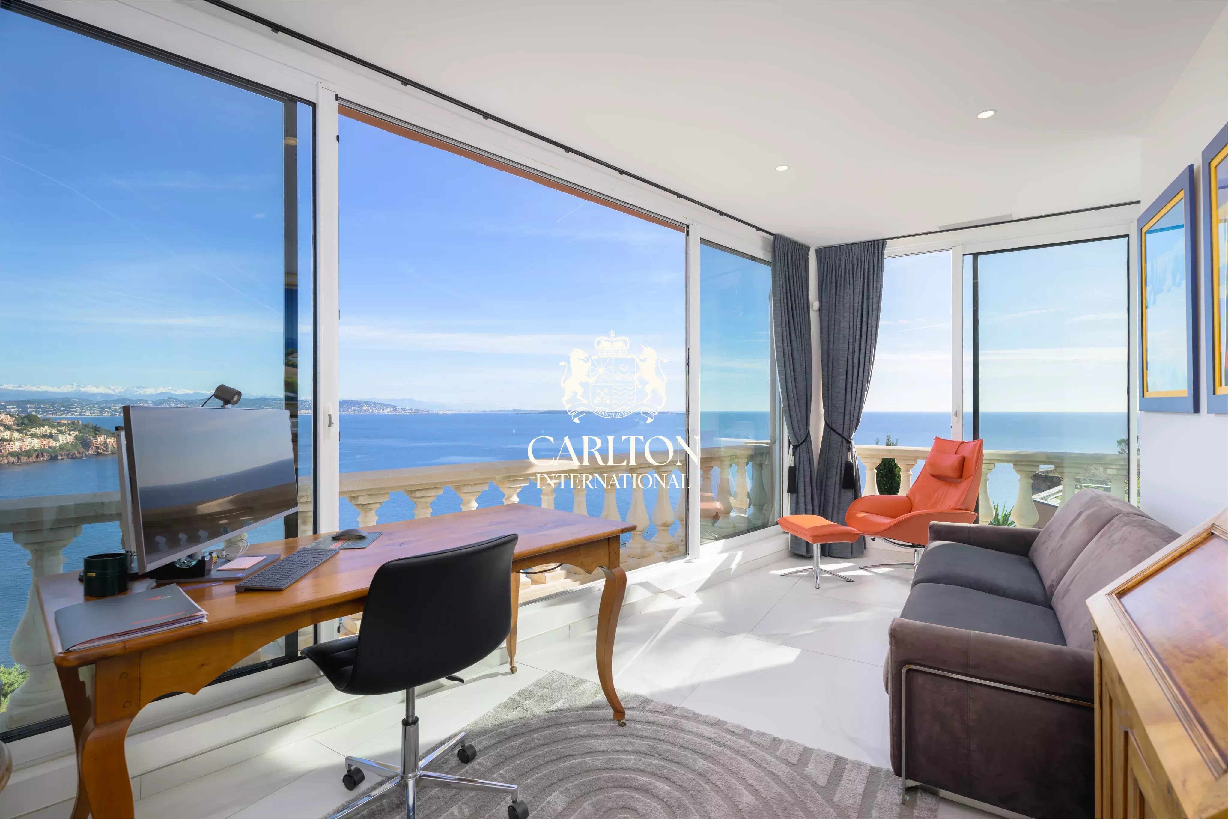 Dans un secteur privilégié et résidentiel, au cœur d’un domaine fermé, dans une copropriété de trois lots et en position dominante, l’appartement offre une vue panoramique sur la mer, Port la Galère, la baie de Cannes et les Iles de Lérins.