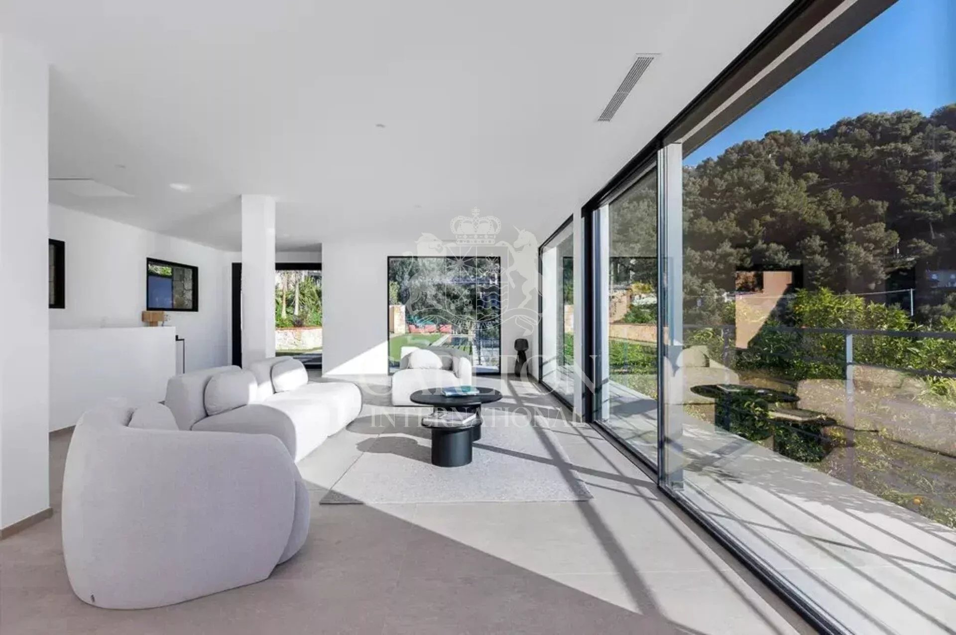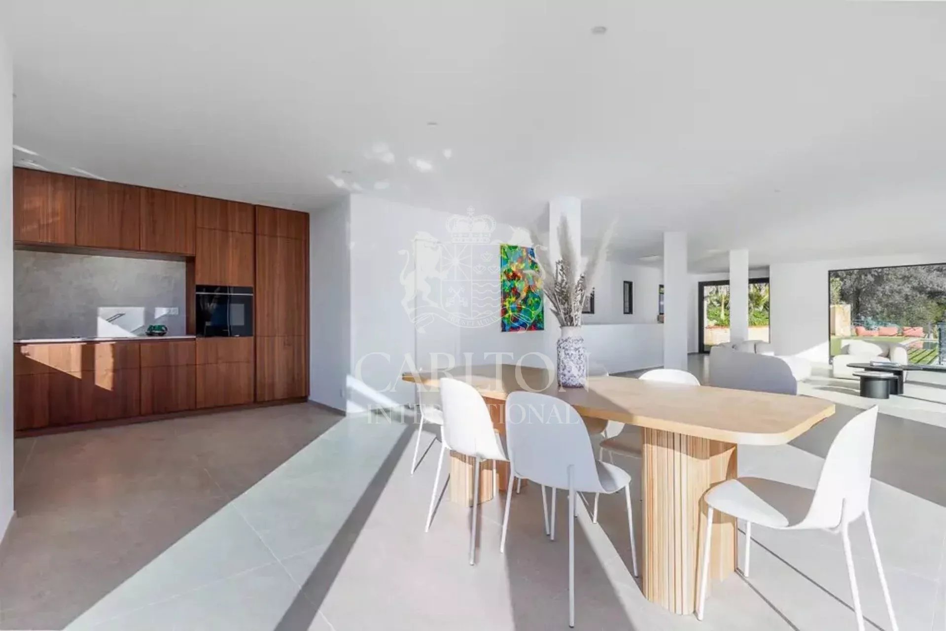 Répartie sur deux niveaux, la villa propose de beaux volumes et une belle luminosité naturelle. Le niveau principal accueille un vaste espace de réception comprenant un séjour lumineux, une salle à manger et une cuisine ouverte contemporaine, l’ensemble s’ouvrant largement sur les terrasses extérieures.