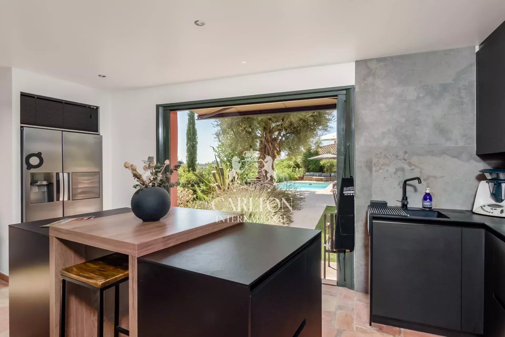 Un studio indépendant d’invités avec cuisine s’ouvre sur le jardin à quelques pas de la piscine.