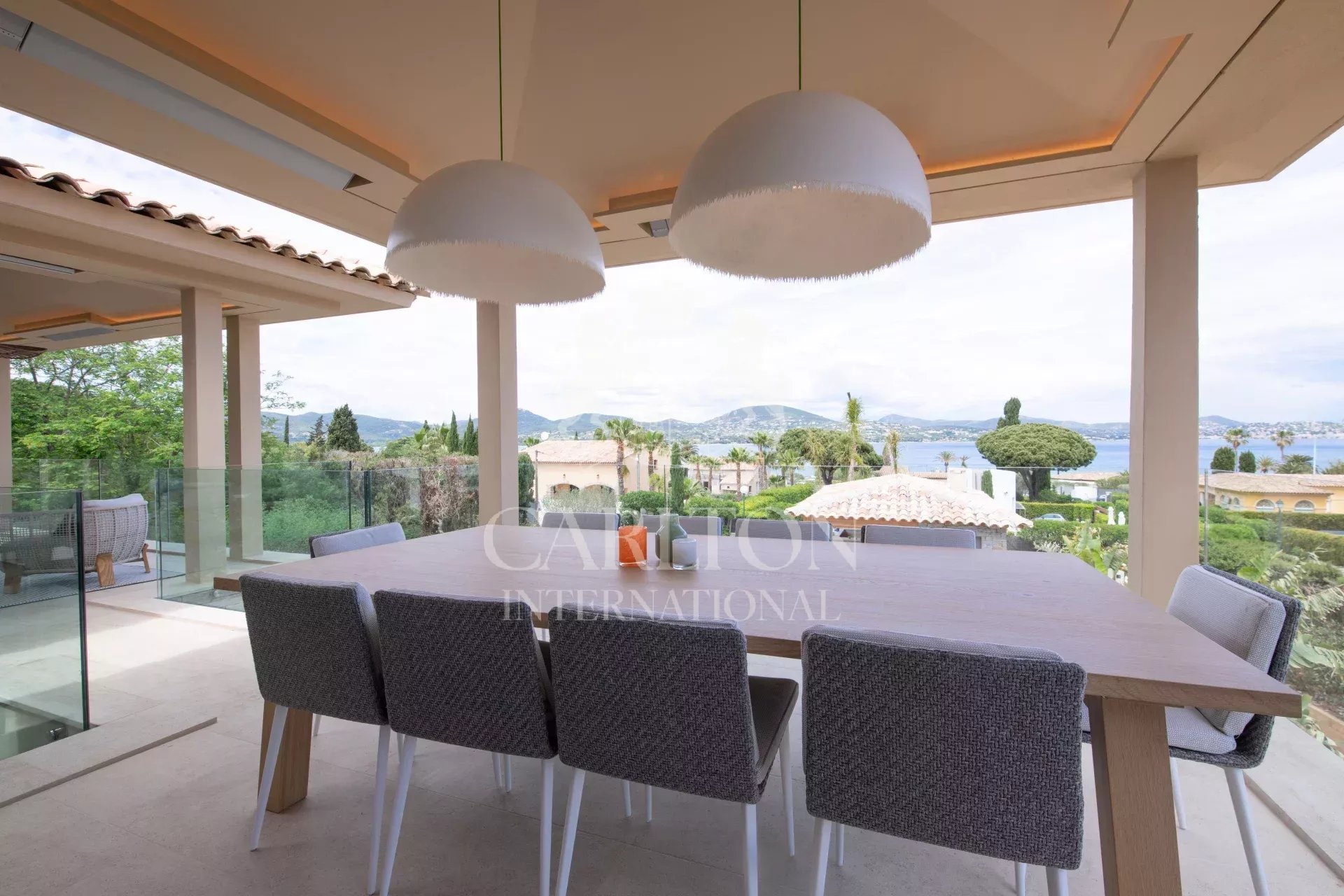 Cette villa neuve de standing est idéalement située dans le domaine SINOPOLIS à l’entrée de Saint-Tropez et offre une très belle vue mer, dans un design épuré.