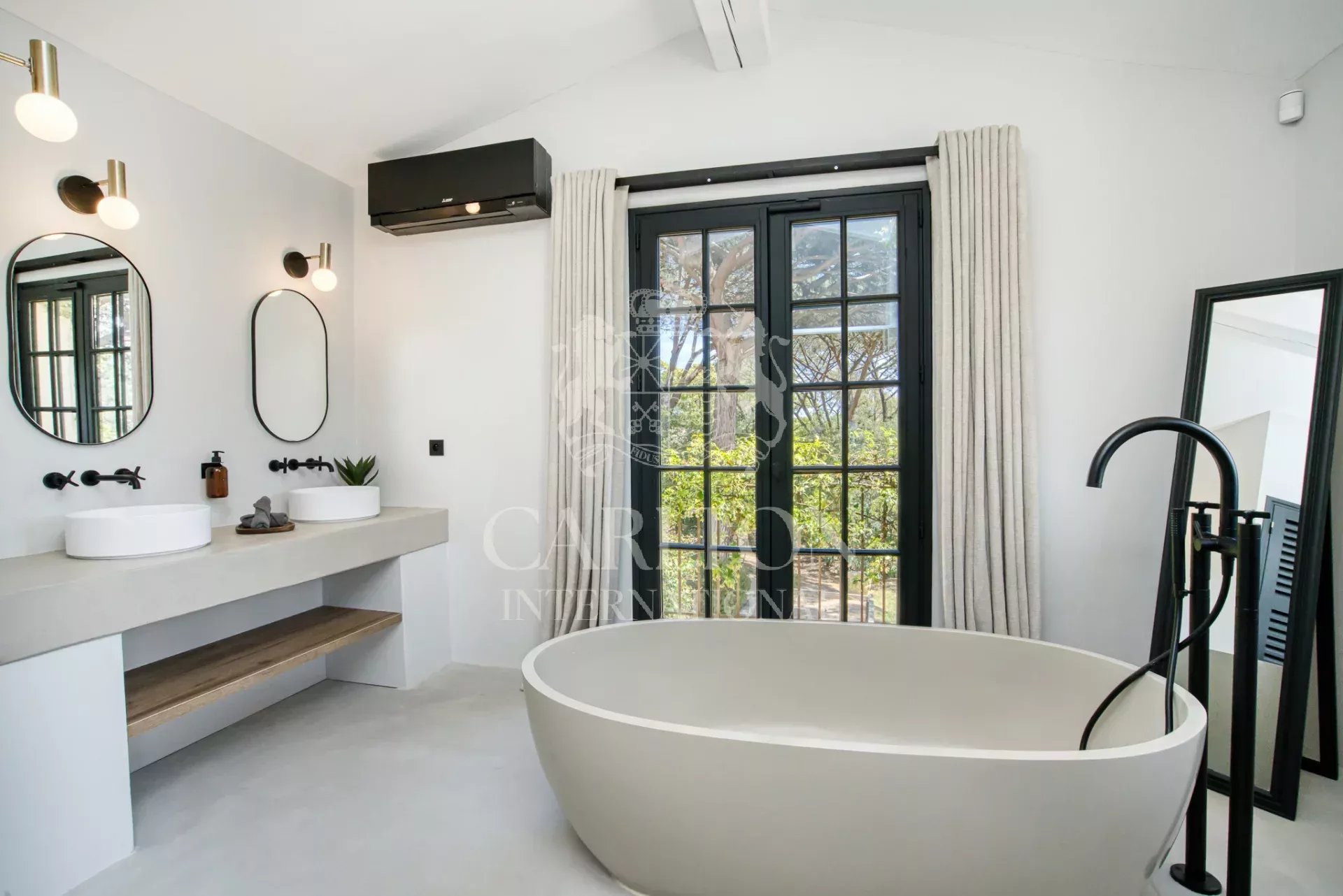Ramatuelle – Nichée entre les vignes et les collines, cette villa de 350 m², superbement décorée, est située sur un parc paysager de 6 000 m².