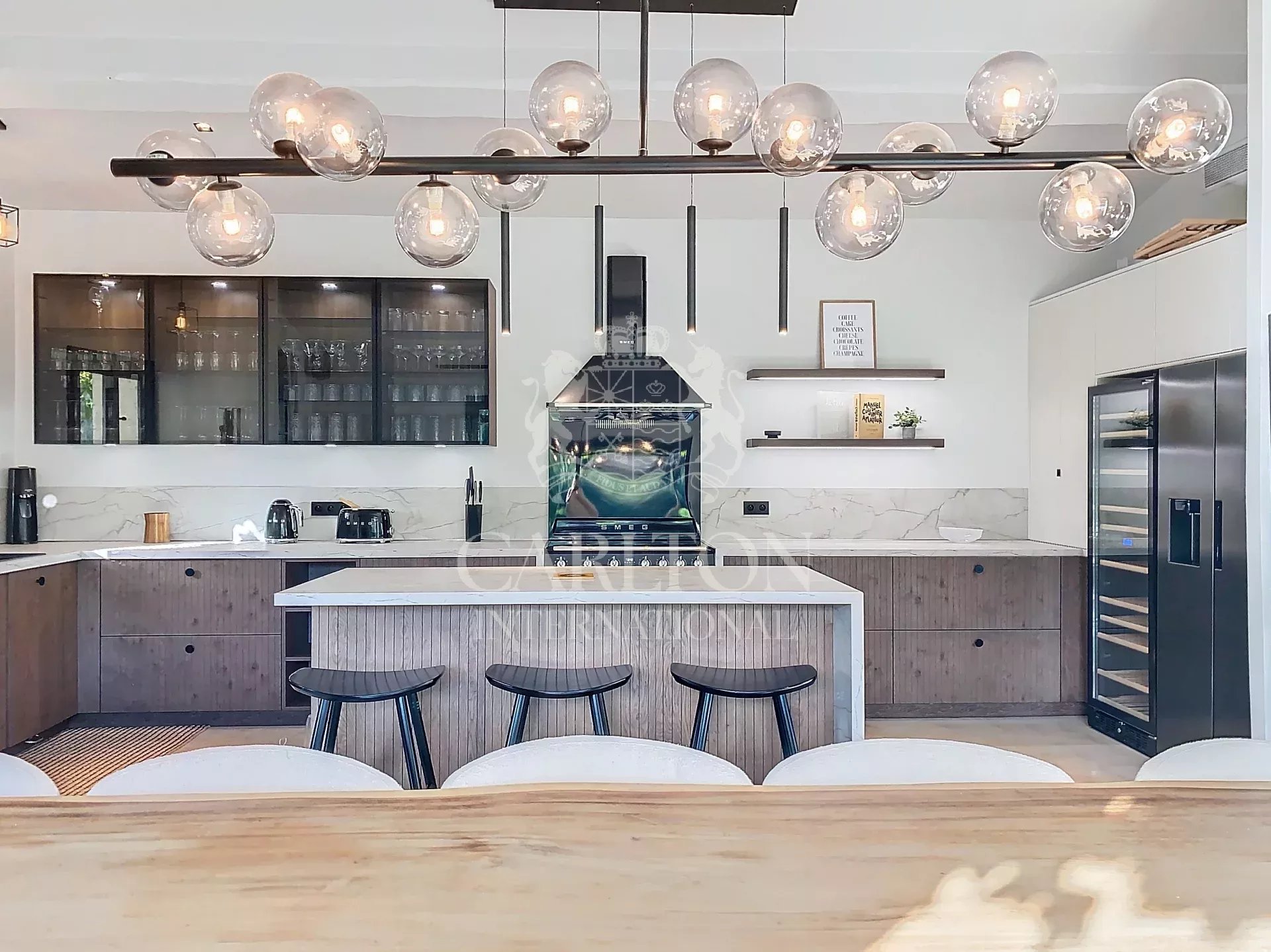 La villa comprend un hall d’entrée, un salon avec cheminée, une cuisine équipée avec îlot et espace repas, le tout ouvrant sur le jardin.