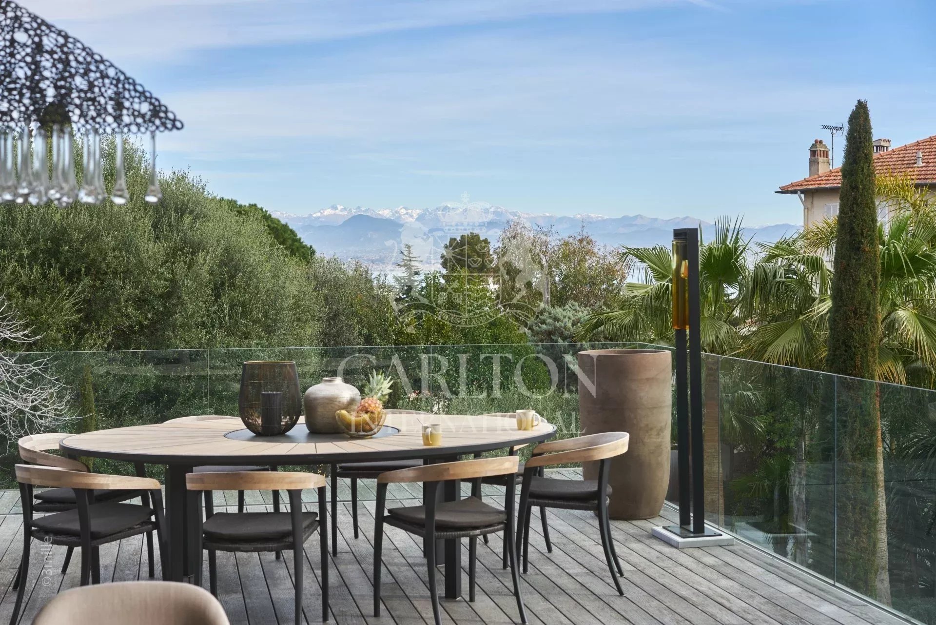 Ausgebaute Dachterrasse, die von einem atemberaubenden Blick auf das Meer und die Berge, das Fort Carré, aber auch auf den Leuchtturm von La Garoupe profitiert.