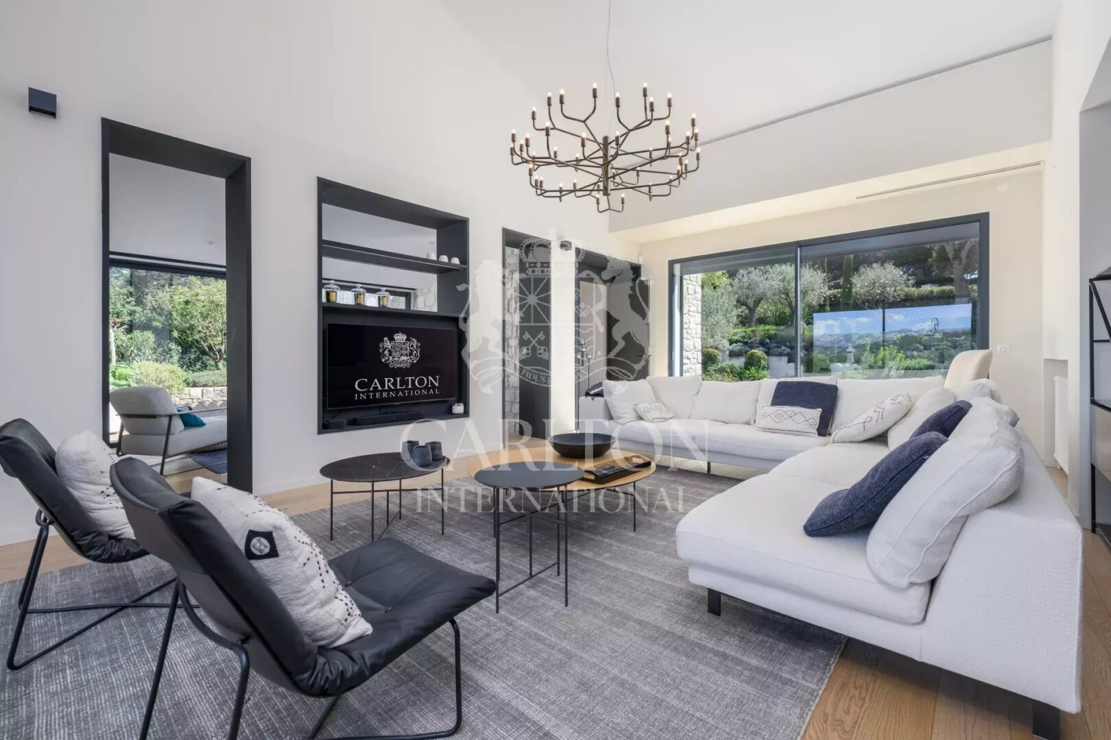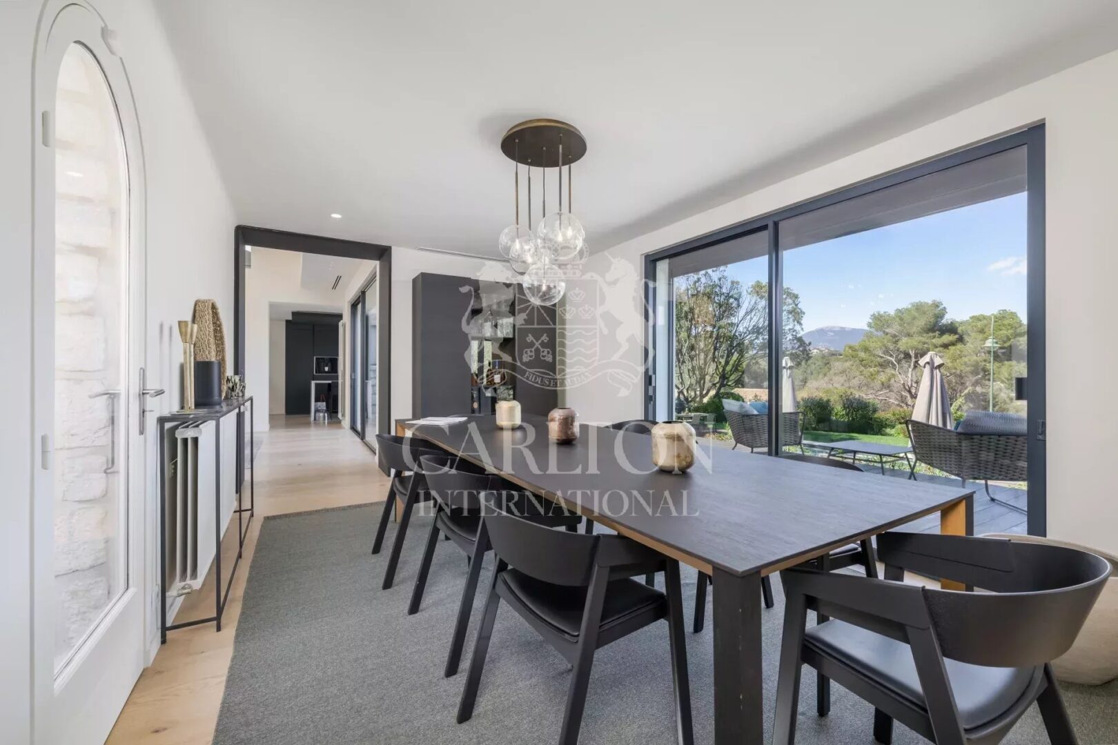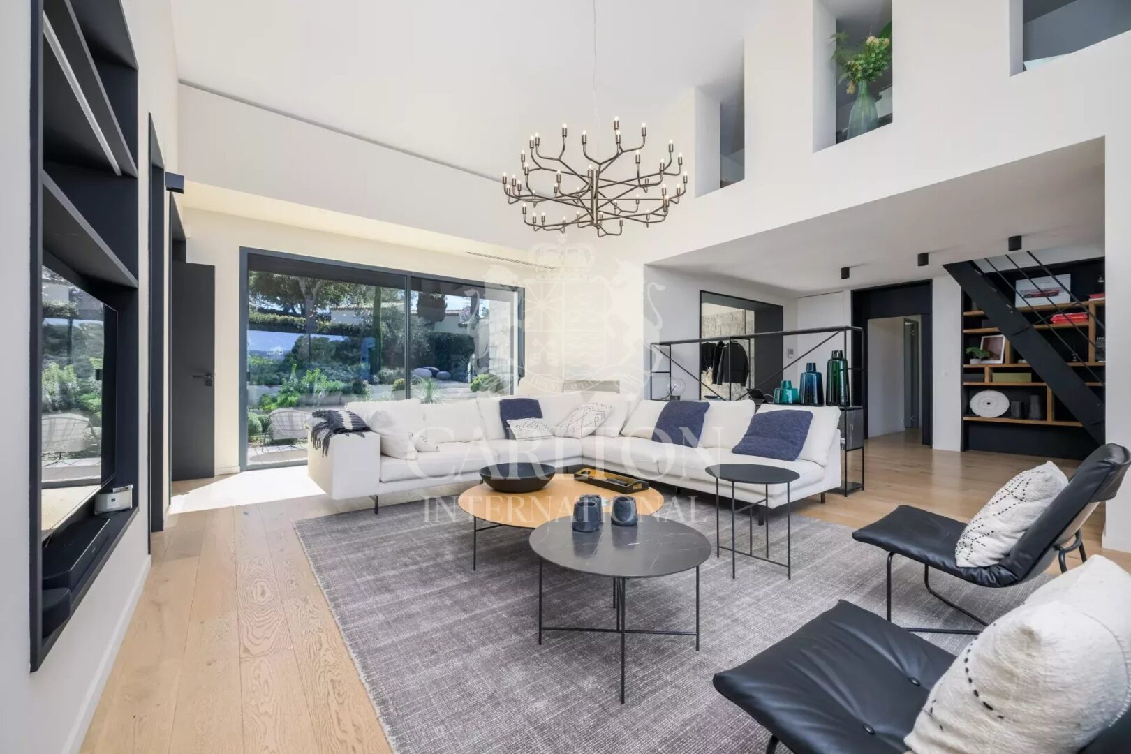 Großes, durchgehendes Wohnzimmer mit hoher Decke, das sich durch große und zahlreiche Fenster auf die Terrassen und den Garten öffnet, Wohnzimmer, Boudoir/Bibliothek, geräumige, moderne, offene Küche, Büro, 4 Schlafzimmer en suite mit Badezimmer, davon ein Master-Schlafzimmer. Keller mit Keller und Garage für 2 Autos.
