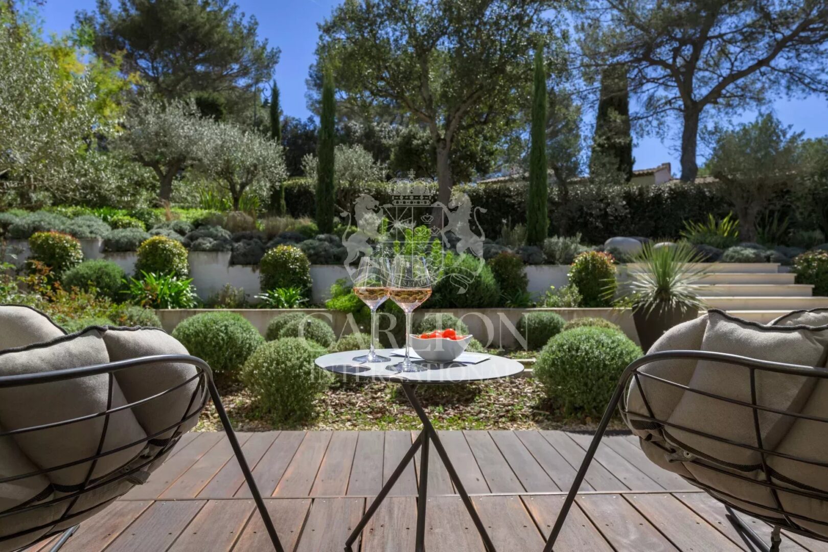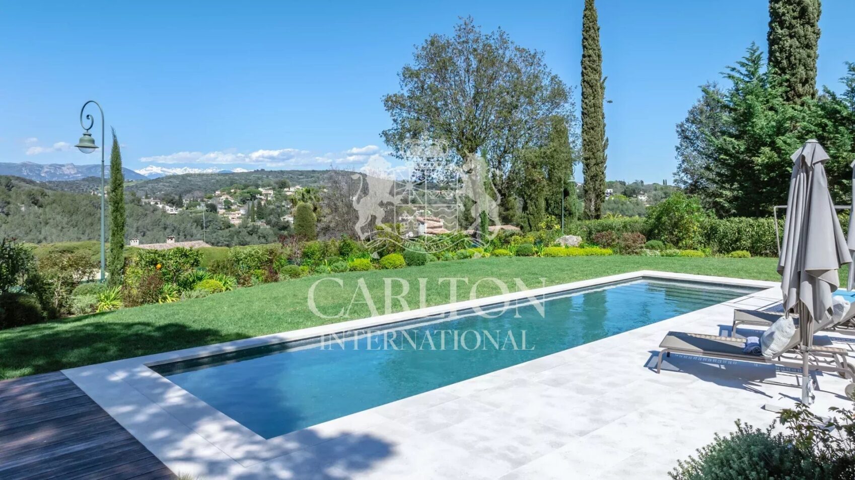 Wunderschöner, fast vollständig ebener Garten von 2.600 m2 mit einem großen Pool in absolut ruhiger Lage. Kein Vis-&-Avis und sehr schöner Panoramablick auf das Hinterland, die Hügel und die Berge.