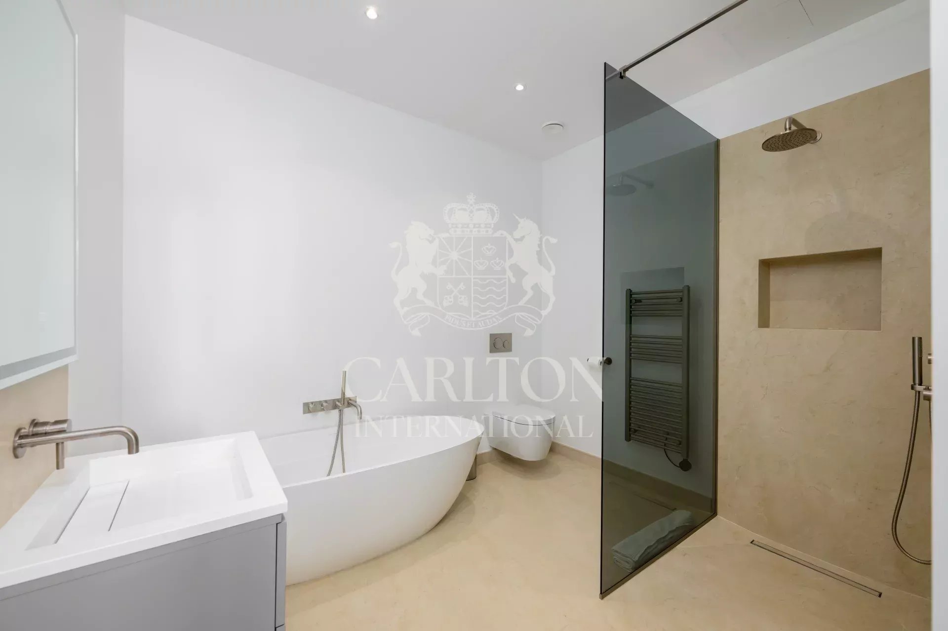 – Hauptschlafzimmer: Doppelbett, Doppelbett mit en-suite Duschräumen (2 Duschen) und Toiletten, Ankleidezimmer, Büro, private Terrasse mit Meerblick.