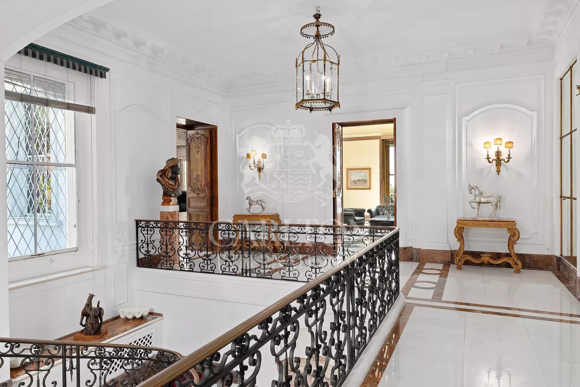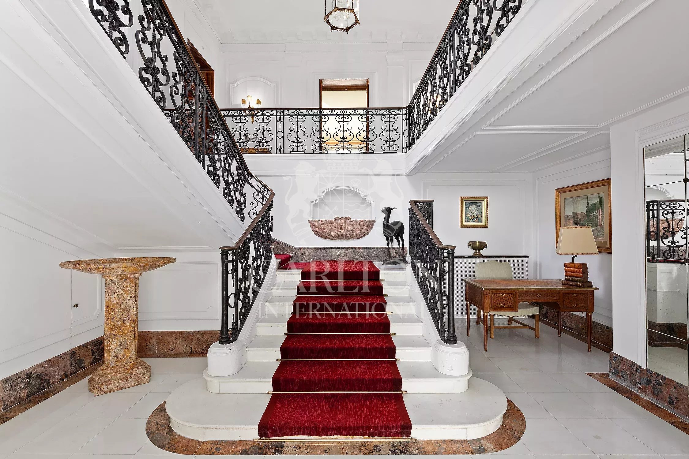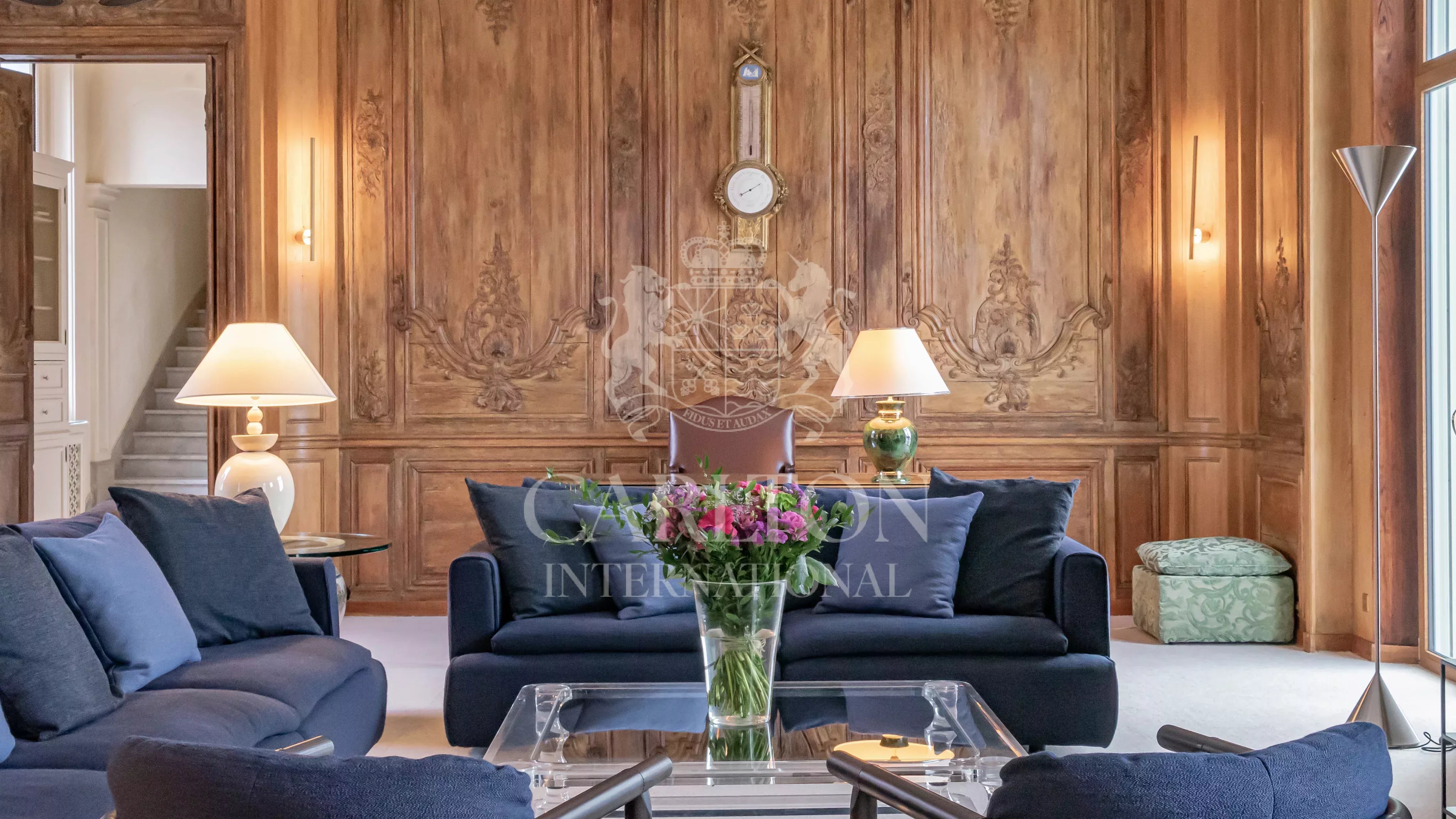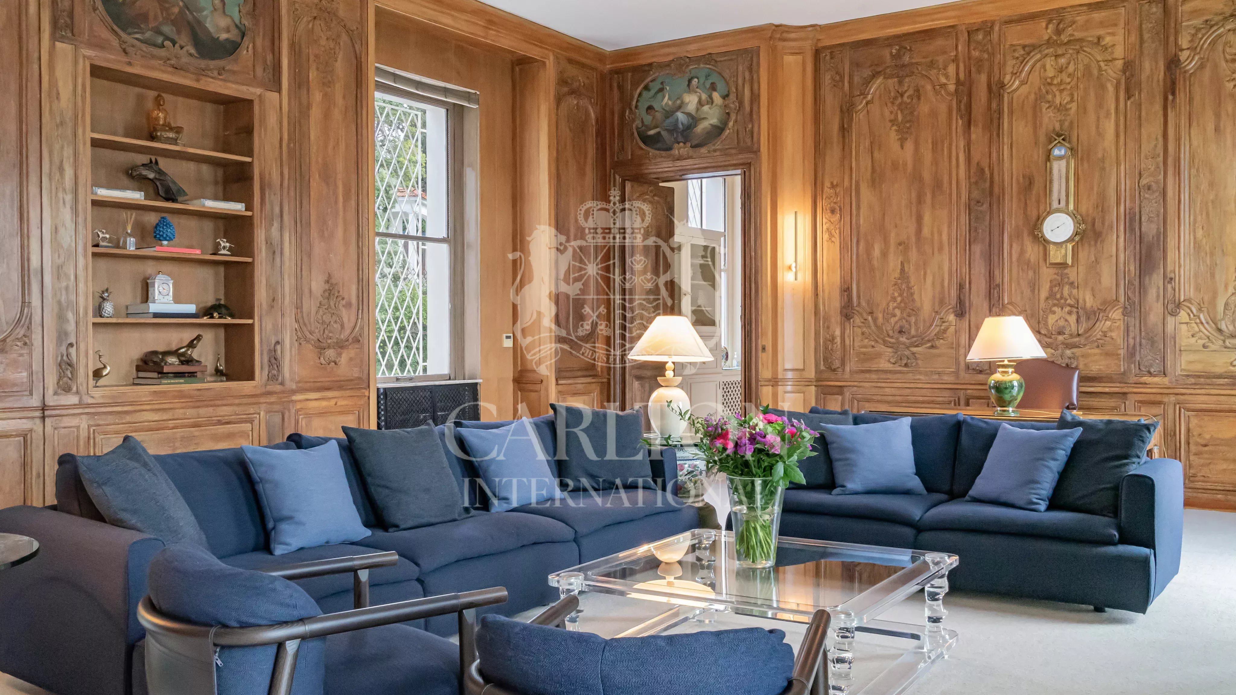 – Reception rooms comprising a double lounge, dining room and library. The 82 m² central living room with marble floor is equipped with plasma screen, satellite. The classic 65 m² library features precious antique woodwork covered with frescoes.
