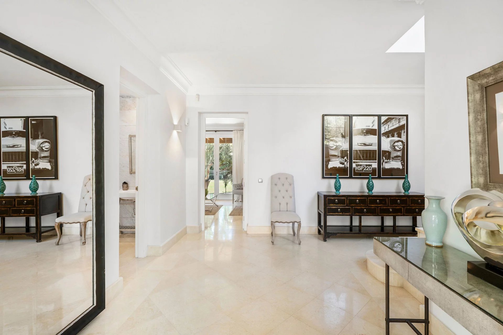 Eingebettet in die angesehene Enklave von Nagüeles, nur wenige Minuten vom pulsierenden Zentrum Marbellas entfernt, vereint diese Villa im mediterranen Stil zeitlosen Charme mit modernem Luxus. Sie ist weit mehr als nur eine Residenz – sie lädt dazu ein, das Leben in seiner schönsten Form zu genießen. Schon bei der Ankunft ist das Gefühl von Exklusivität unübersehbar. Zwei Zugänge – einer durch eine private Garage, der andere durch ein Fußgängertor, das zum repräsentativen Haupteingang führt – geben einen ersten Eindruck von dem raffinierten Refugium, das Sie erwartet.