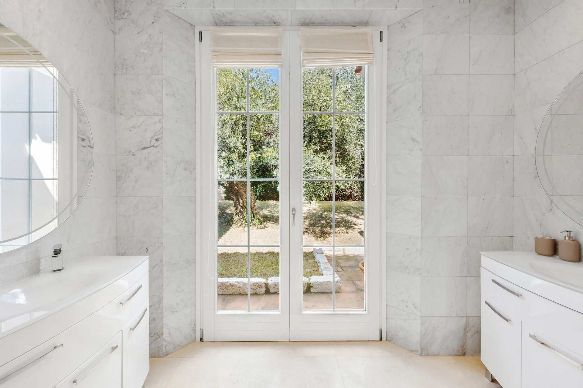 Das großzügige Wohnzimmer öffnet sich direkt zur überdachten Terrasse und ist ideal für ein Leben drinnen und draußen. Links vom Eingang befinden sich zwei geschmackvoll eingerichtete Gästezimmer, eines davon mit eigenem Bad, sowie ein weiteres voll ausgestattetes Badezimmer. Rechts liegt ein weiteres Schlafzimmer mit Bad en suite sowie die brandneue, moderne Küche mit angrenzendem Essbereich, der mit dem Wohnzimmer verbunden ist. Das Obergeschoss ist der luxuriösen Master-Suite vorbehalten, die über ein Ankleidezimmer, ein großes Badezimmer und einen privaten Balkon mit Blick auf den wunderschön angelegten Garten und den Pool verfügt.