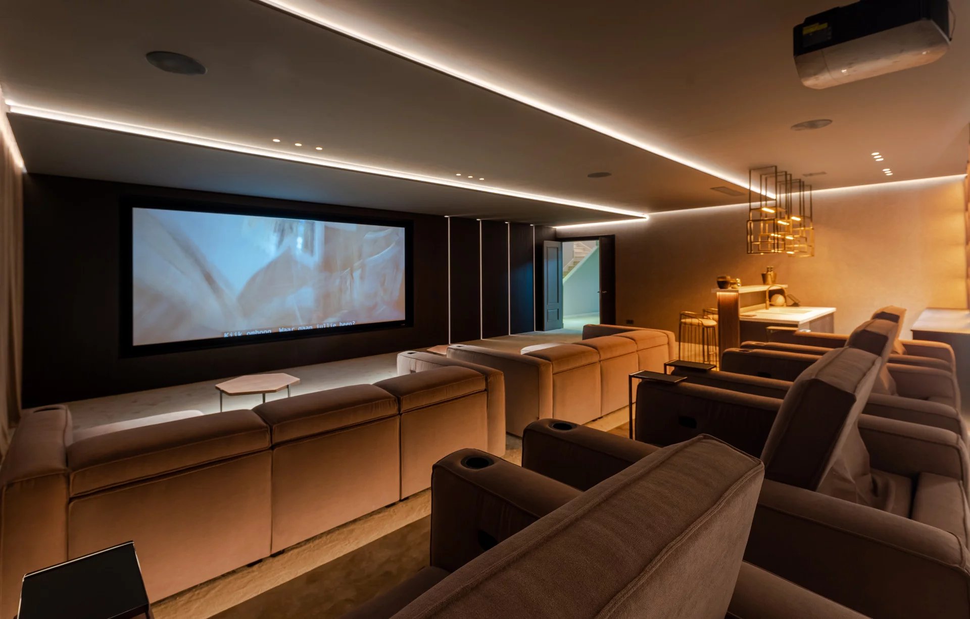 Unterhaltung und Wellness: Die untere Ebene ist ein Heiligtum von Freizeit und Wellness, mit einem hochmodernen Kinoraum, einem stilvollen Barbereich und einem professionellen Fitness-Studio von Eleiko ausgestattet. Eine verjüngende Sauna ergänzt die Wellness-Annehmlichkeiten. Diese Ebene umfasst auch zwei weitere en-suite Gästezimmer und eine geräumige Garage mit Kapazität für mindestens fünf Fahrzeuge.