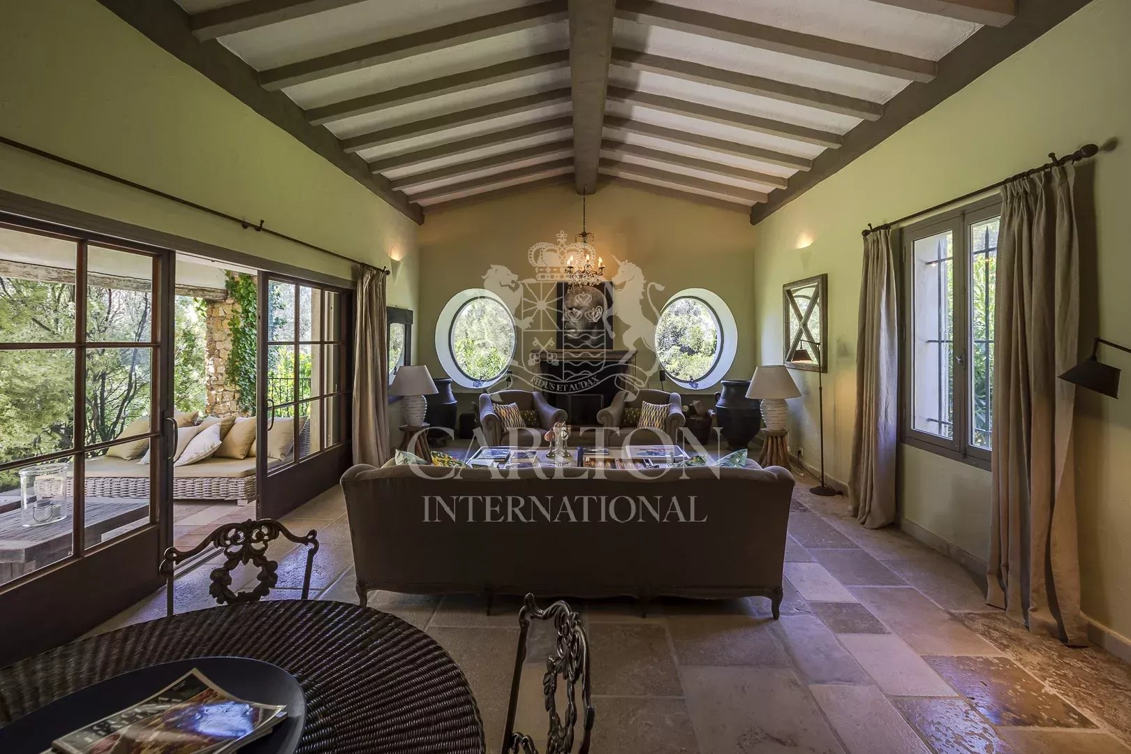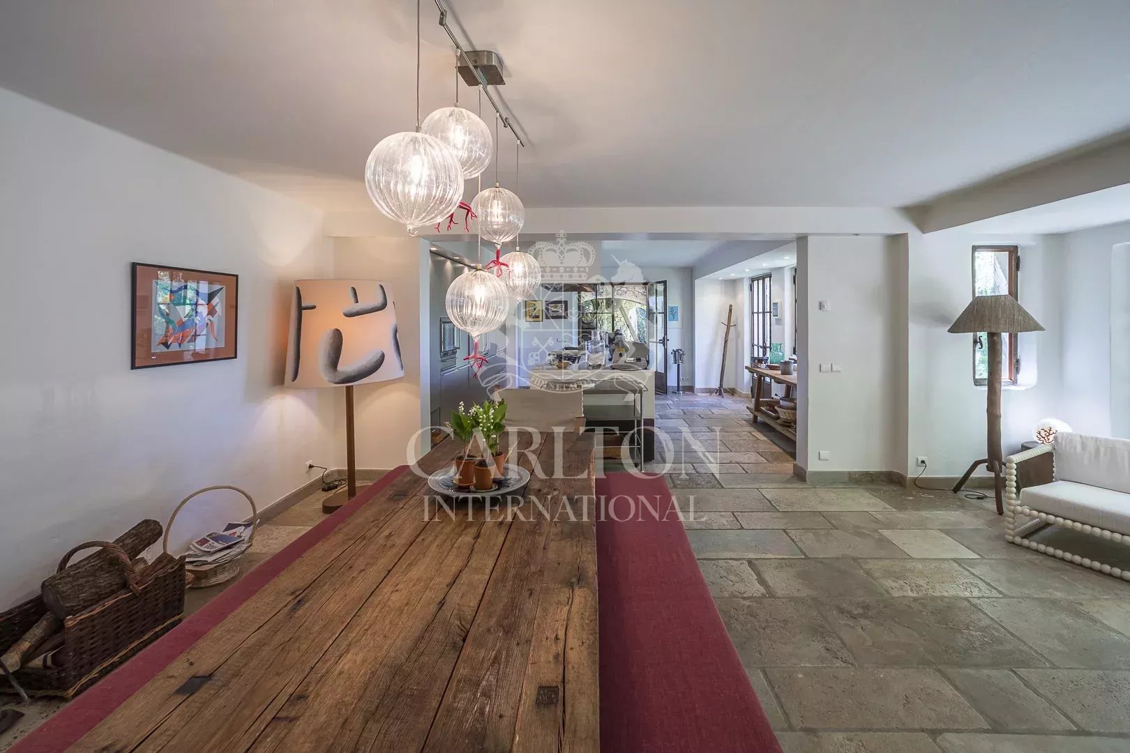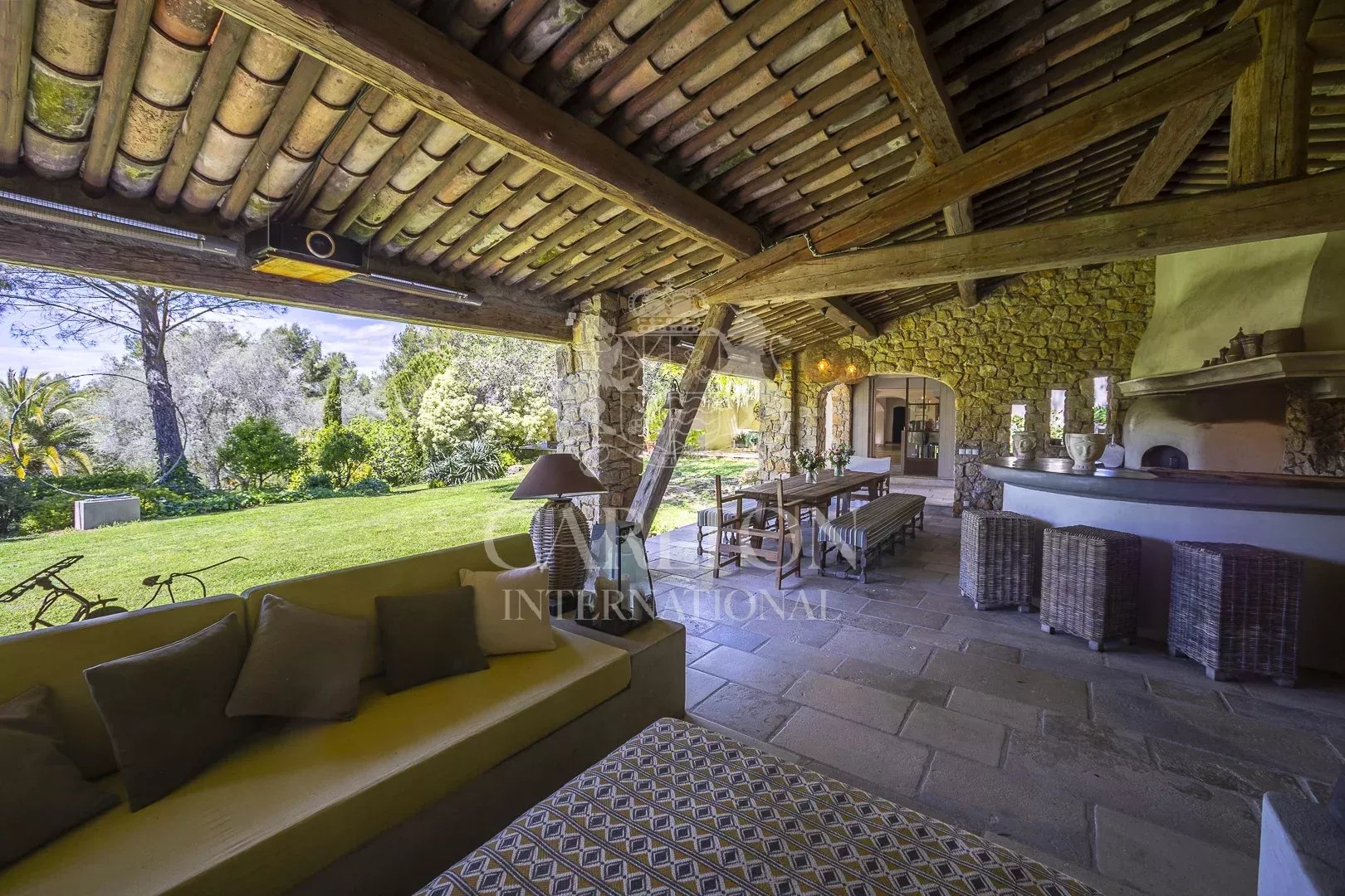 – Esszimmer mit Kamin und offener, voll ausgestatteter Küche (2 Backöfen, 1 Dampfgarer, 2 Geschirrspüler) mit Zugang zu einer Terrasse und dem Poolhaus.