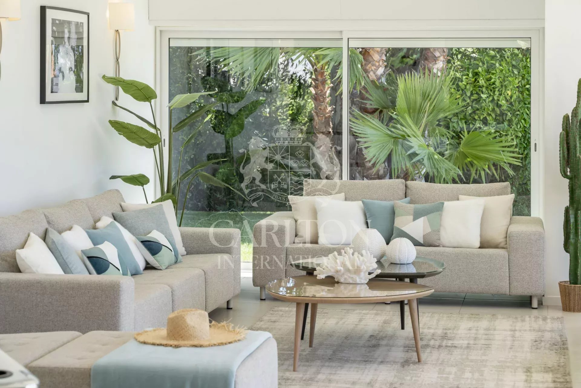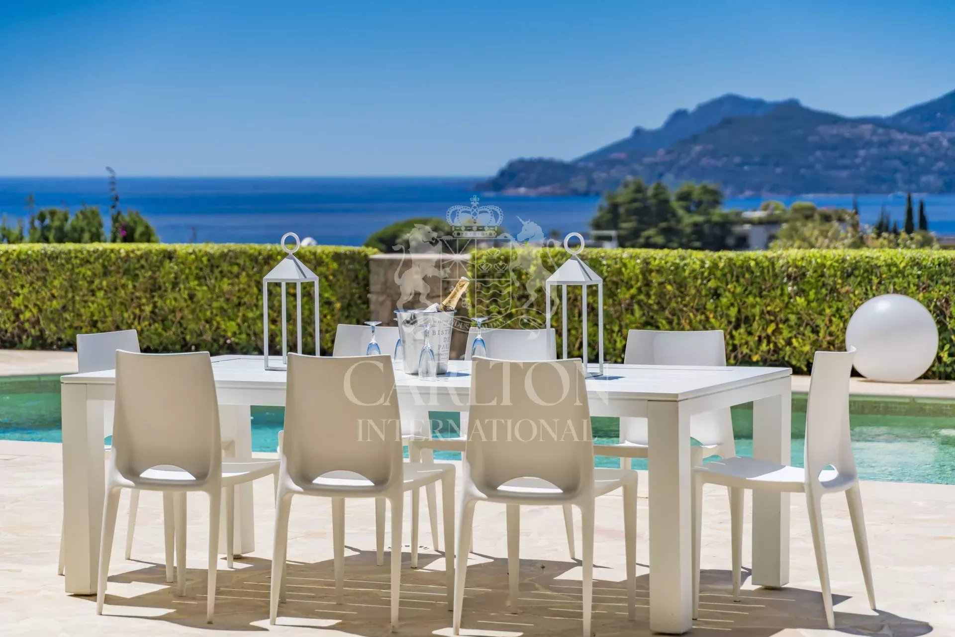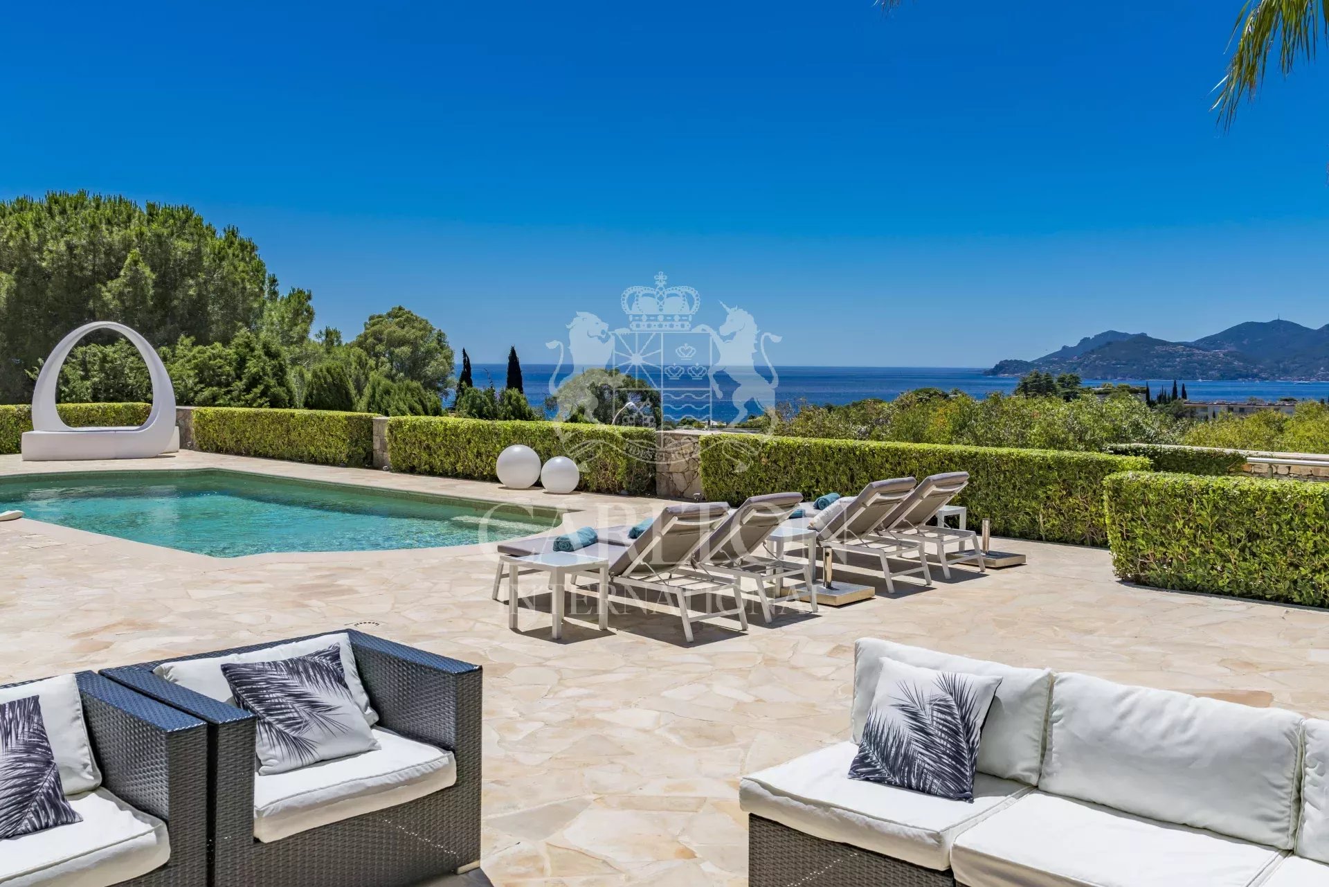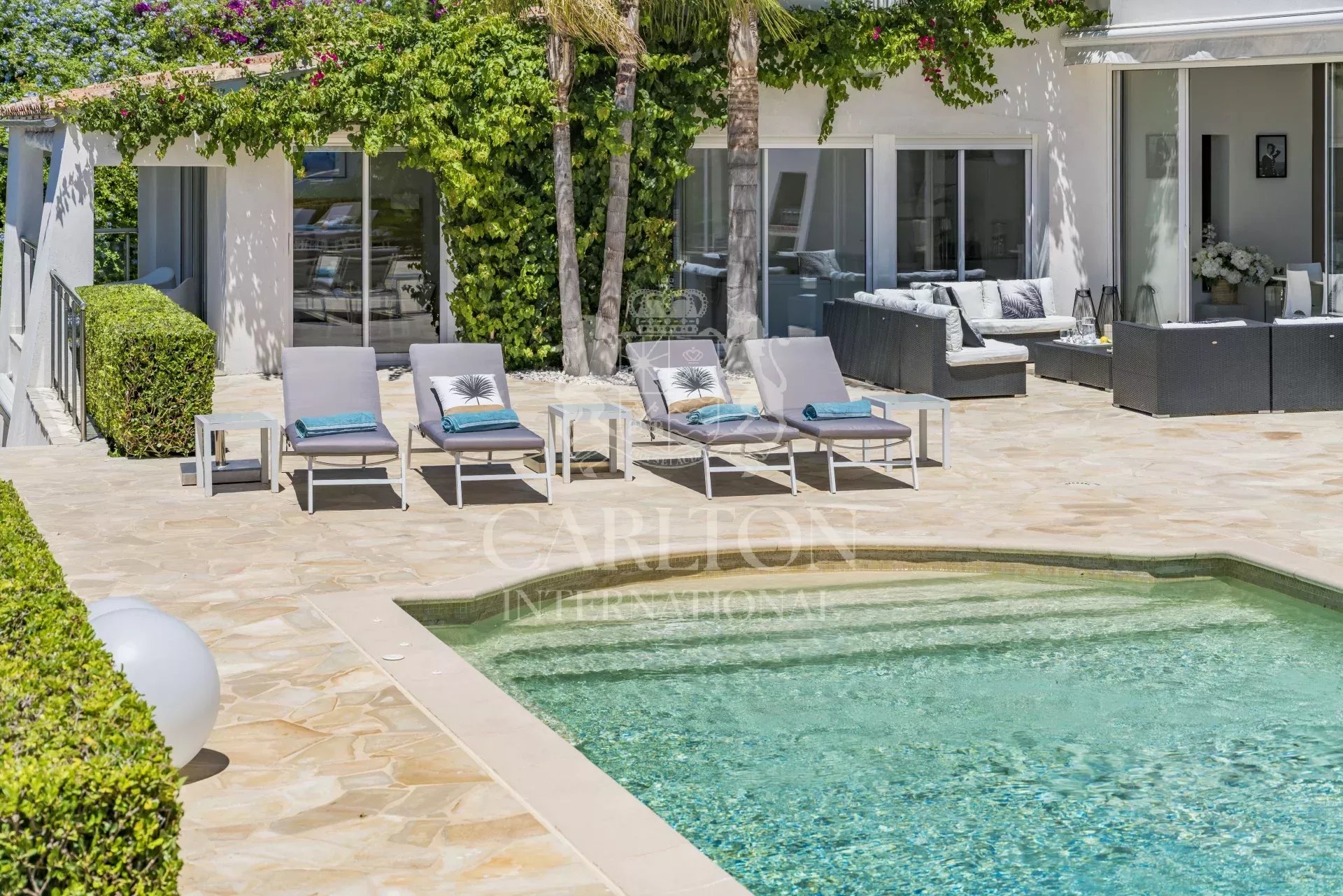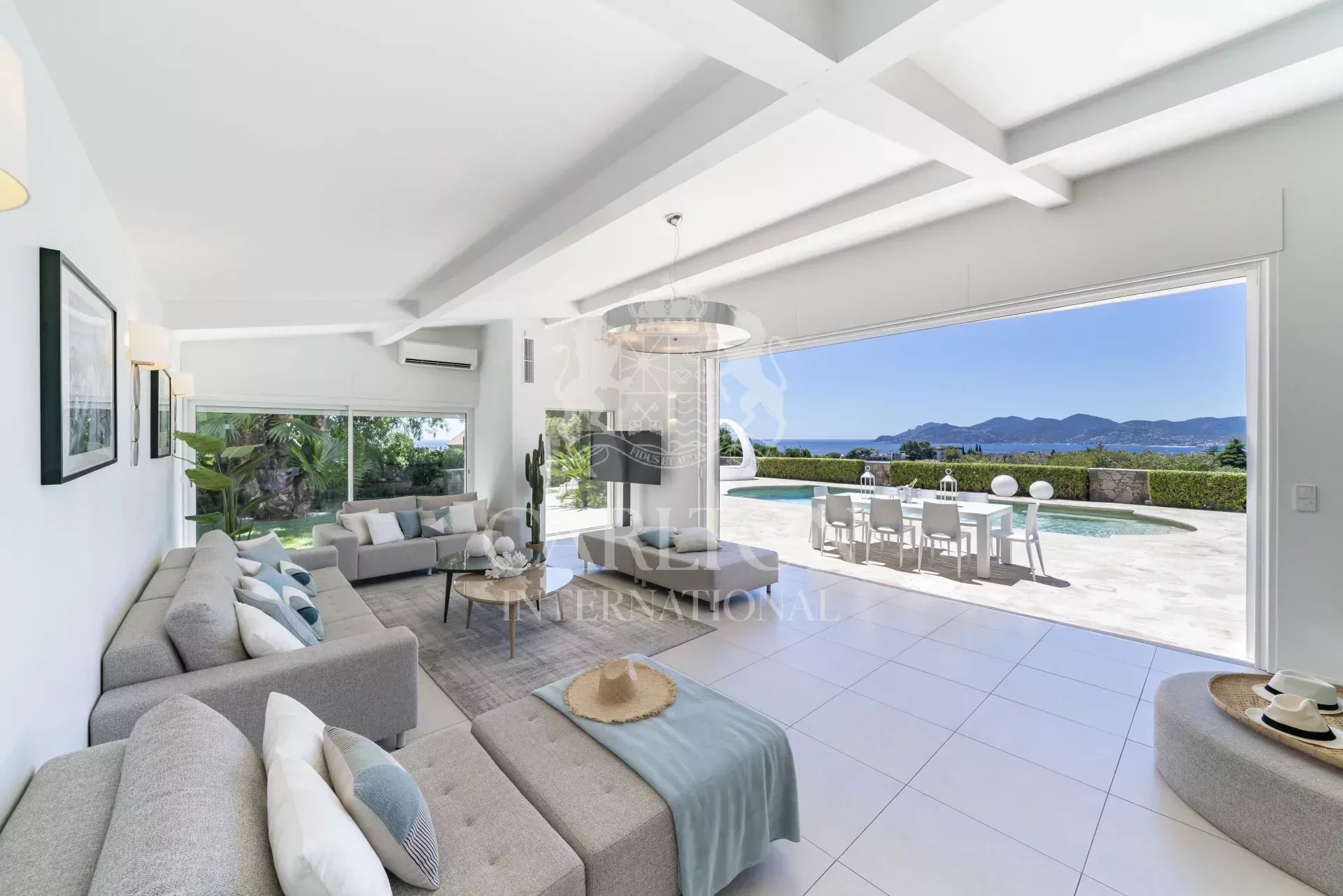 The lounge area is stylishly designed and decorated, with large descending windows that fill the villa with natural light and panoramic views of the azure waters of the Mediterranean Sea. From the lounge and pool area, you can look out over the magnificent Lerins Islands and the Esterel Mountains beyond. The living room opens onto a spacious terrace, perfect for outdoor dining, and overlooking the glistening swimming pool (adjustable current to swim against). The pool can be heated and treated with salt, ensuring that guests can enjoy a refreshing swim all year round.