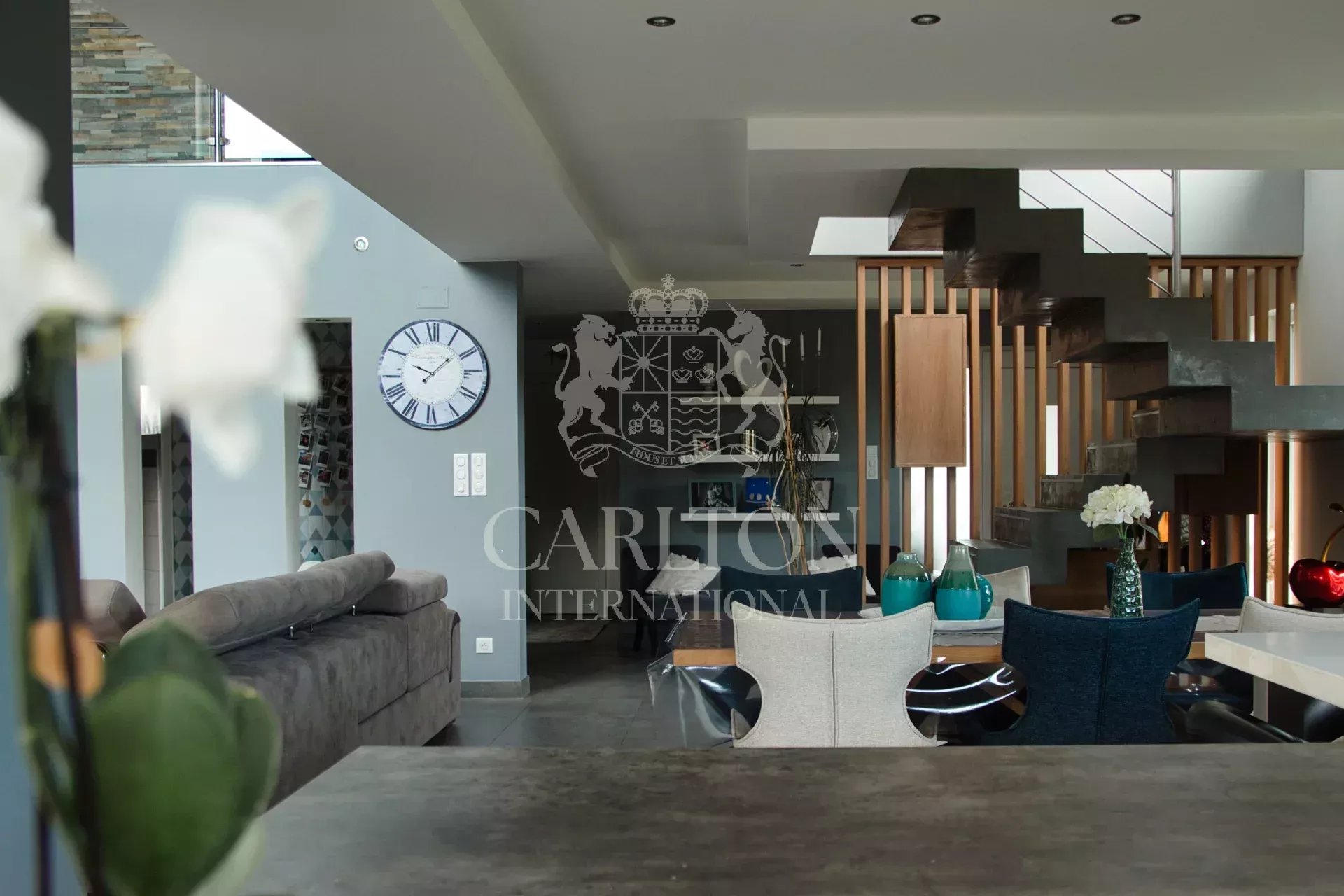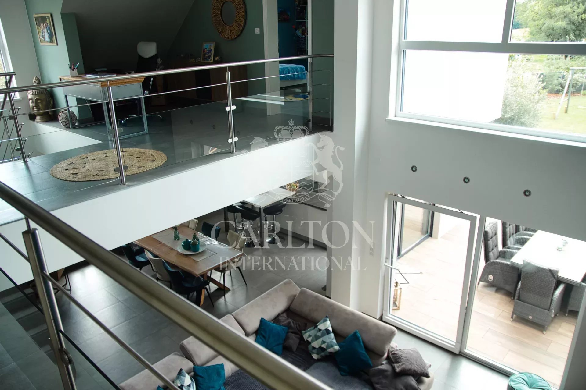 The house combines the conveniences of a large residence with separate areas for parents on the ground floor and children on the upper floor. There is a quiet office space or a sunlit gallery with an open view of the beautifully landscaped garden.
