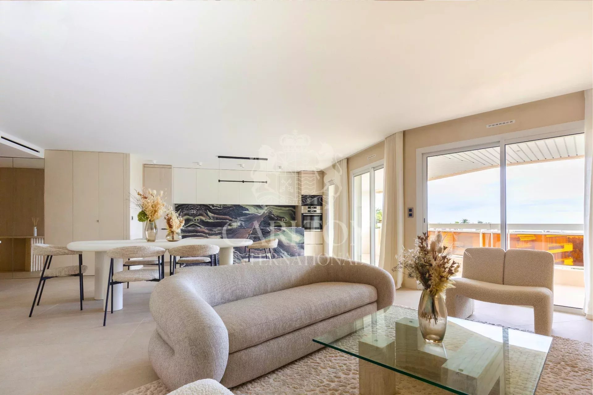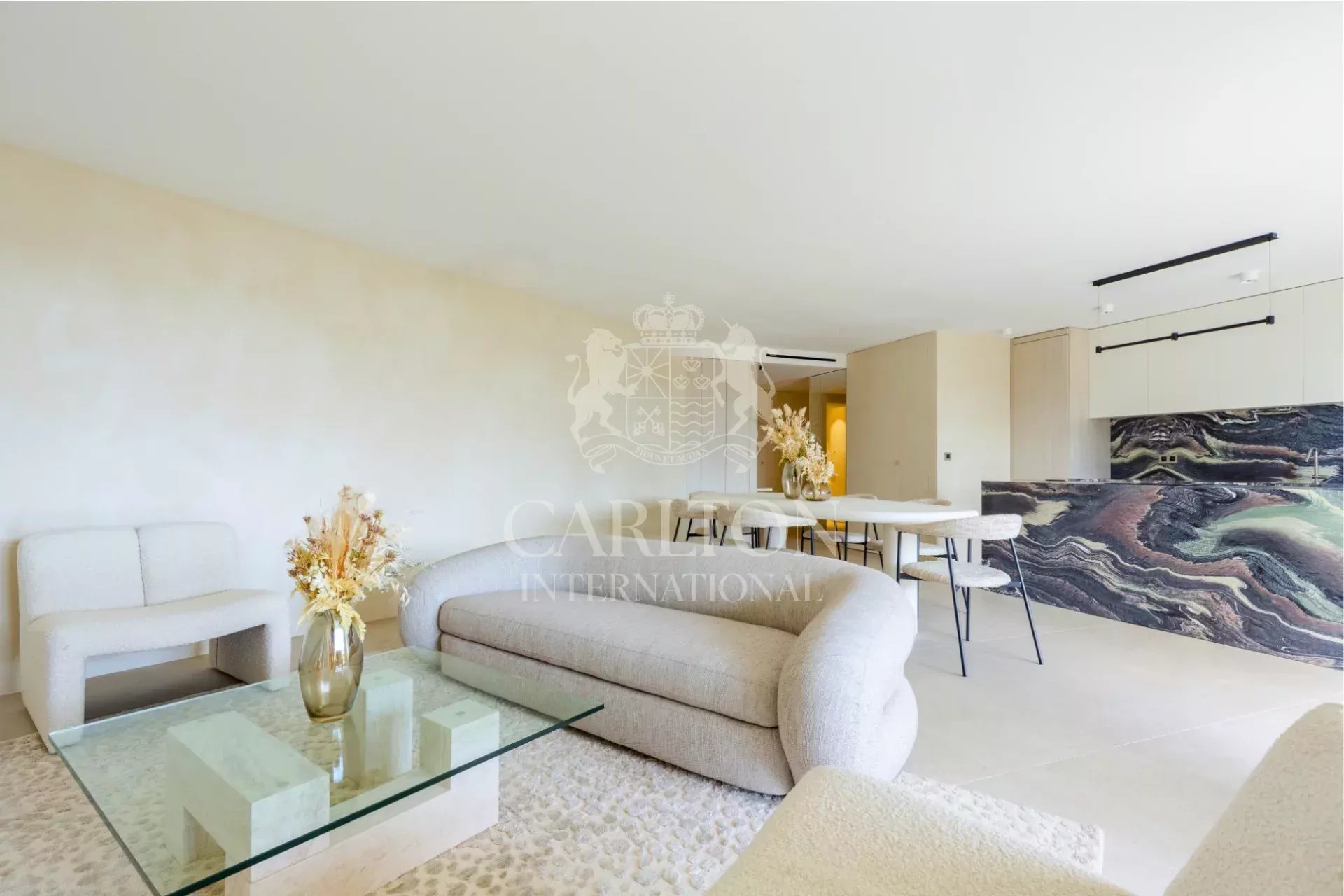 Conceived down to the smallest detail, the apartment blends noble materials and optimized design, offering remarkable comfort thanks to a wealth of custom-designed storage space, a generous 45 m² living room bathed in light and a terrace with sea views for alfresco lunches all year round. A true invitation to serenity.