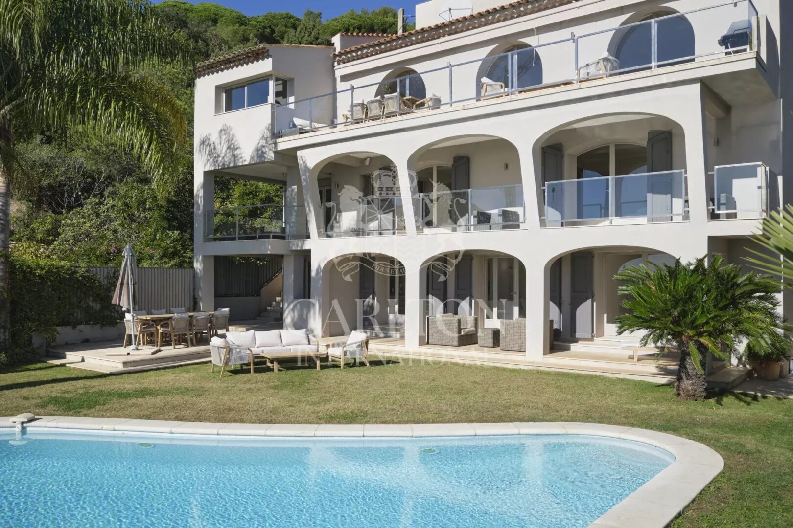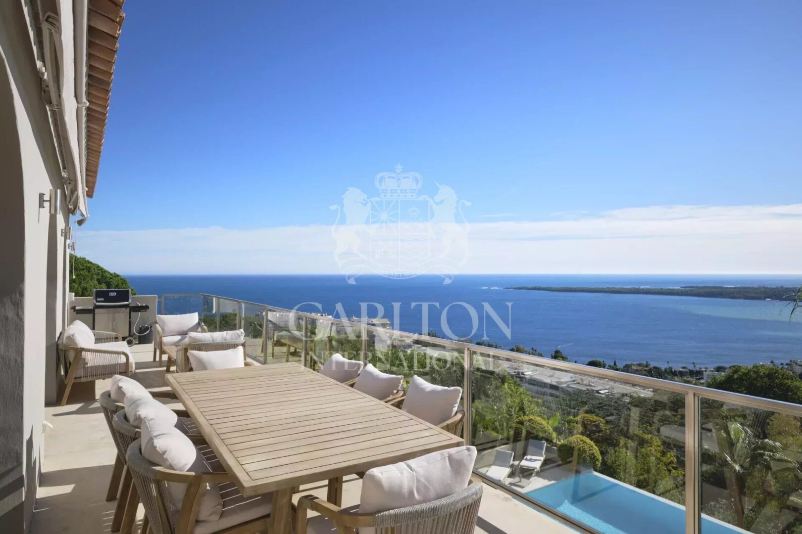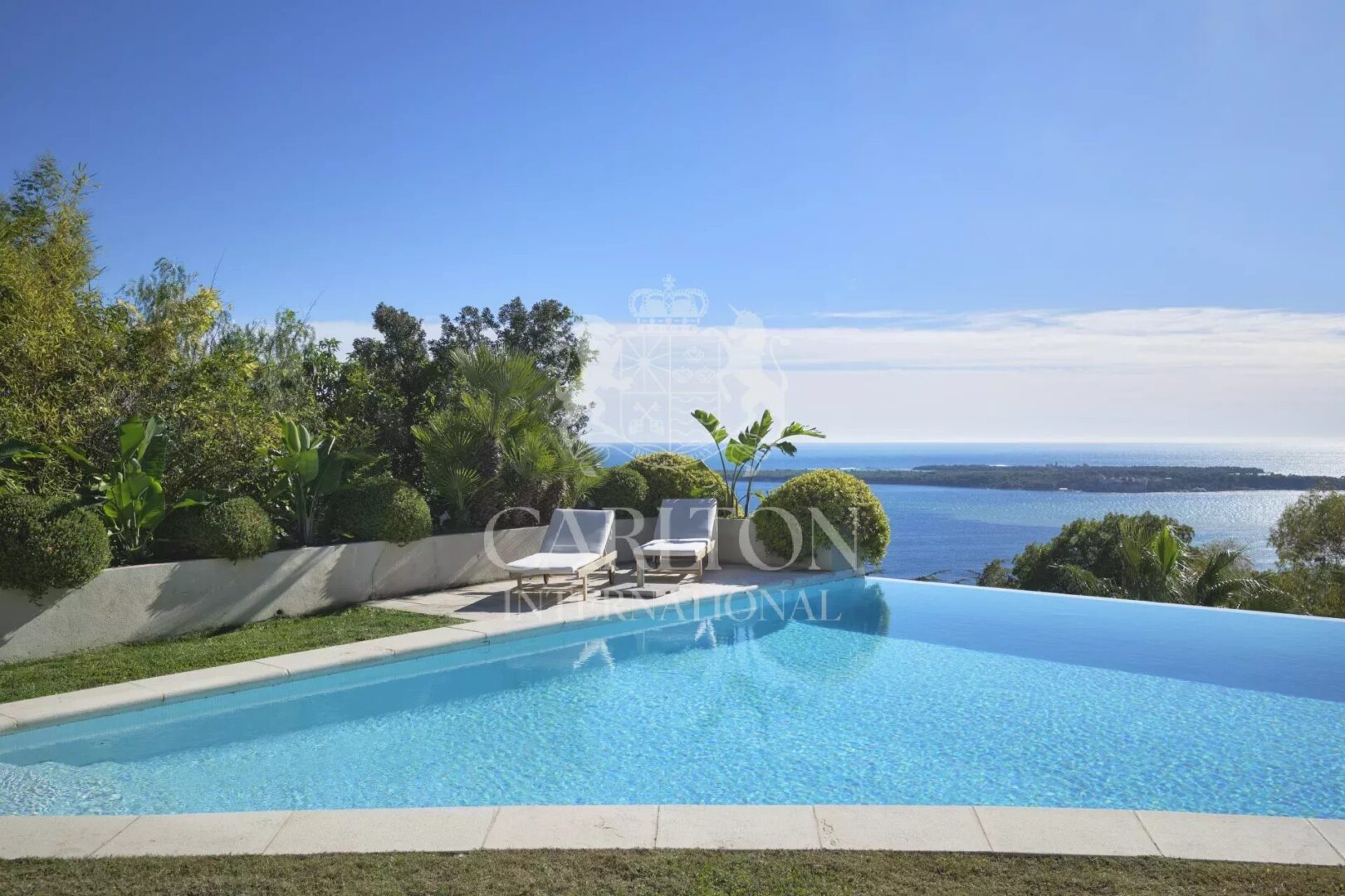 Set in a dominant position with its 825m2 flat garden planted with trees and featuring an infinity pool, this modern-style villa has been fully renovated to a very high standard and boasts spacious living areas offering the utmost in comfort and privacy.