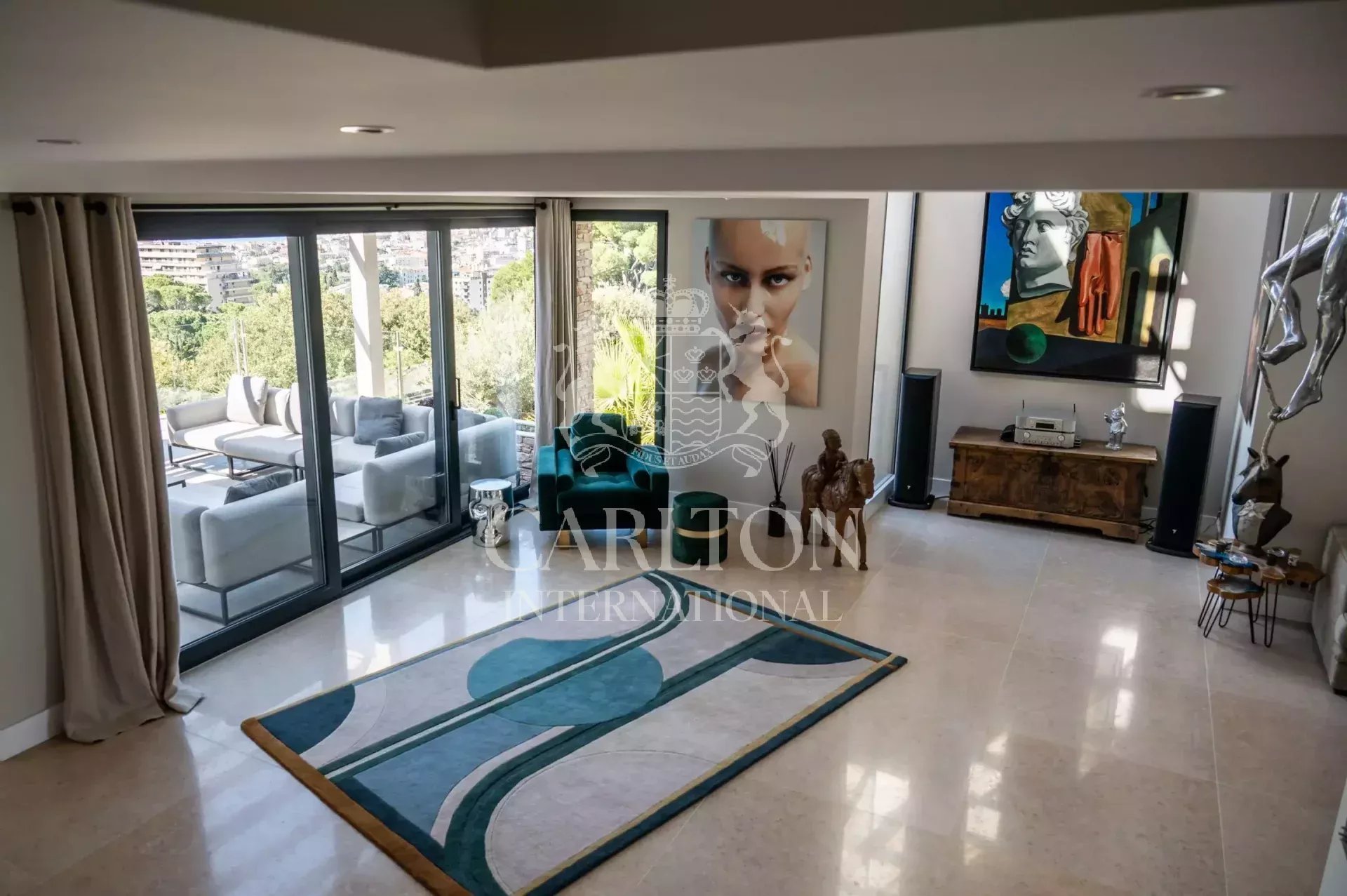 Large, bright reception area with TV corner and triple-exposed living room opening onto two terraces with lounge and summer dining room, overlooking the Bay of Cannes.