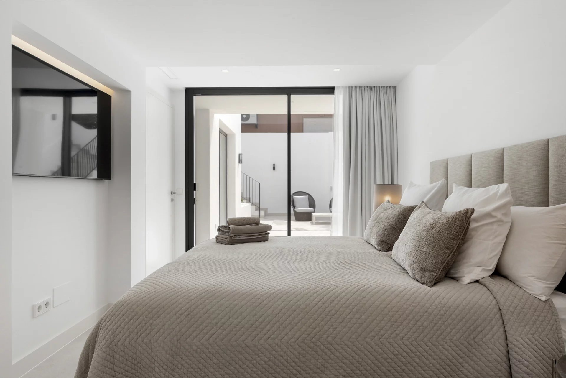 Wooden staircase leading to a top-floor suite with private terrace & panoramic Mediterranean views