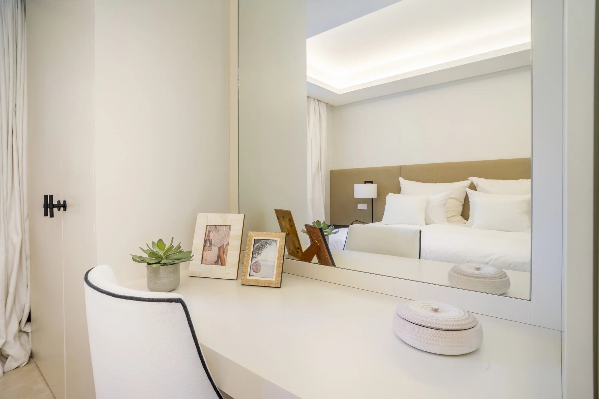 Spanning 188m² and facing southeast, the residence welcomes you with a spacious open-plan layout that includes a state-of-the-art kitchen outfitted with custom oak cabinetry and top-tier Gaggenau appliances. The kitchen seamlessly flows into an elegant lounge area that extends onto a generous 48m² terrace, ideal for alfresco dining and relaxation while enjoying serene views of the community pool. All three bedrooms feature en-suite bathrooms, each designed with high-quality stone finishes and bespoke wood accents, creating a modern yet timeless ambiance.