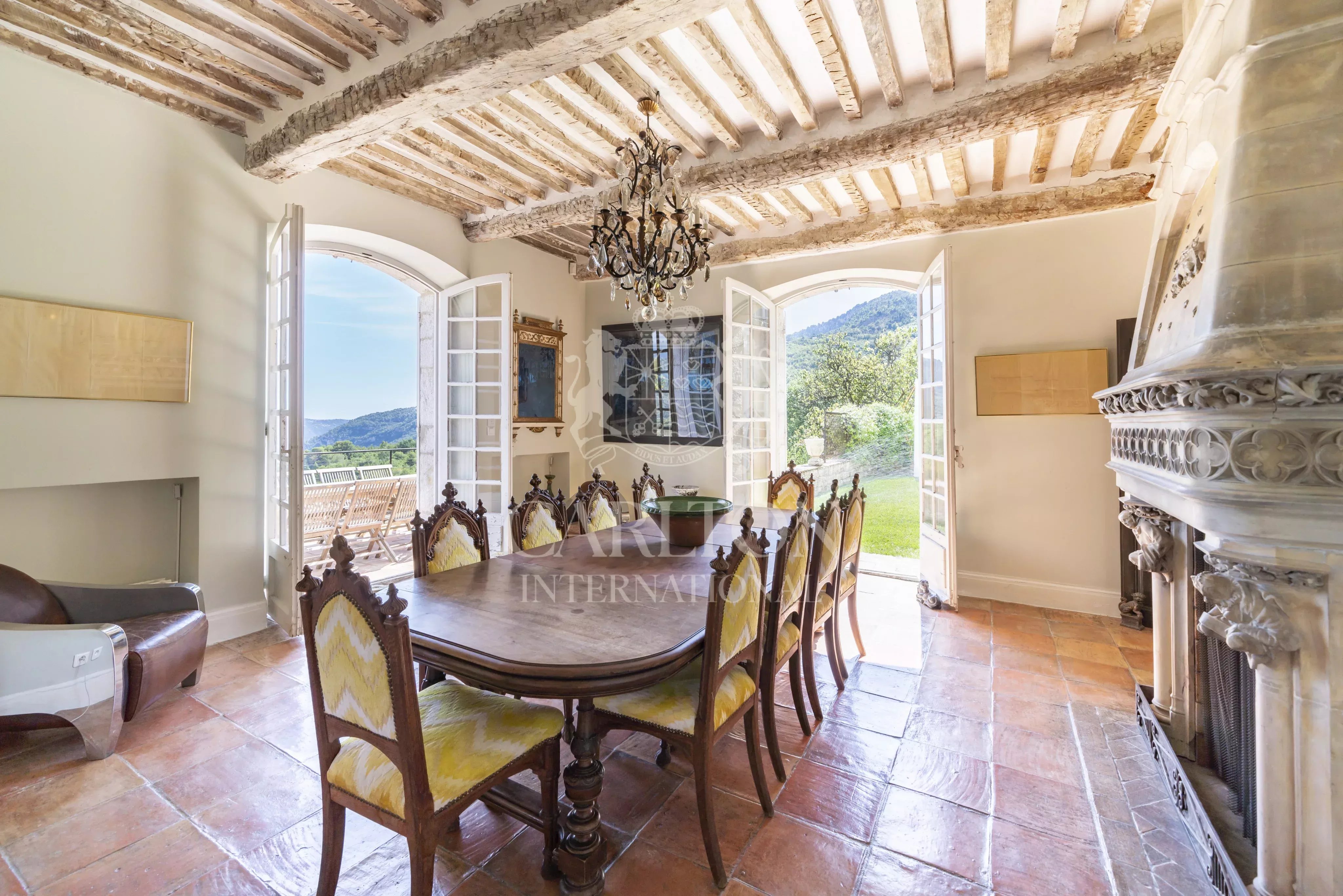 From the entrance, the tone is set: generous volumes, noble materials, and a warm atmosphere. The reception areas, flooded with light, include a refined salon, a library with a bar and a fireplace, and a characterful dining room opening onto a large terrace with panoramic views of the Var valley.