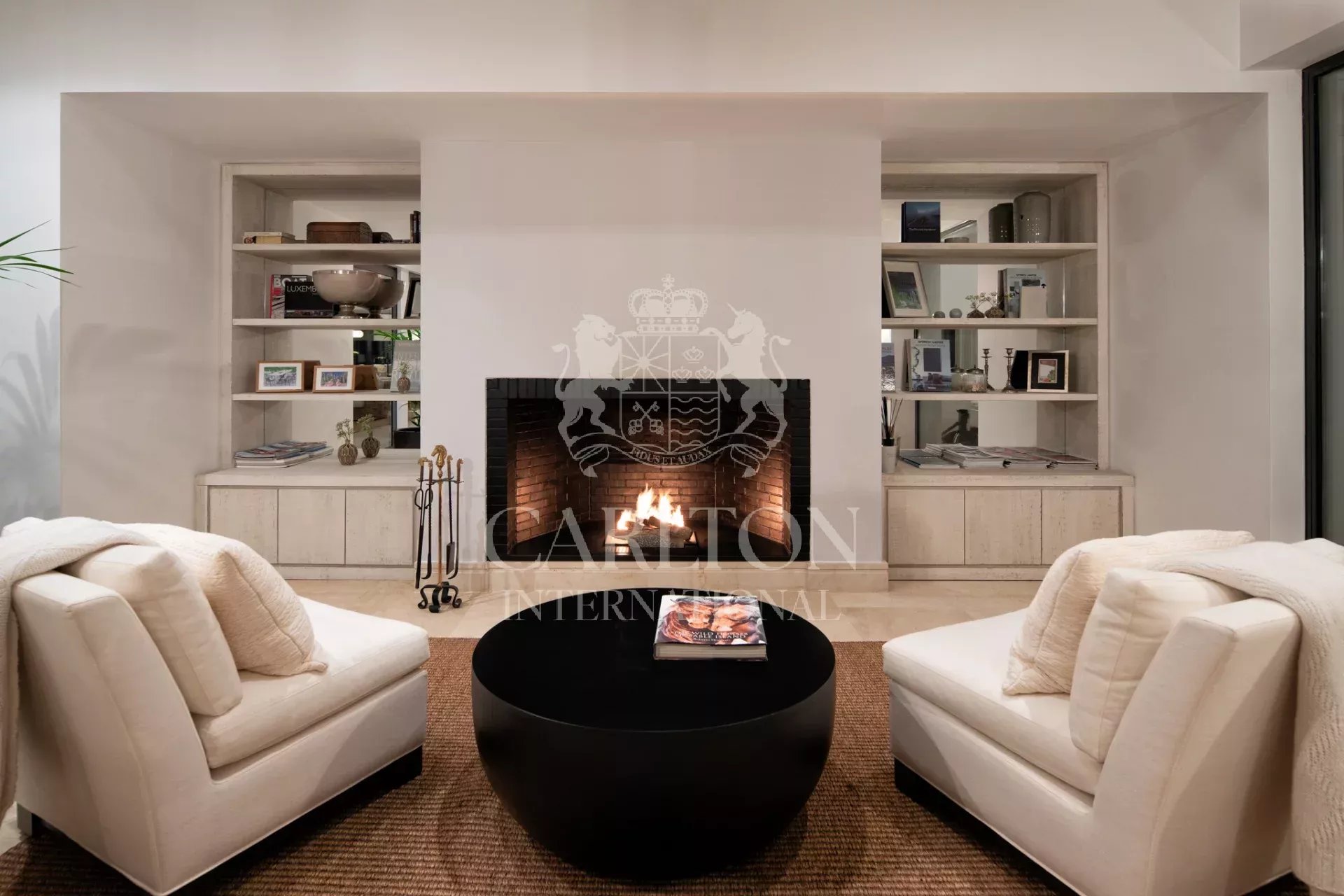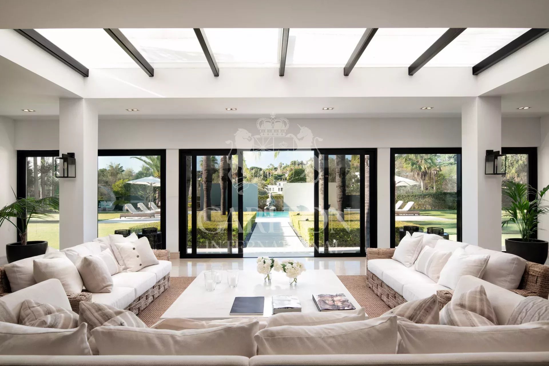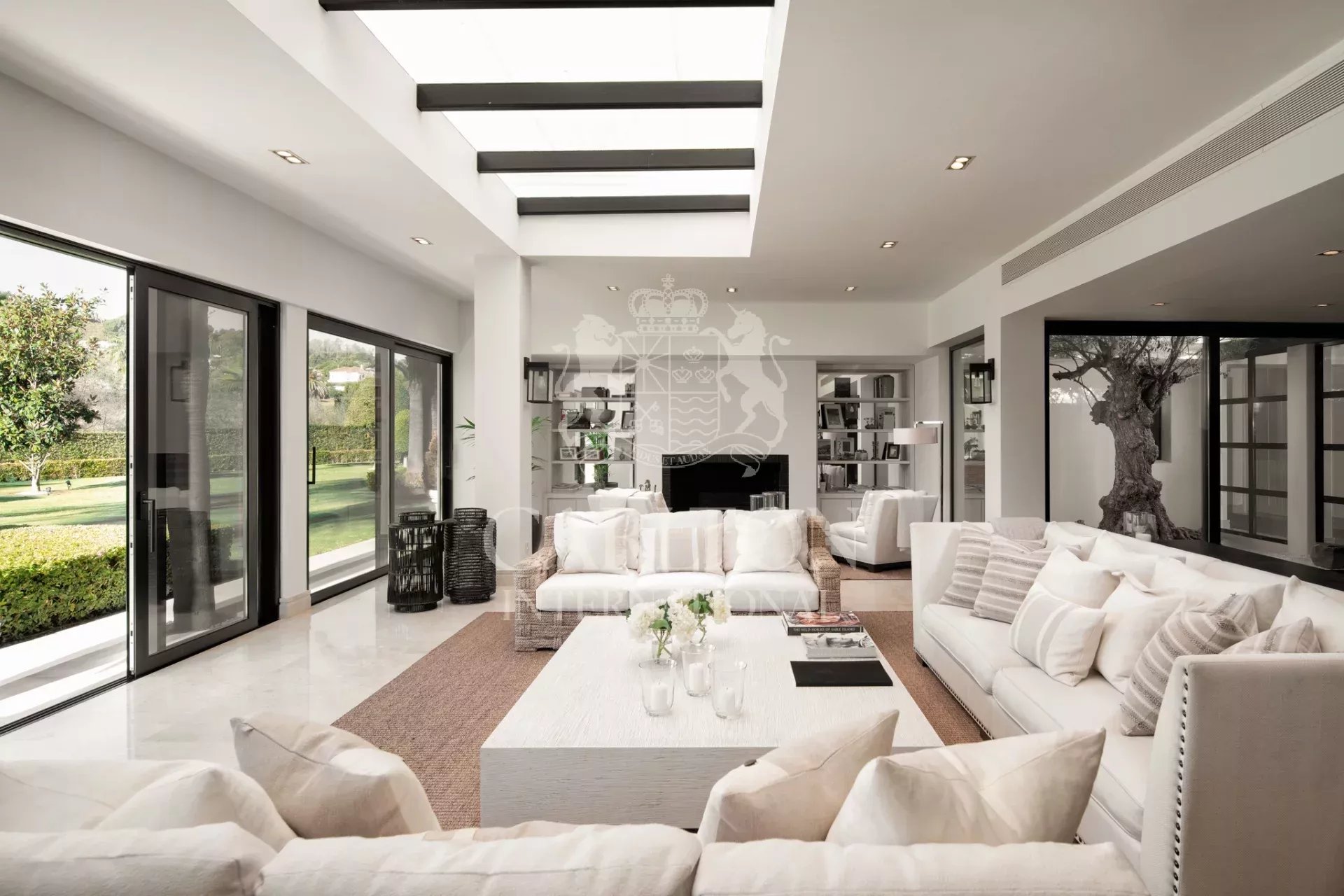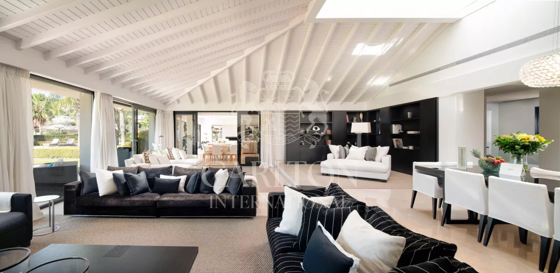 This amazing home has all the features one might expect from such a high-end villa and is complete with a cinema room, both indoor and outdoor pools, a gym and fitness suite, and plenty of sunny alfresco dining terraces. It is almost impossible not to unwind here! Choose whether to dine in the covered outdoor dining area or sip a cocktail at the poolside bar. Inside, you’ll find multiple lounges, each with a unique design creating a different aura to enjoy depending on your mood. The professional kitchen is perfect for any chef, with tasteful black units, plenty of room to cook and forming part of an open plan dining area where the black and off-white tones coordinate perfectly throughout.