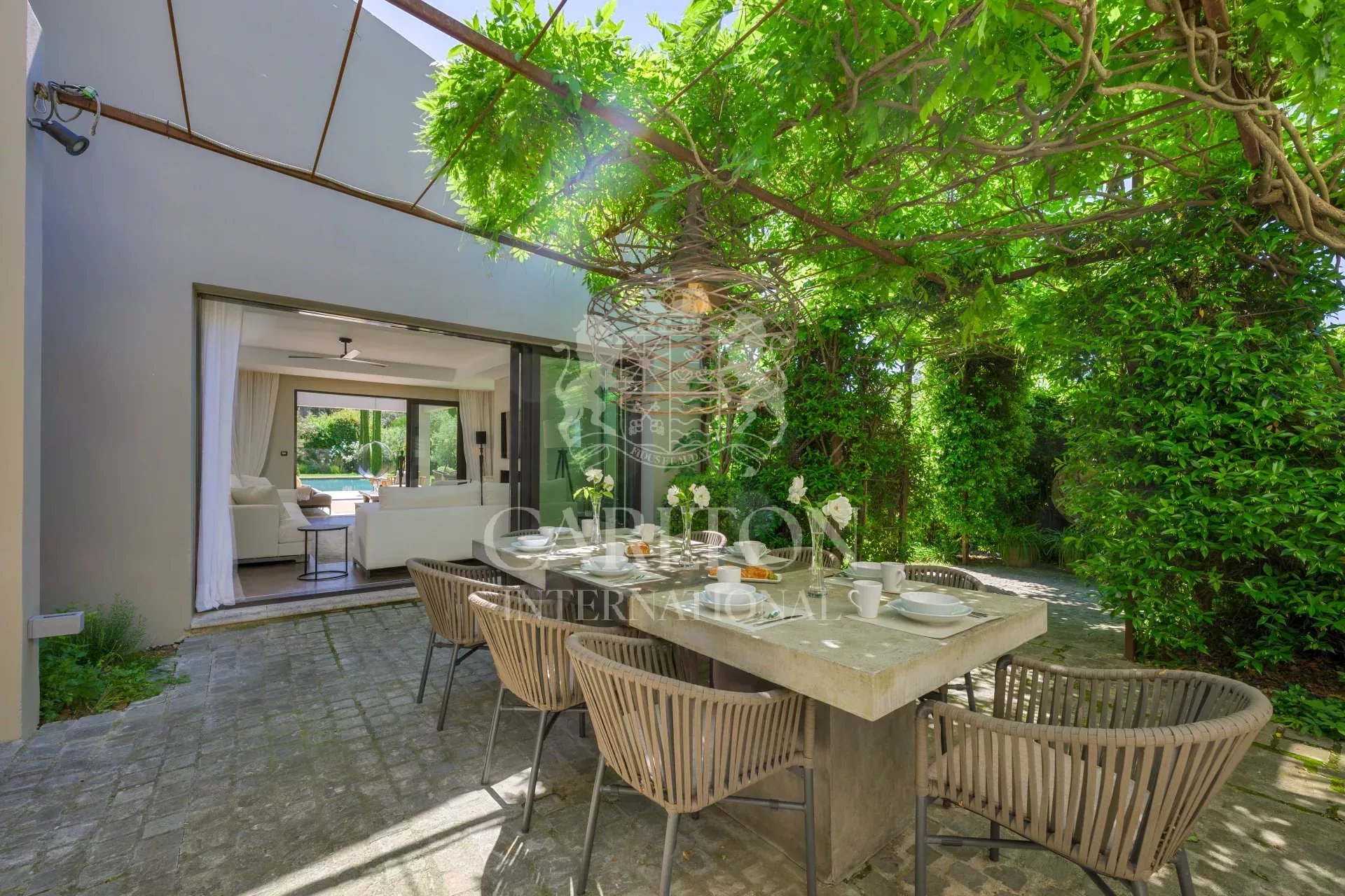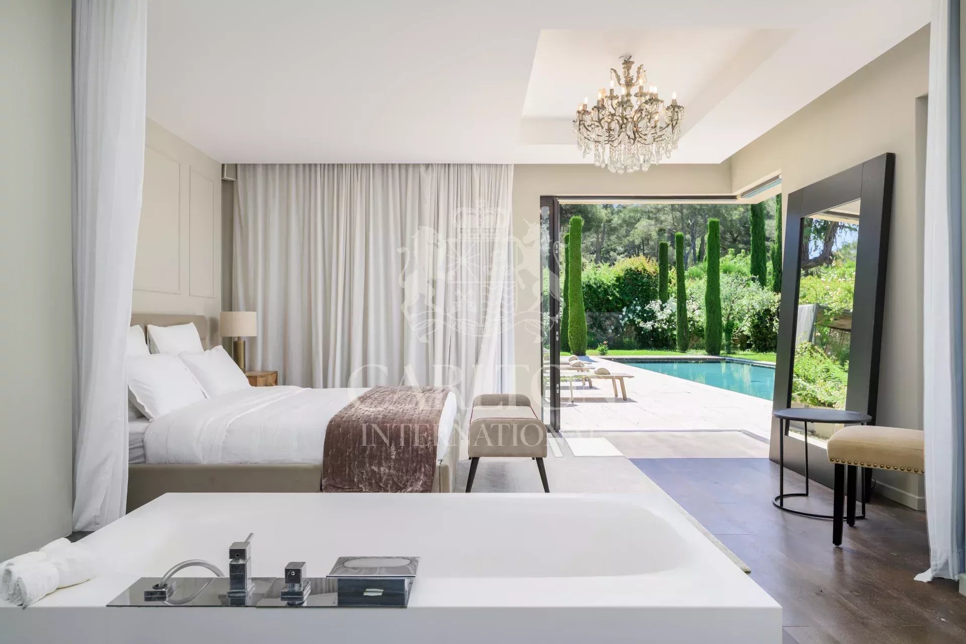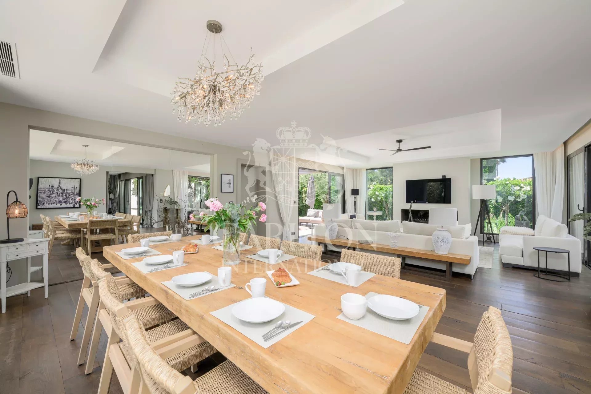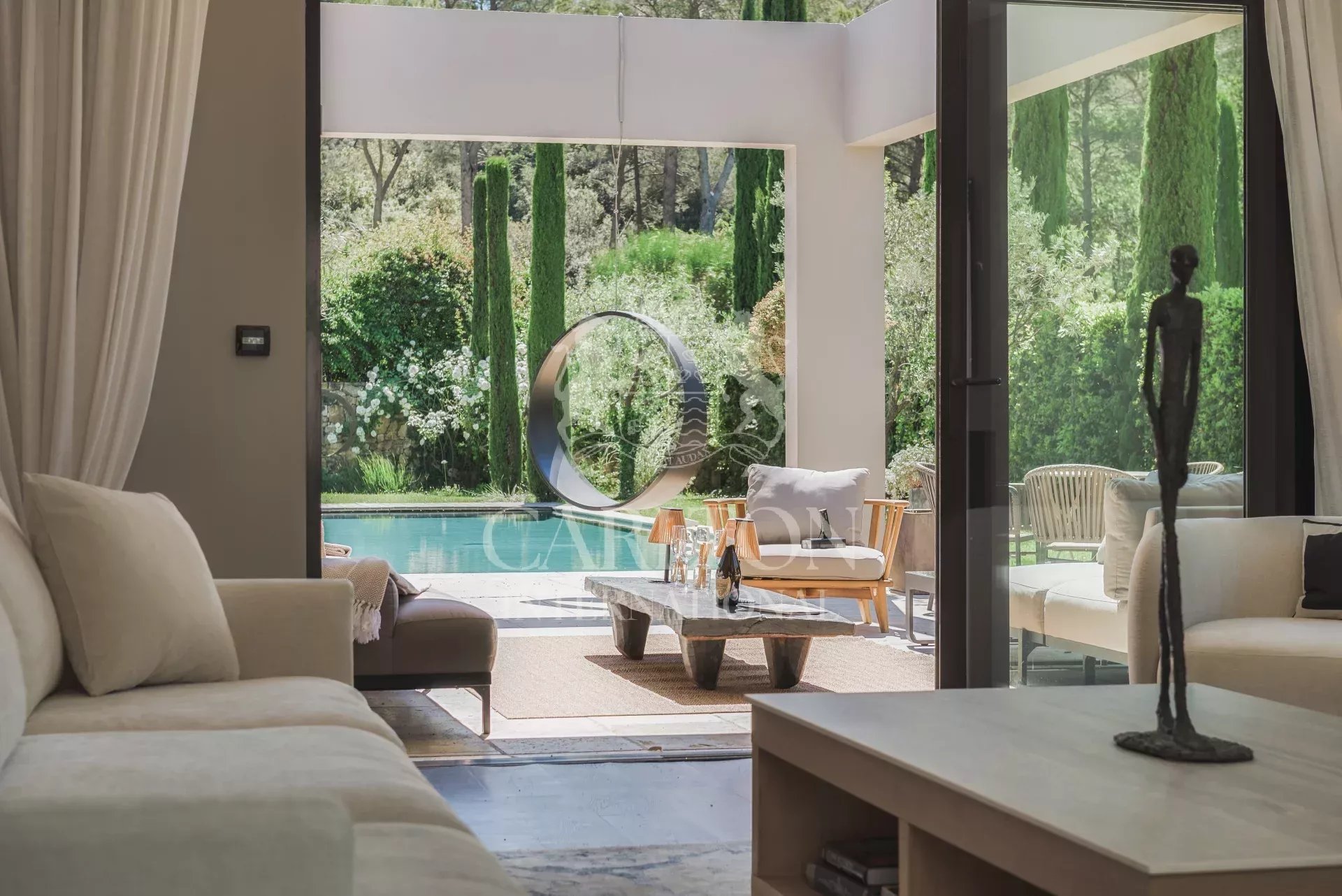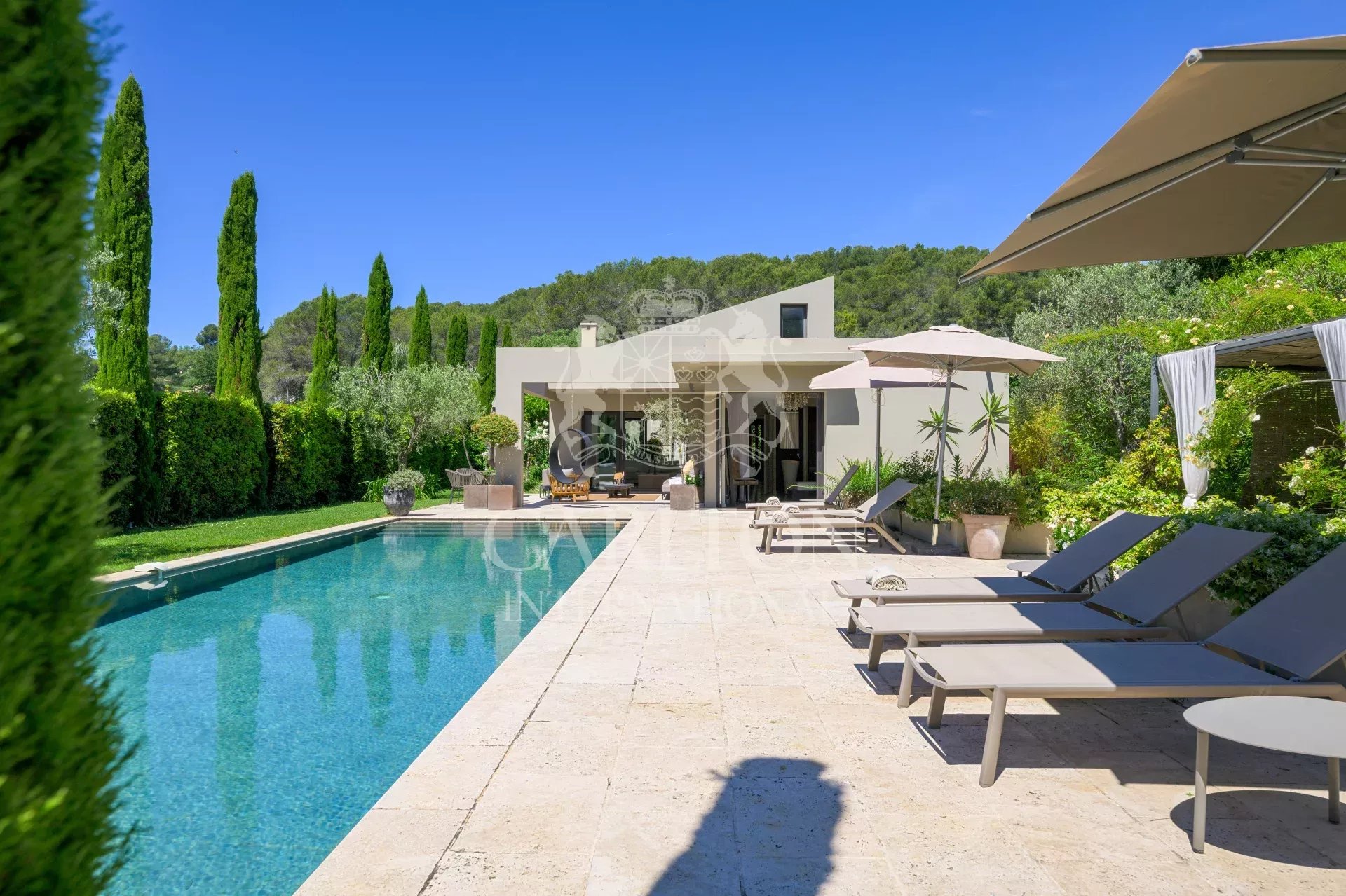 Located in Mougins, one of the most sought-after villages on the Côte d’Azur, this villa enjoys a privileged setting combining calm and proximity to the hustle and bustle of Cannes. Just a few minutes from the beaches and the center of Cannes, it offers the perfect balance between dynamism and art of living.
