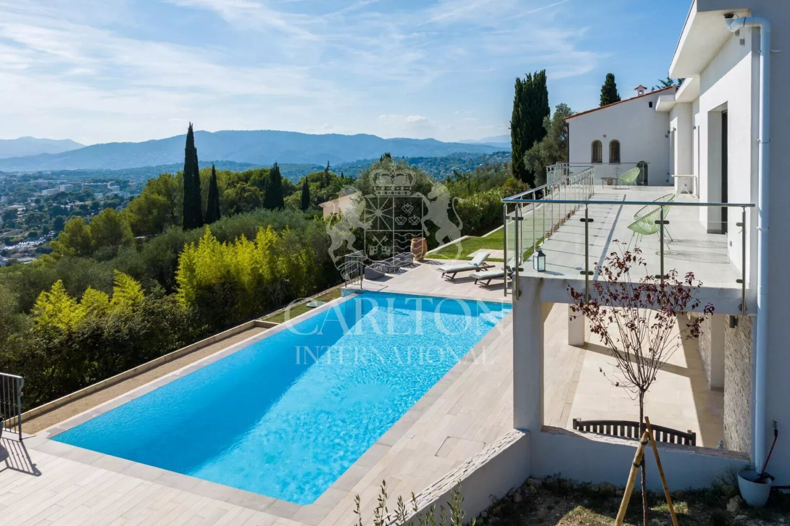Nestled on the hills of Mougins, this stunning contemporary property bathed in natural light, offers panoramic views on Cannes and the sea.