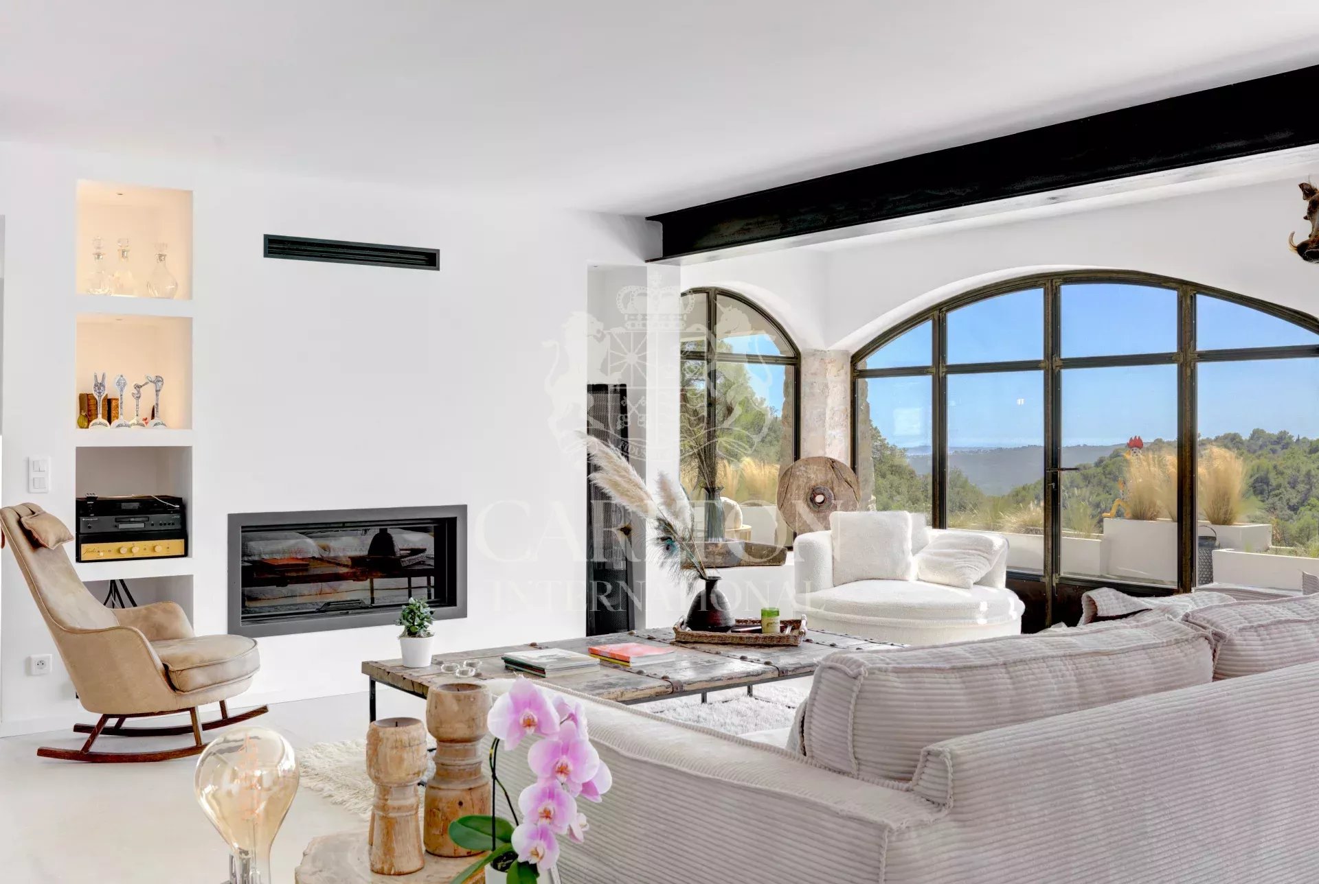 The first floor reveals an elegantly appointed, open-plan living space, including a TV-equipped dining area, a top-of-the-range kitchen and a scullery. The cosy living room, with its fireplace, opens onto a terrace that has been comfortably converted into a summer lounge. The dining room opens onto another terrace with breathtaking sea and forest views.