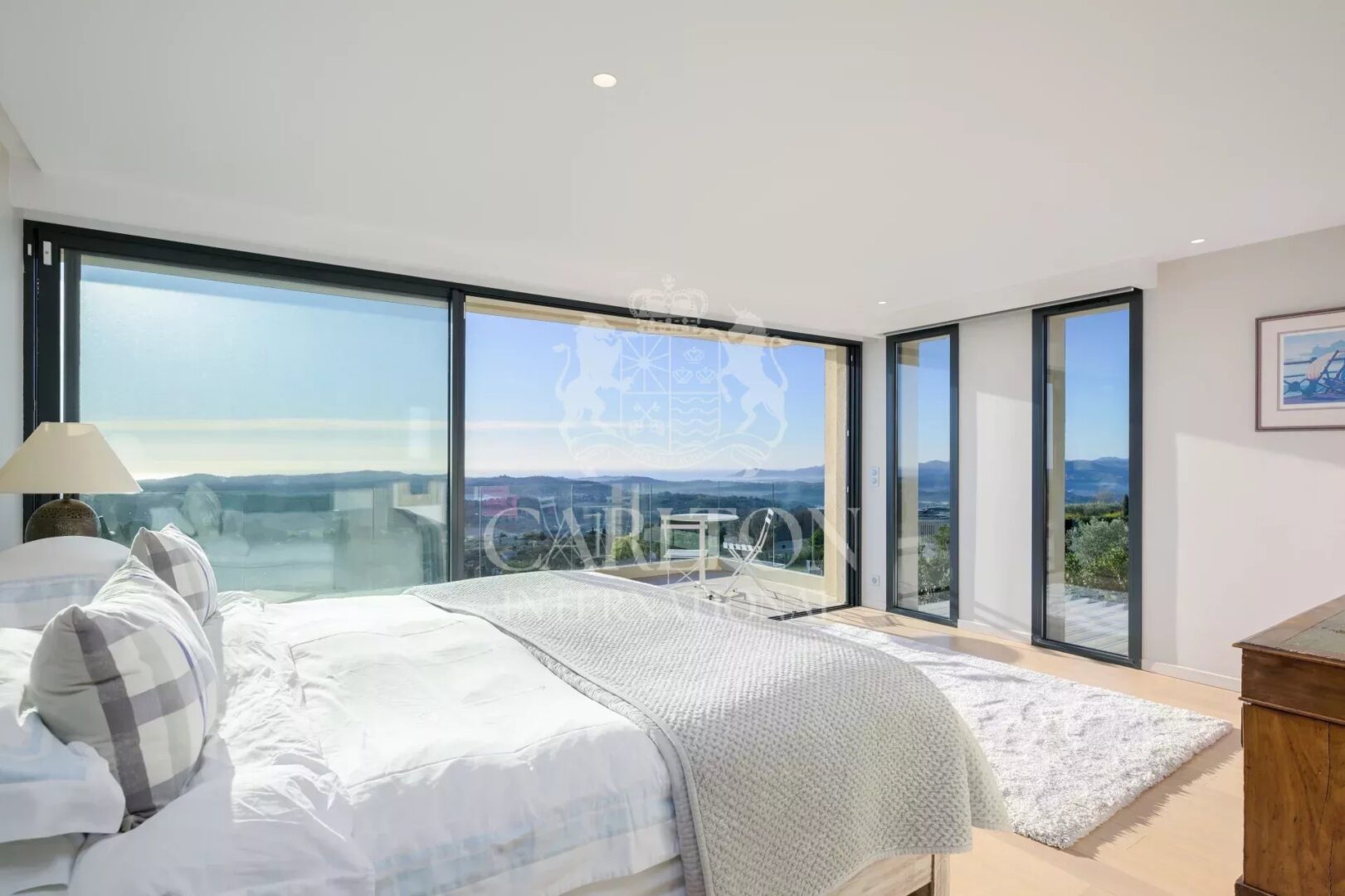 Riviera Countryside, Cannes Backcountry: Discover this stunning contemporary villa perched on a hill within a secure gated estate, offering sweeping panoramic sea views stretching from Saint-Jean Cap Ferrat to the Esterel mountains.
