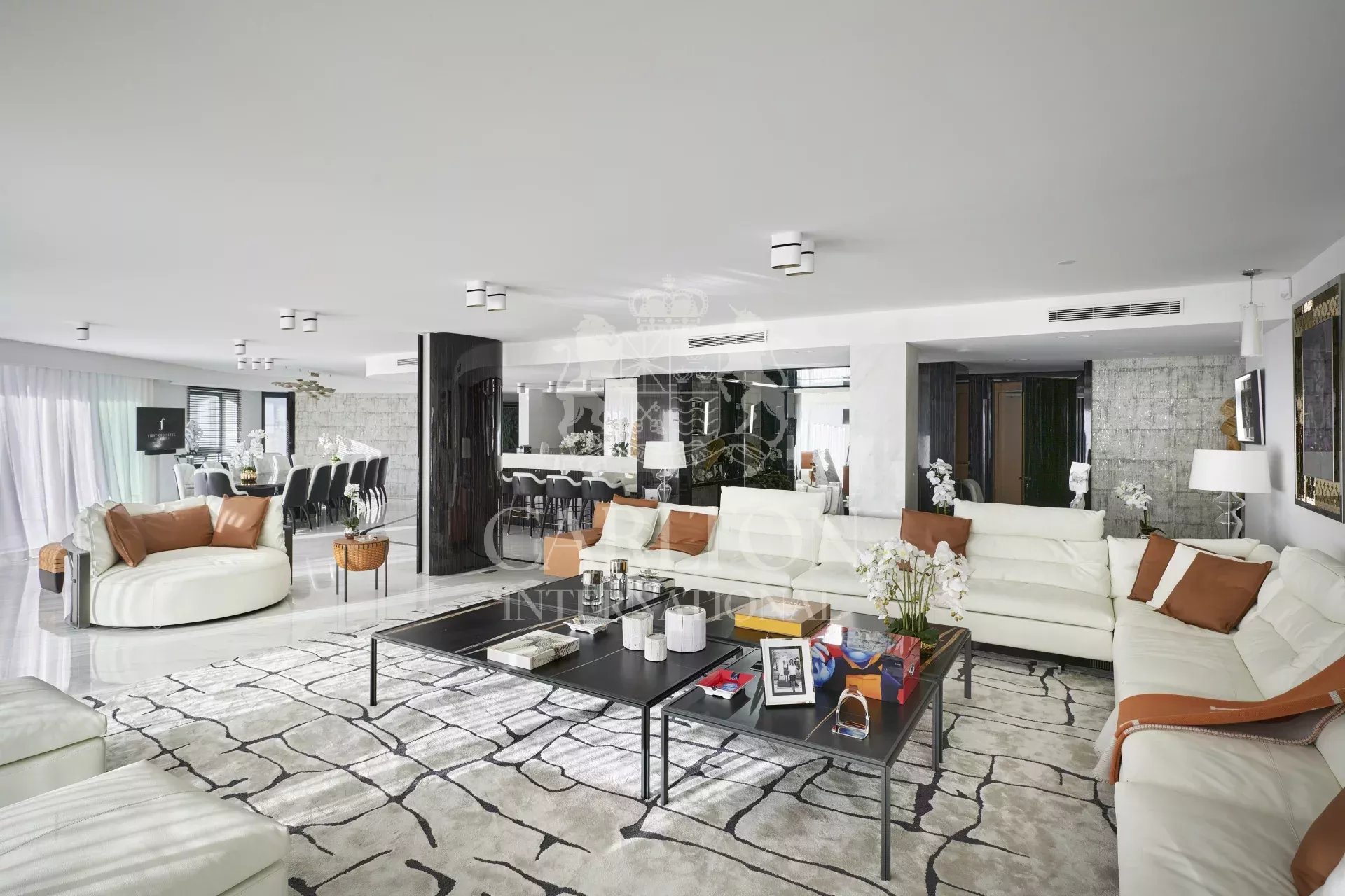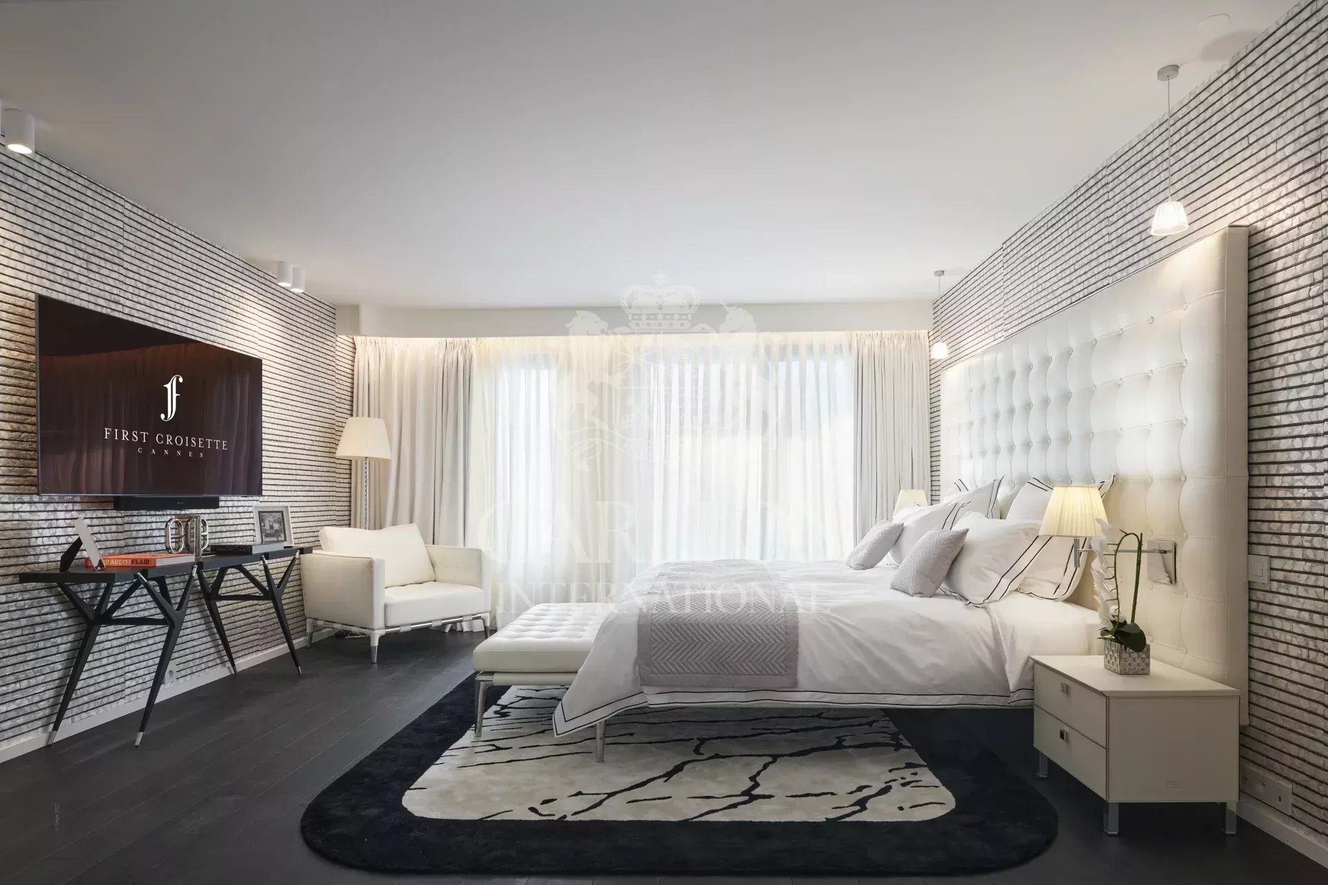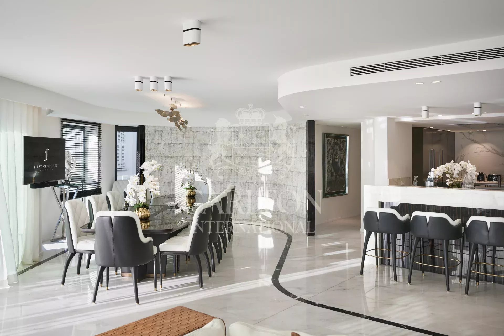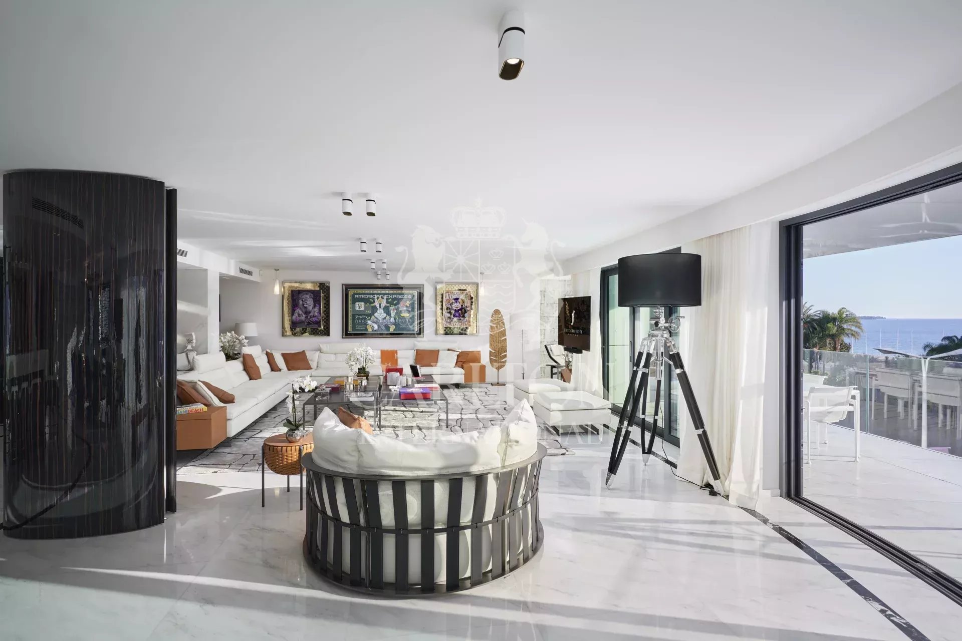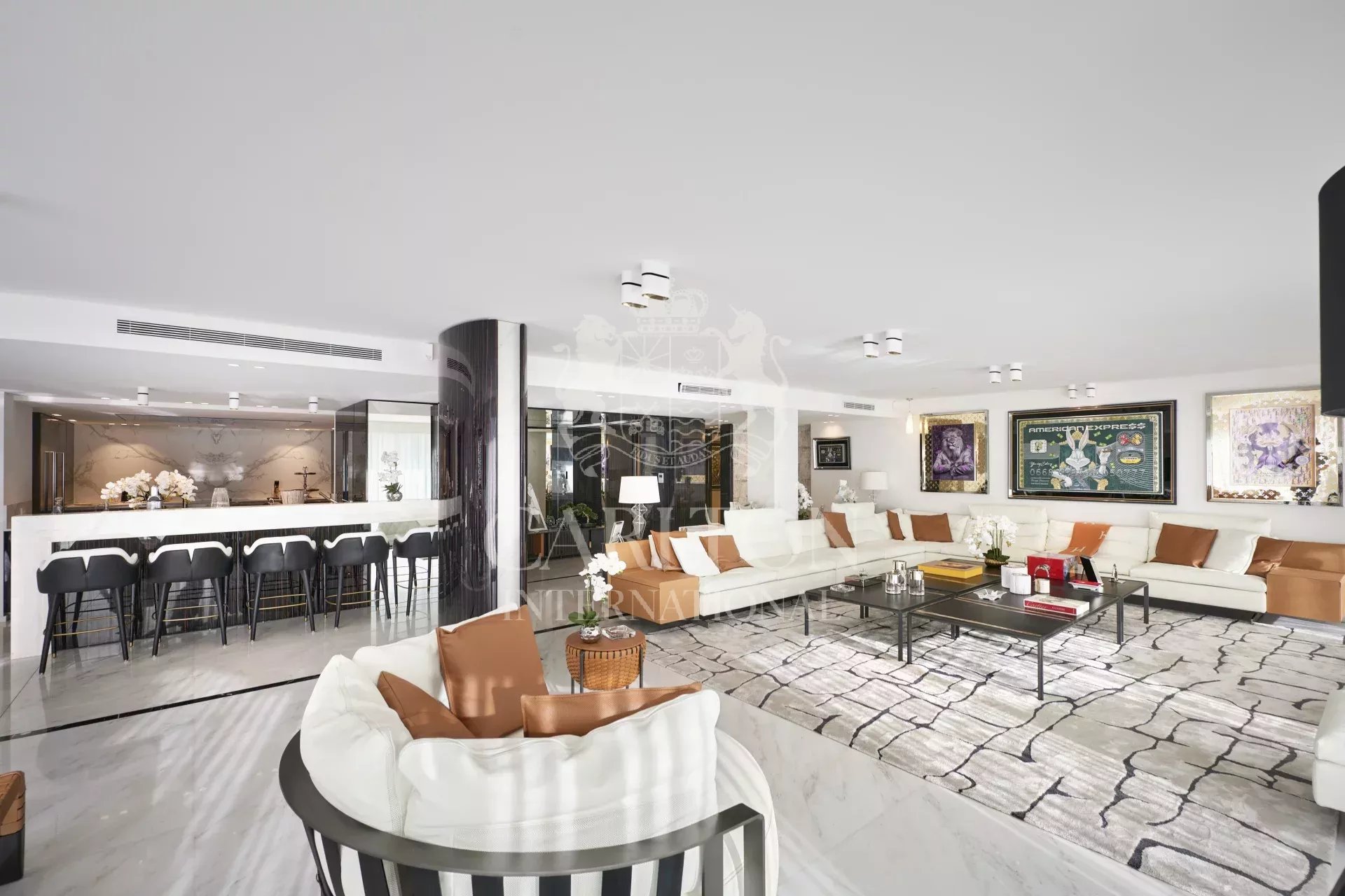 Espléndido piso de 395 m² en la 3ª planta frente al Palacio de Festivales de Cannes. Espacioso y moderno, puede alojar hasta 12 personas gracias a sus 6 habitaciones con baño, un amplio salón con acceso a la terraza de 28 m² y una cocina «Boffi» totalmente equipada con electrodomésticos «Gaggeneau».